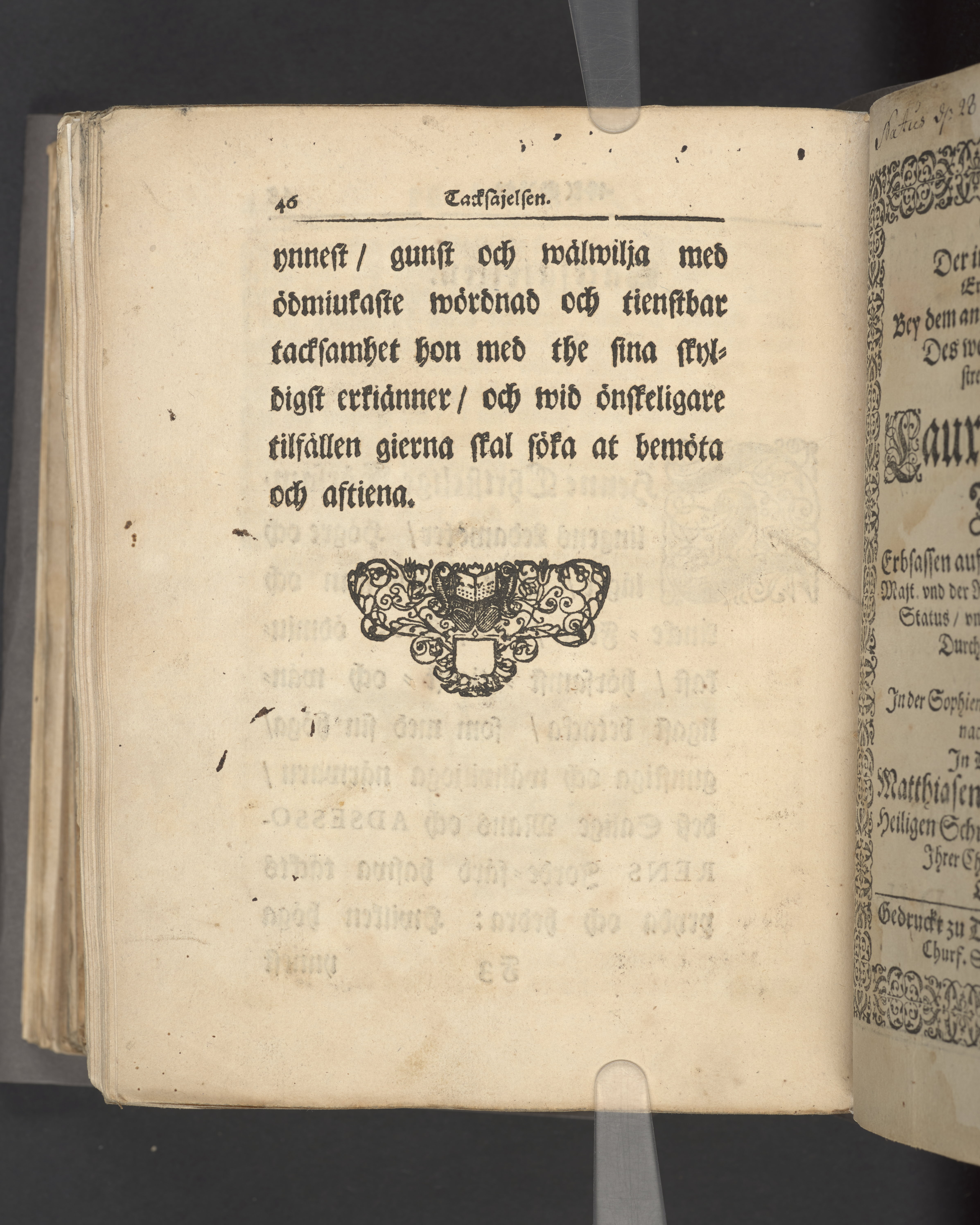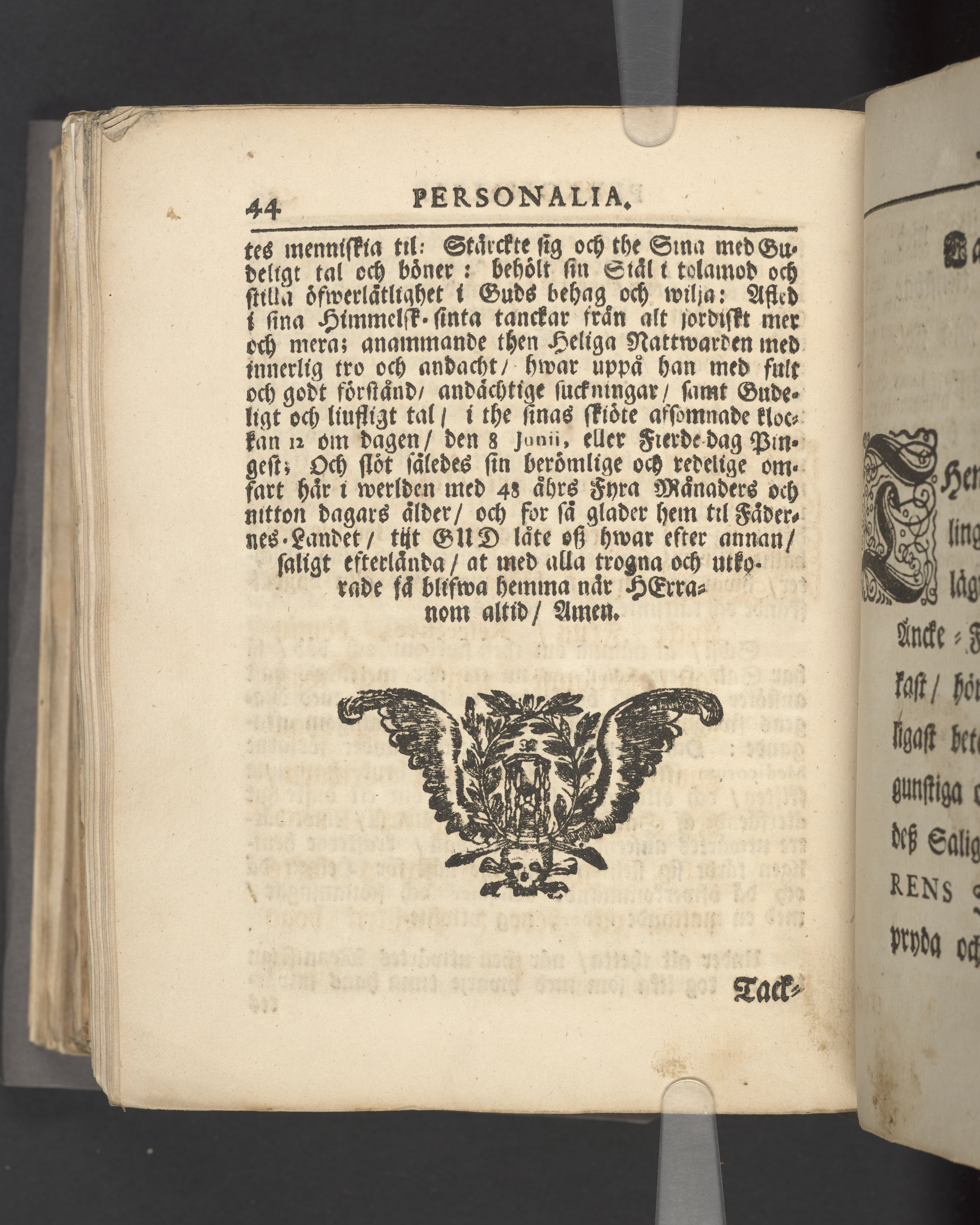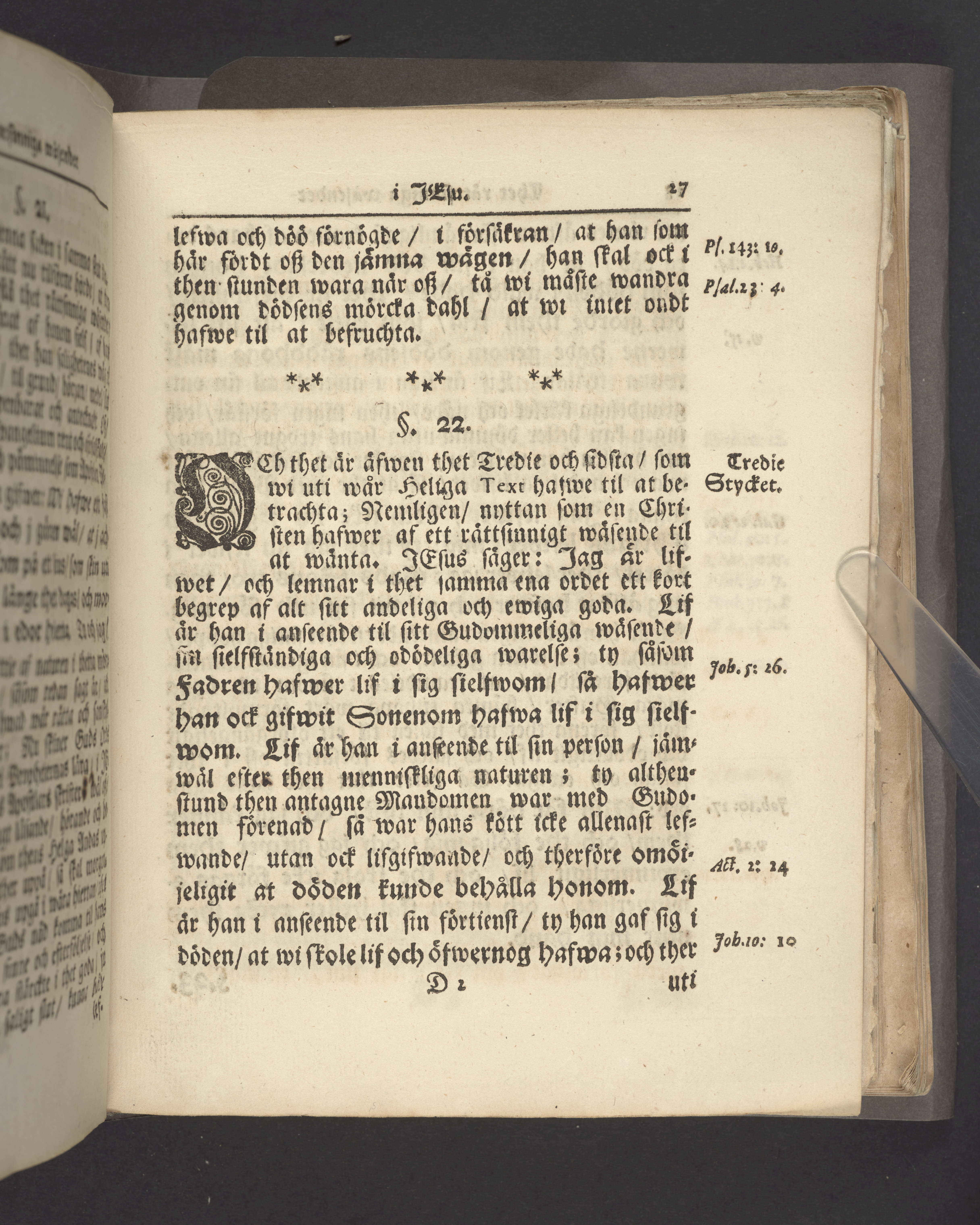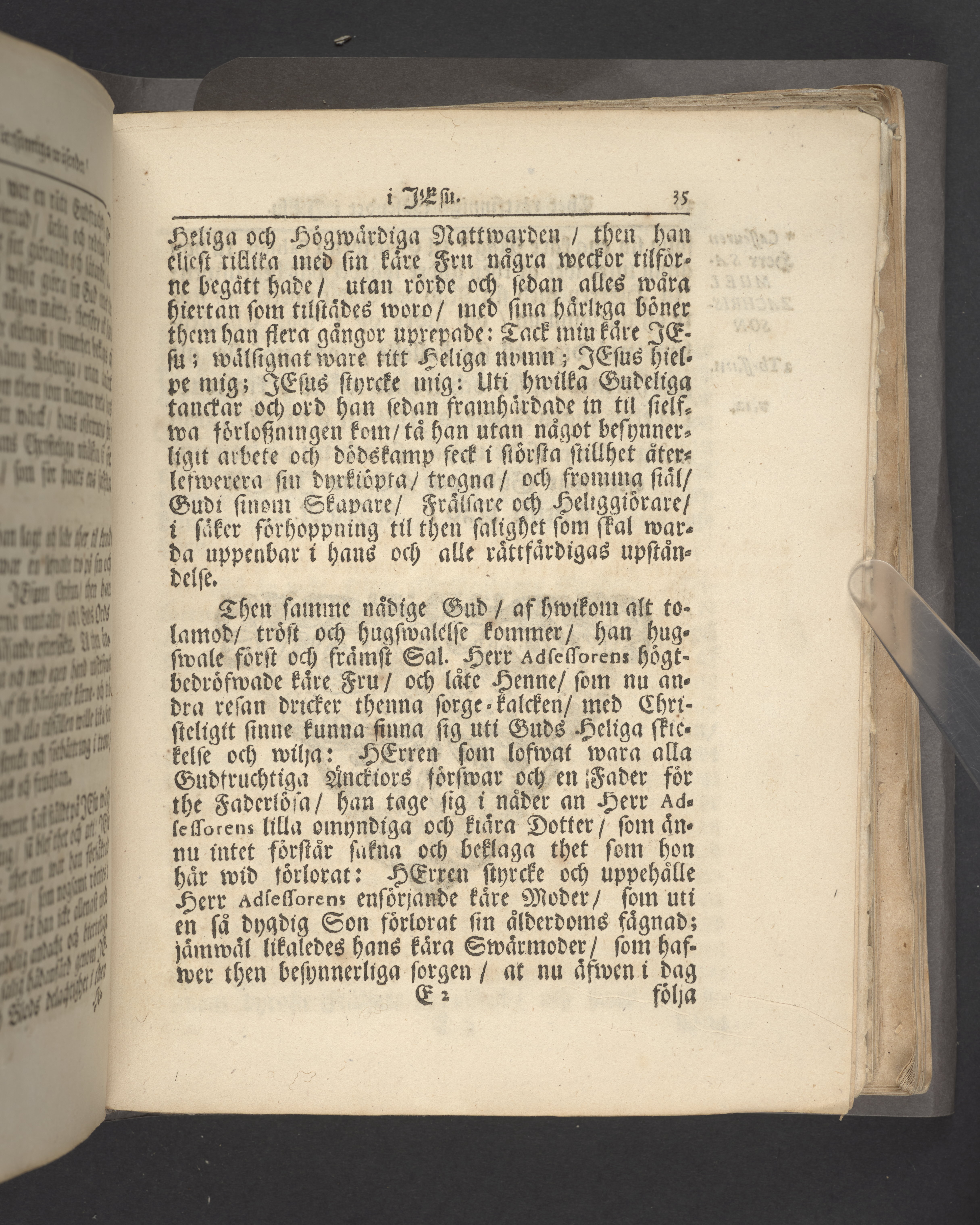 Färgat övre snitt. Högst upp på titelsidan anteckning i bläck uppgifter om födelse- och dödsdatum för den avlidna.