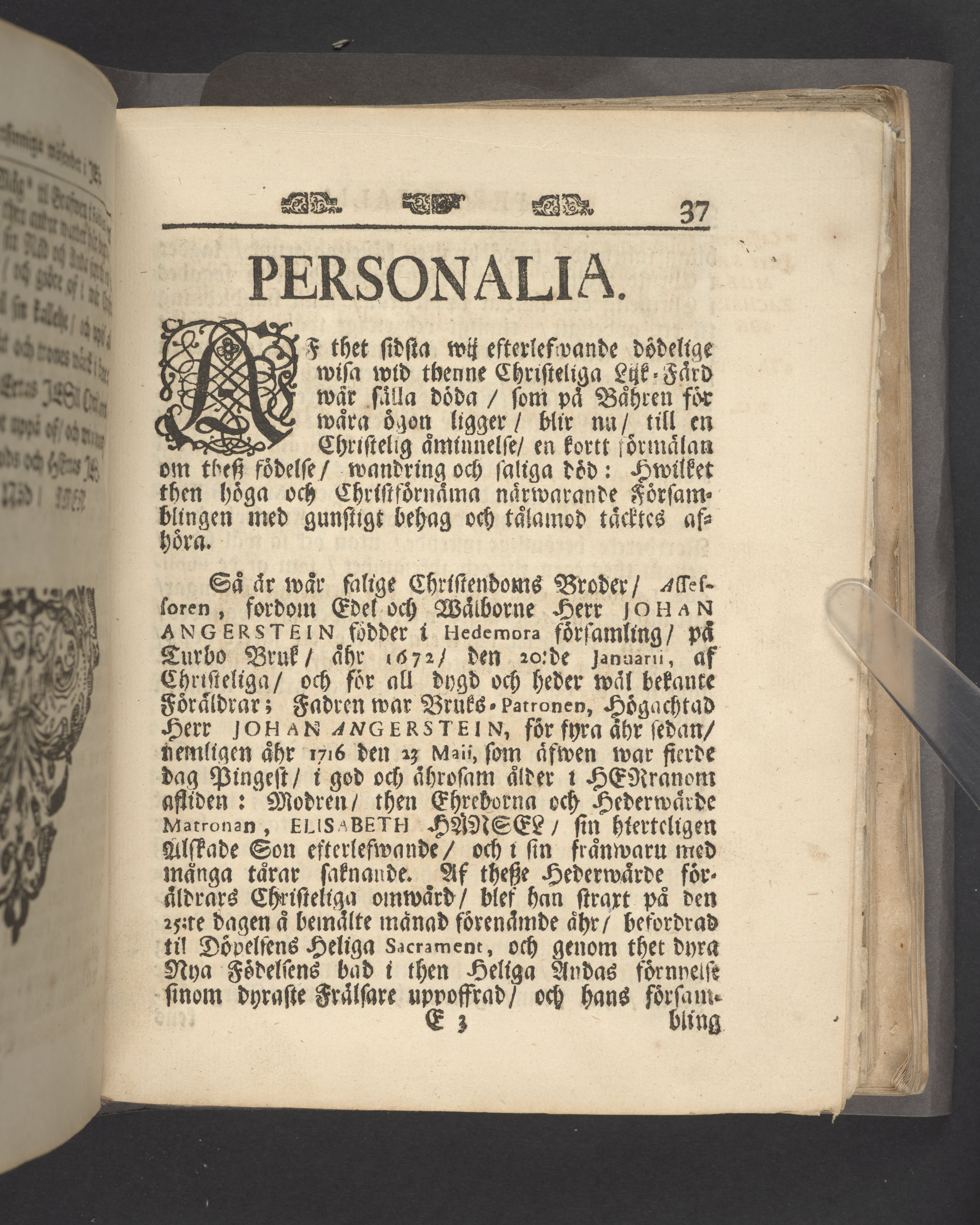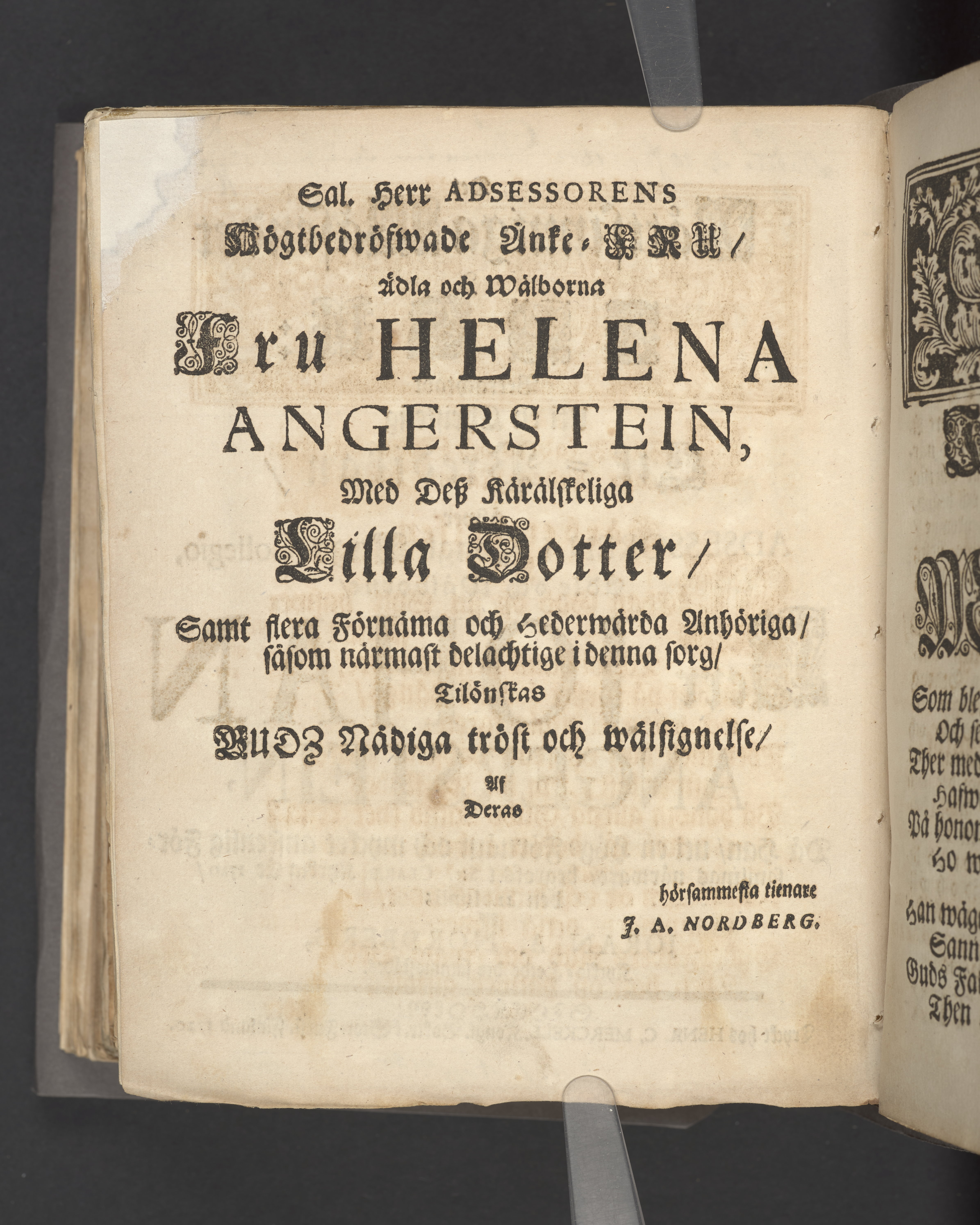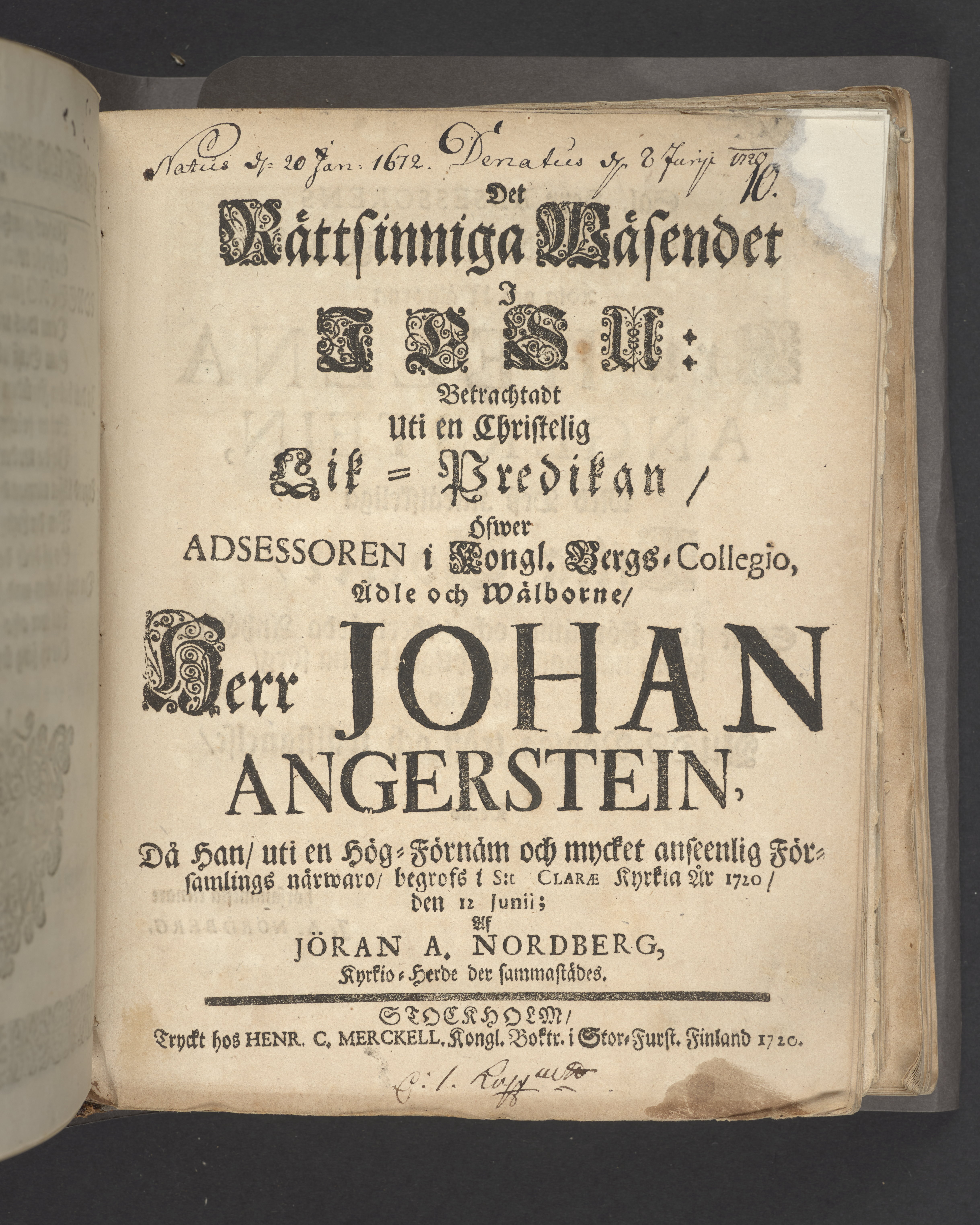 Det Rättsinniga Wäsendet i Jesu: Betrachtadt uti en Christelig Lik-Predkan/ öfwer Adsessoren [sic] i Kongl. Bergs-Collegio, ädle och wälborne/ Herr Johan Angerstein, då han/ uti en Hög-Förnäm och mycket anseenlig Församlings närwaro/ begrofs i S:t Clarae Kyrkia år 1720/ den 12 Junii; Af Jöran A. Nordberg, Kyrkio-Herde der sammanstädes. Stockholm/ Tryckt hos Henr. C. Merckell, Kongl. Boktr. i Stor-Furst. Finland 1720.
