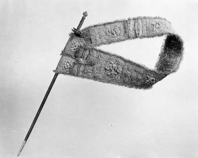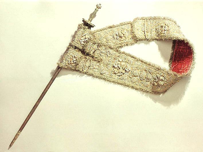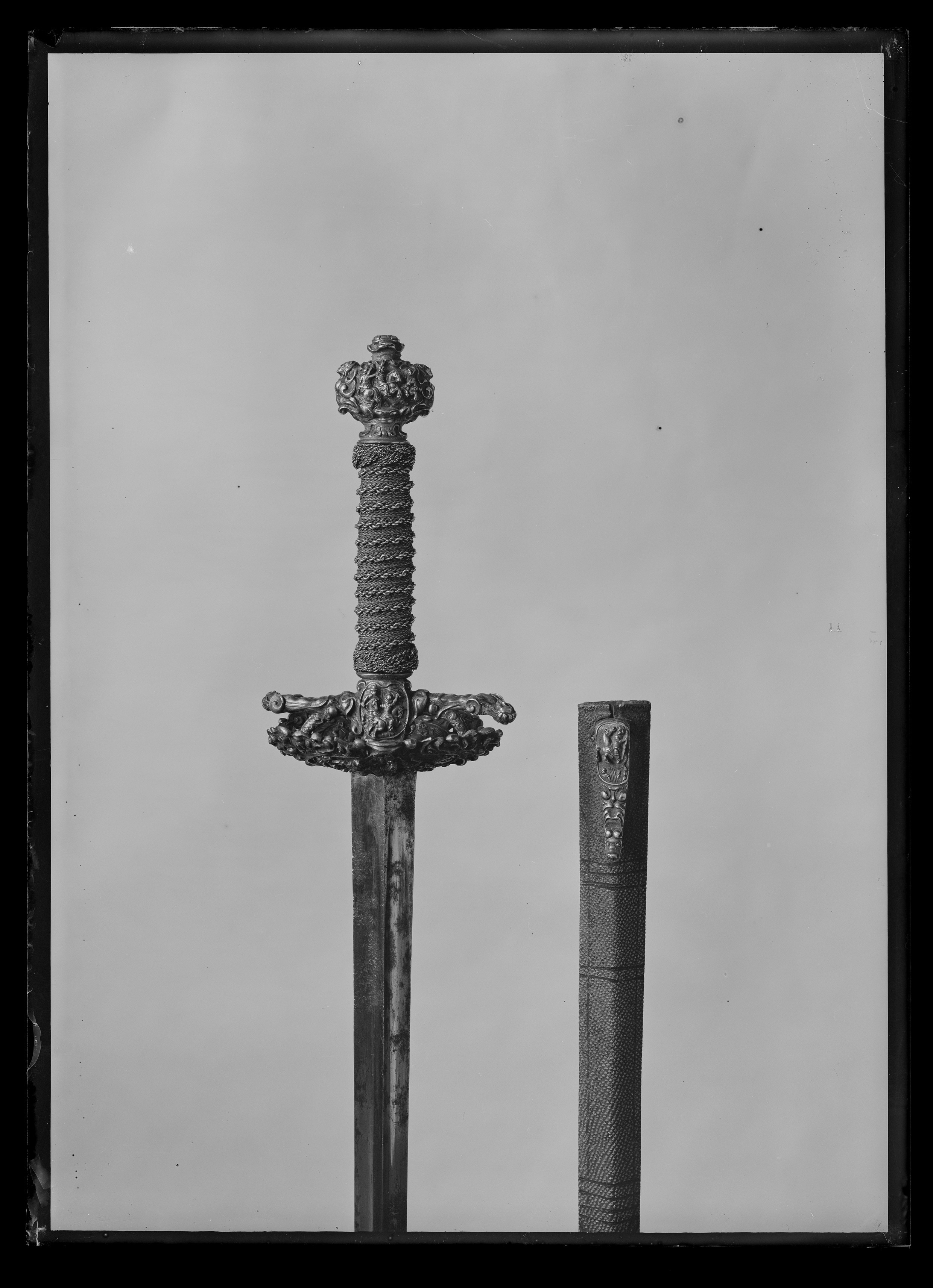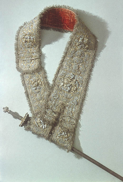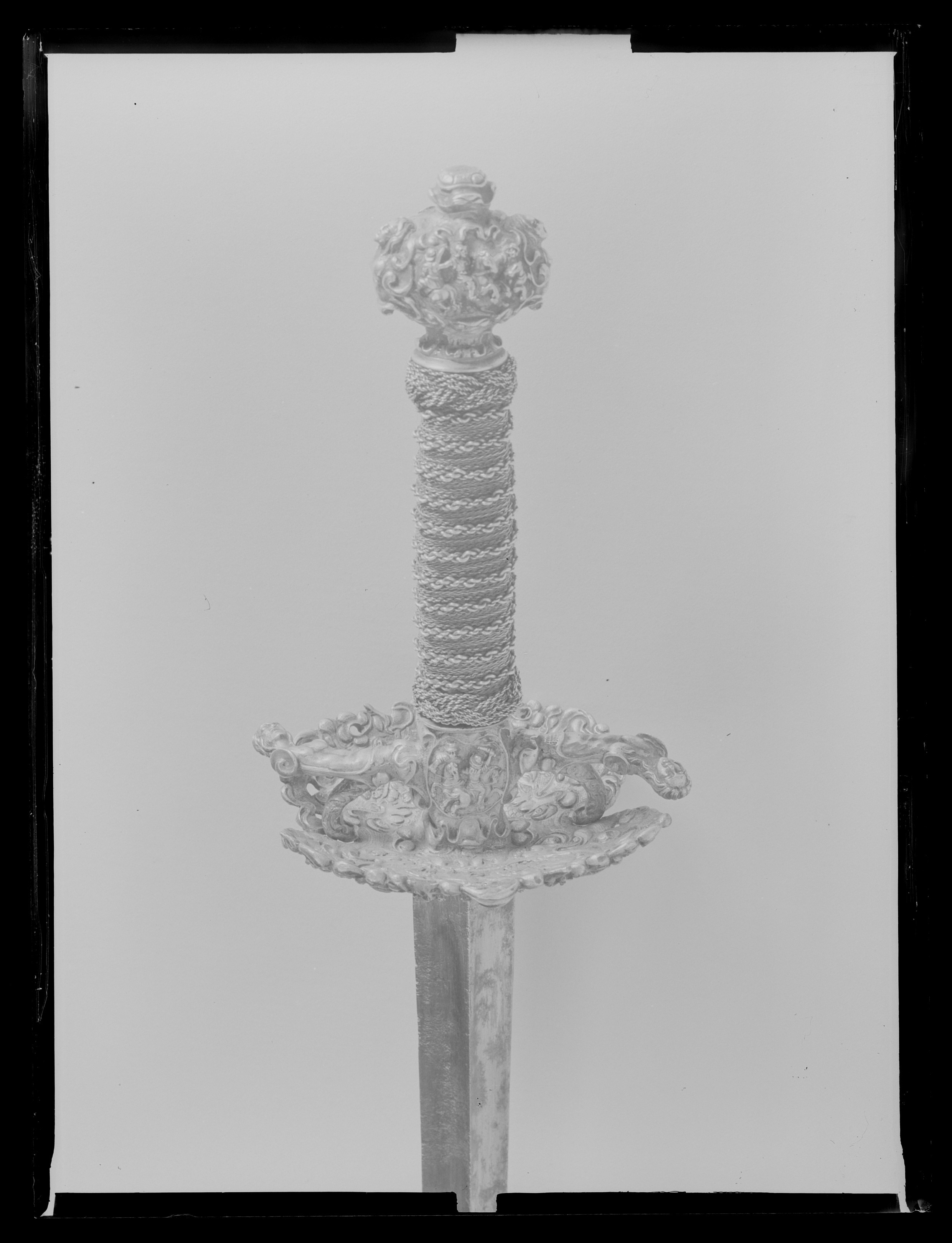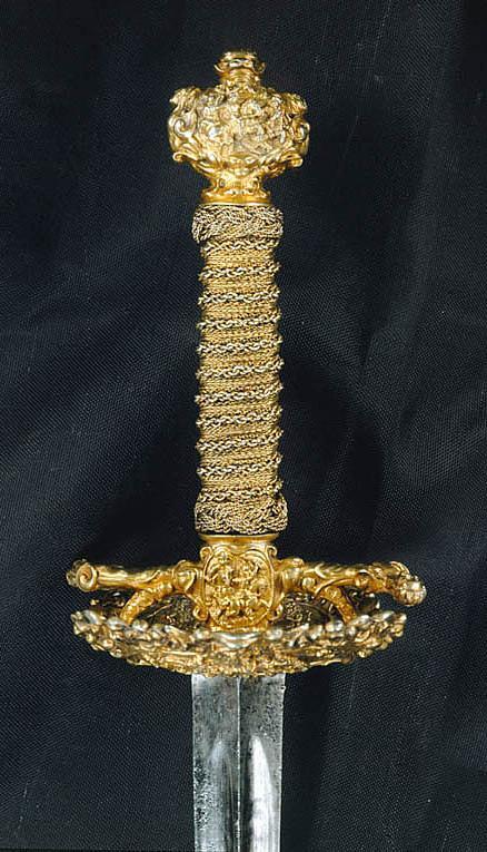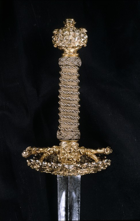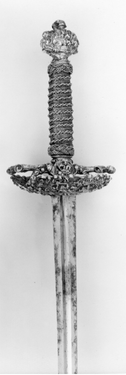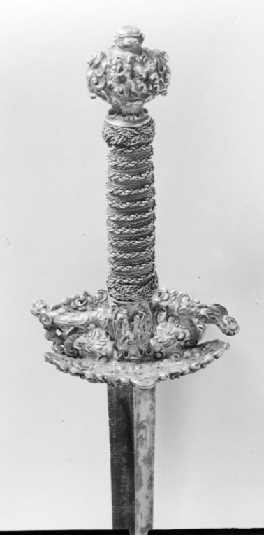 Fäste av gjutet och förgyllt silver, uppbyggt utan handbygel. Ornering över hela ytan i snidad och punsad, hög relief. Knapp oregelbundet bred. Främre och bakre parerstång, den bakre utåt. Fingerbyglar tämligen låga. Parerplåtar kupiga, den yttre något större. Orneringen bestående av scener med ryttarstrider på knappens ut- och insida samt på båda parerplåtarnas ut- och insidor. På ut- och insidan av krysset inom en smal oval ram likaledes ryttarstrider, vardera med endast två figurer. Scenerierna i övrigt omgivna av broskartade ornament, de på parerplåtarna delvis genombrutna. Parerstängerna utformade som smala kvinnofigurer. Kavellindning av tvinnad, tunn, förgylld silvertråd och förgylld mässingstråd, omväxlande med åtta varv tvinnad, grövre silvertråd. Upptill och nedtill en flätad krans av tvinnad silvertråd. Klinga rak, tvåeggad, s. k. stukatklinga, ornering saknas. Yttersta udden av spetsen avbruten.