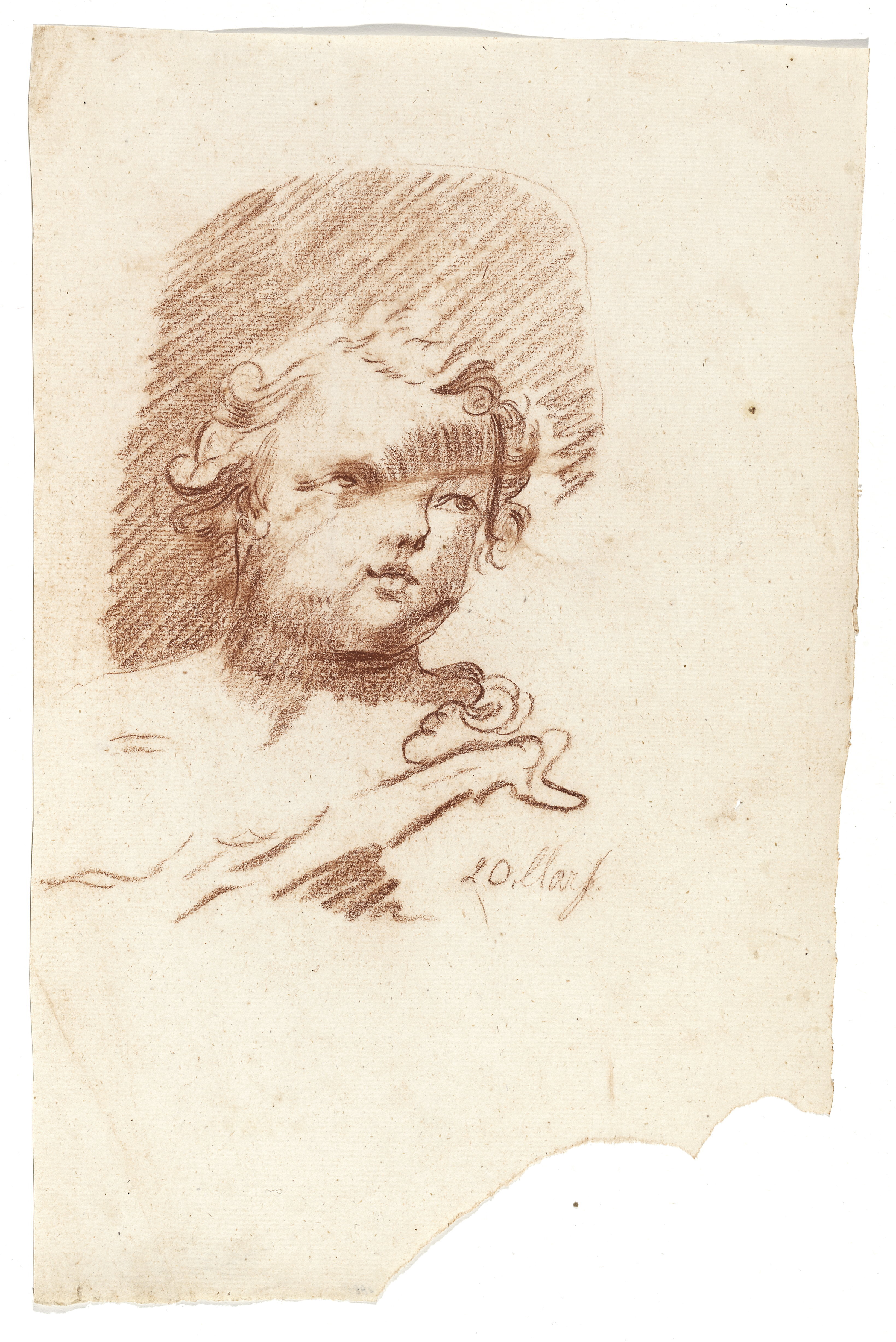 Ritstudie föreställande kerubansikte. Rödkrita på papper.