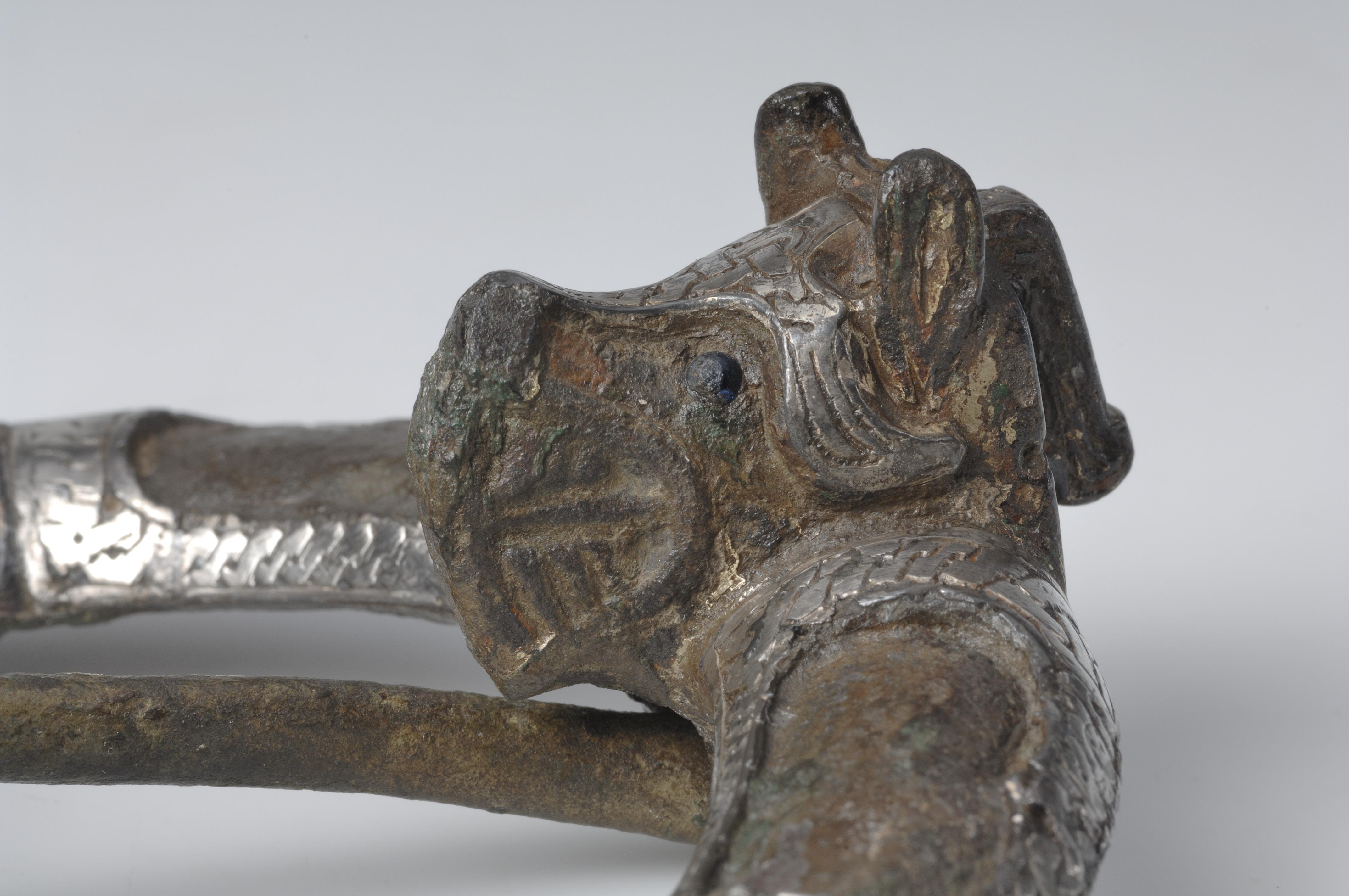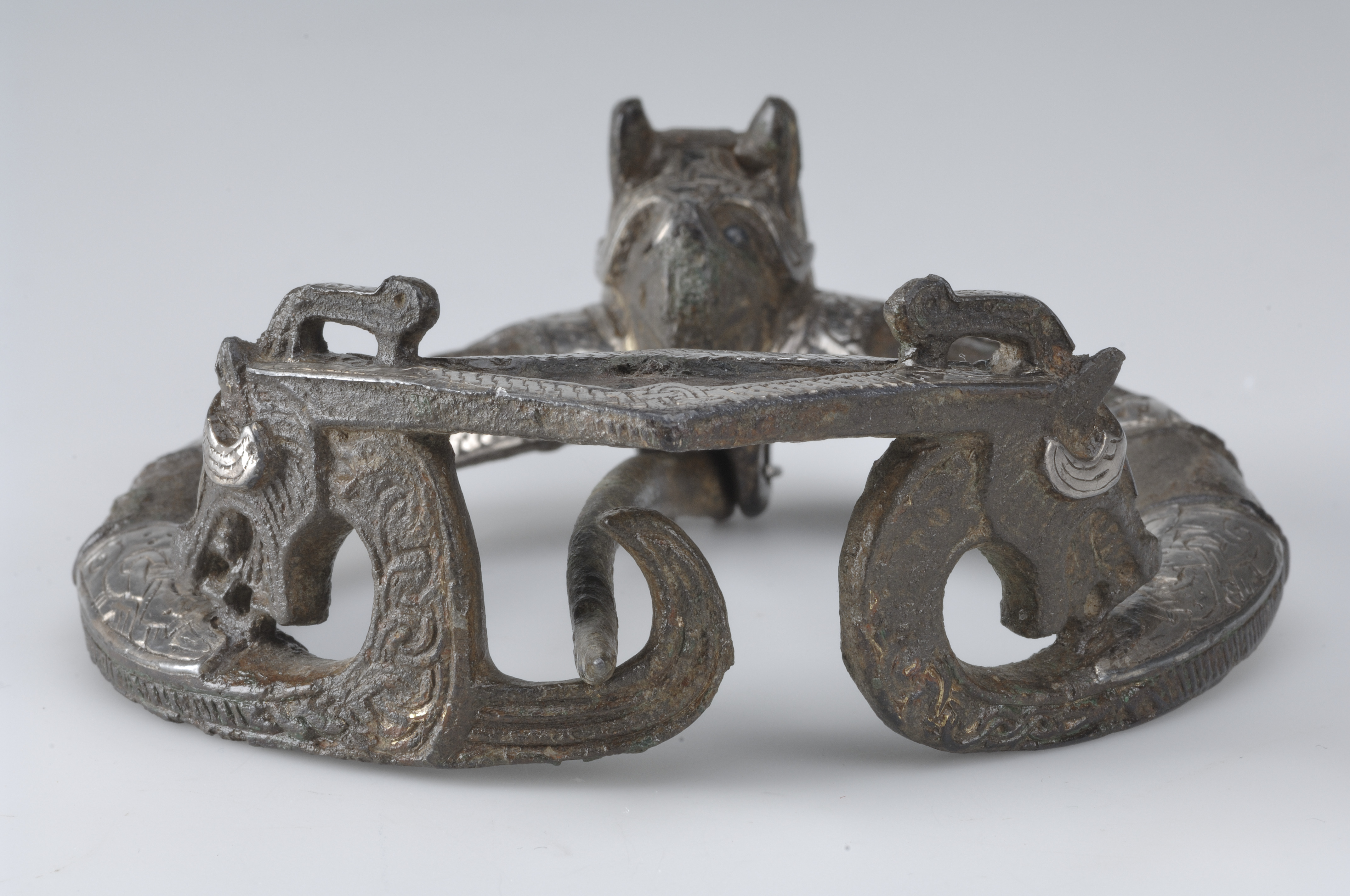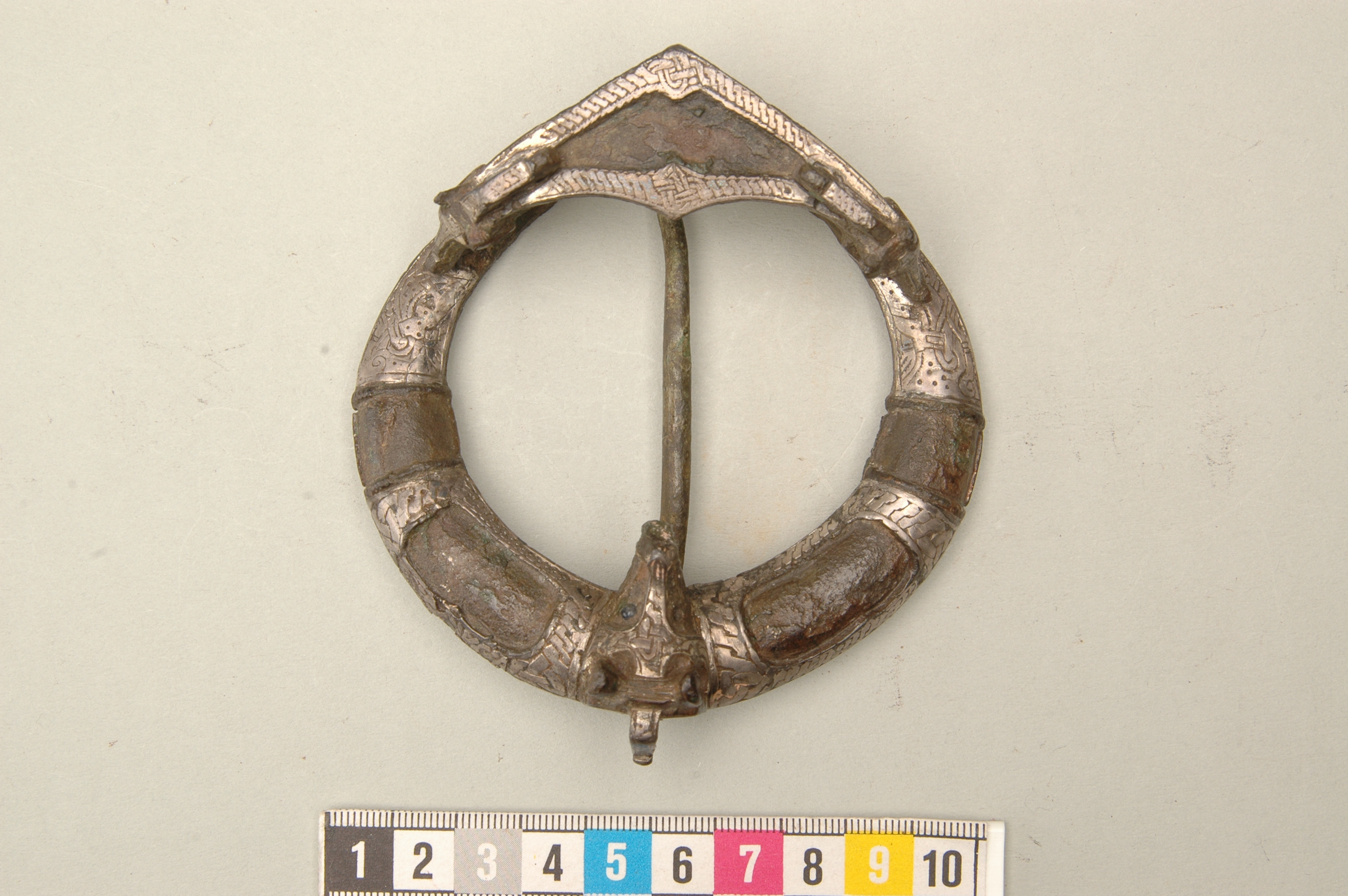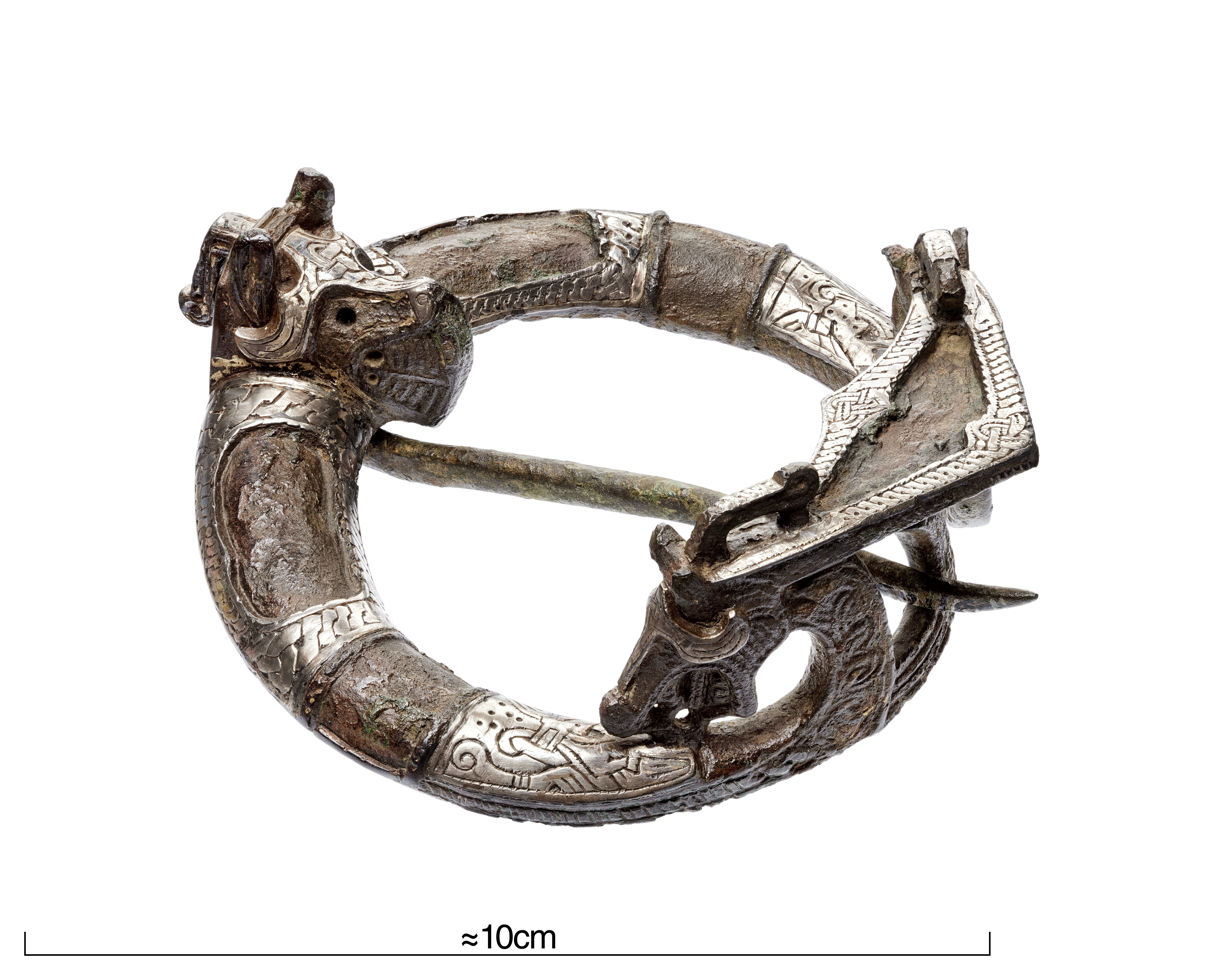 Ringspänne av brons och silver. Djurhuvudets ena öga är av blått glas, det andra har fallit bort.
