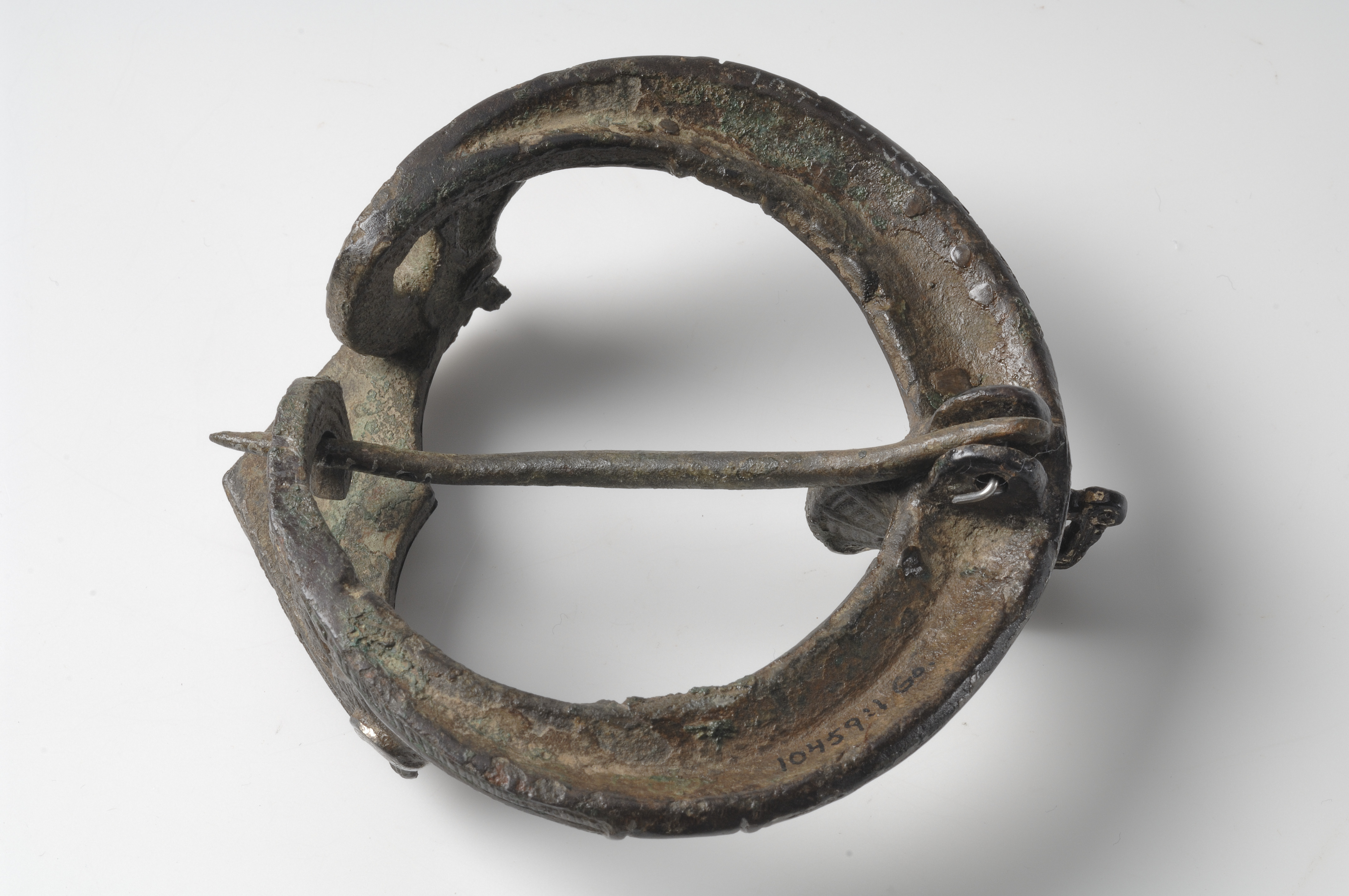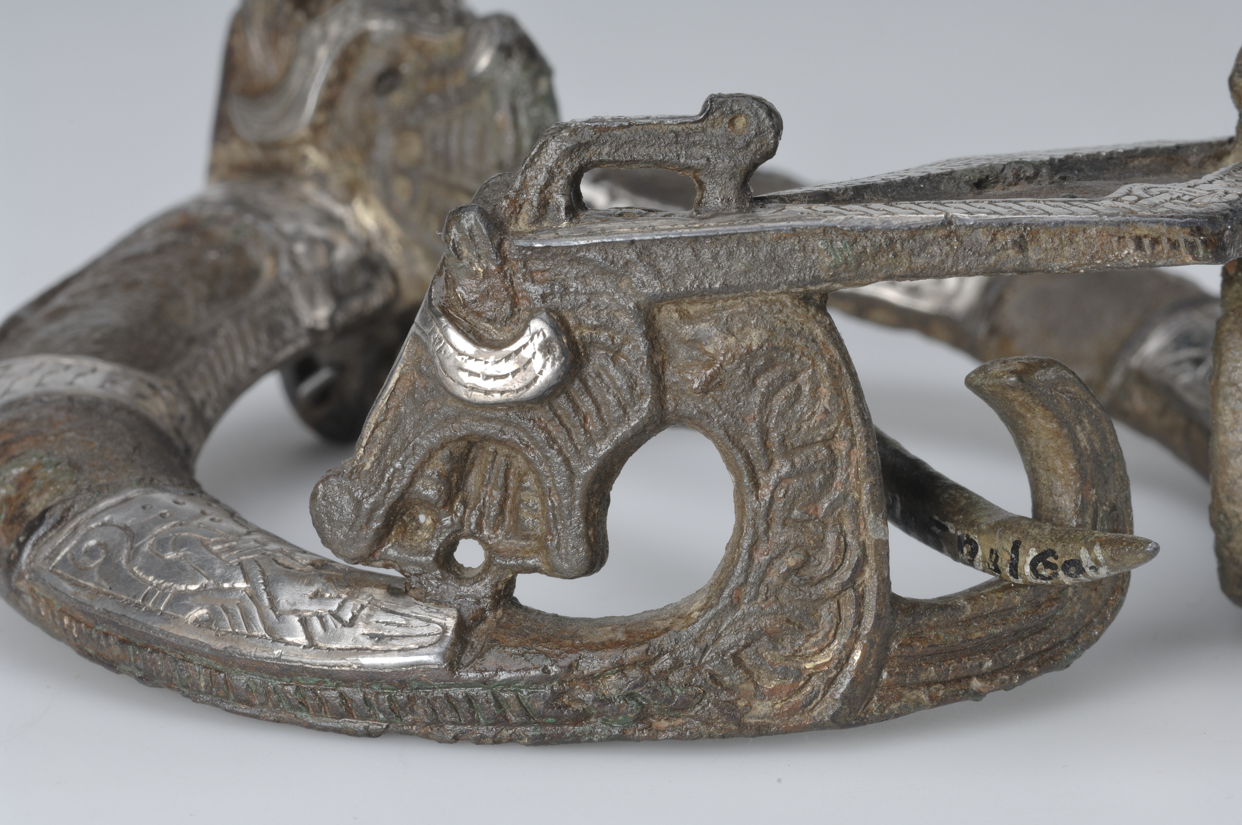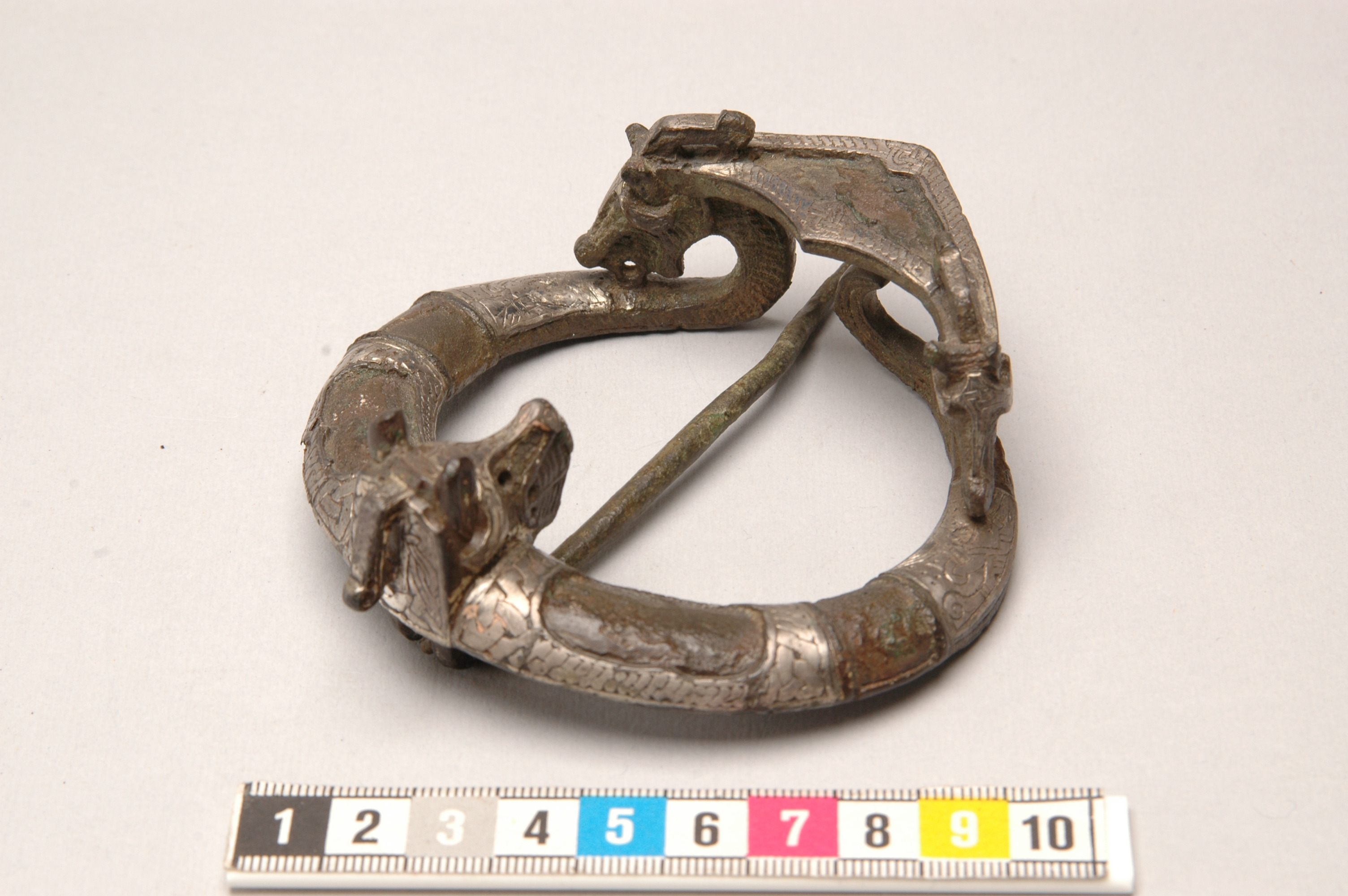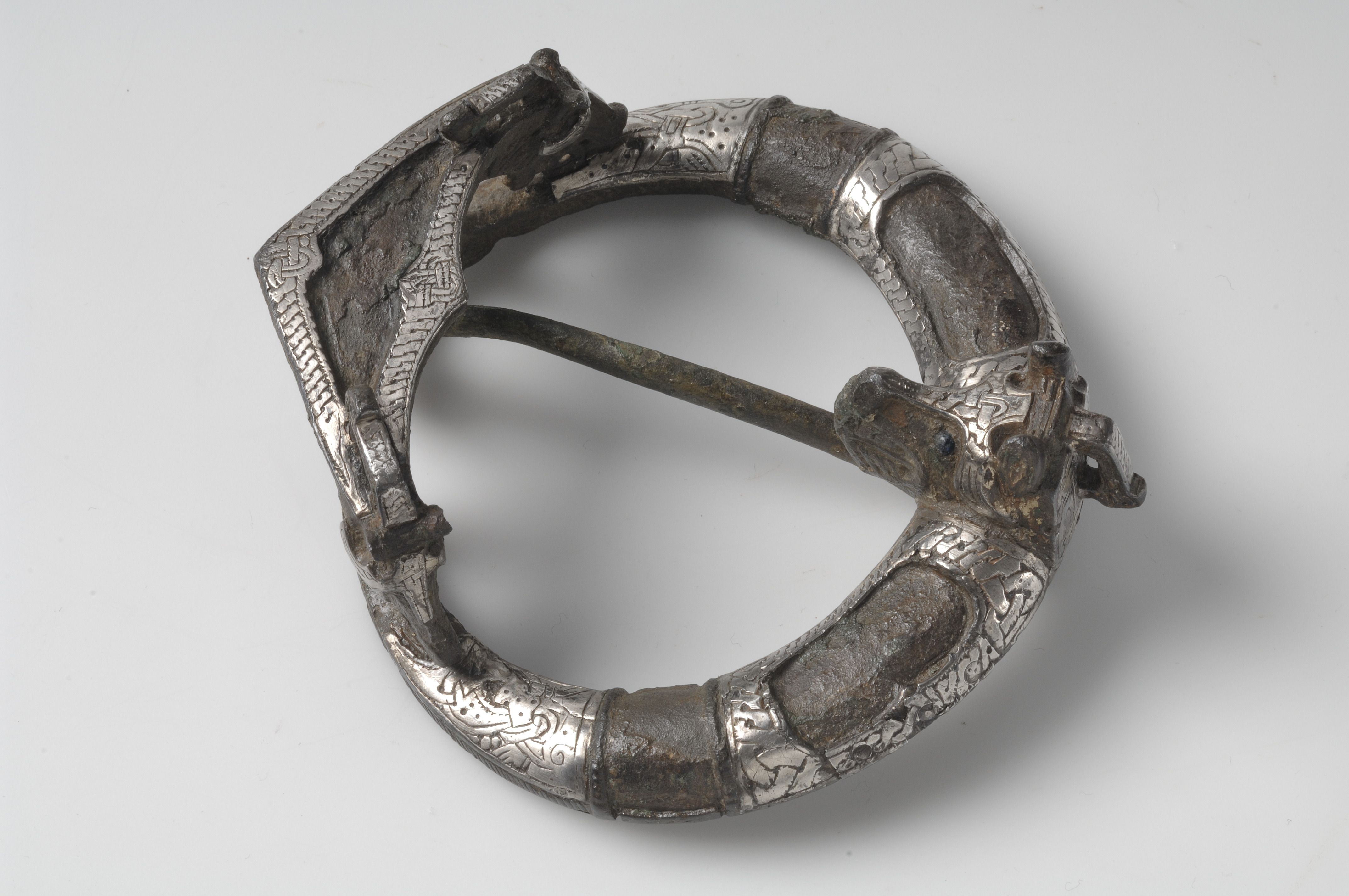 Ringspänne av brons och silver. Djurhuvudets ena öga är av blått glas, det andra har fallit bort.
