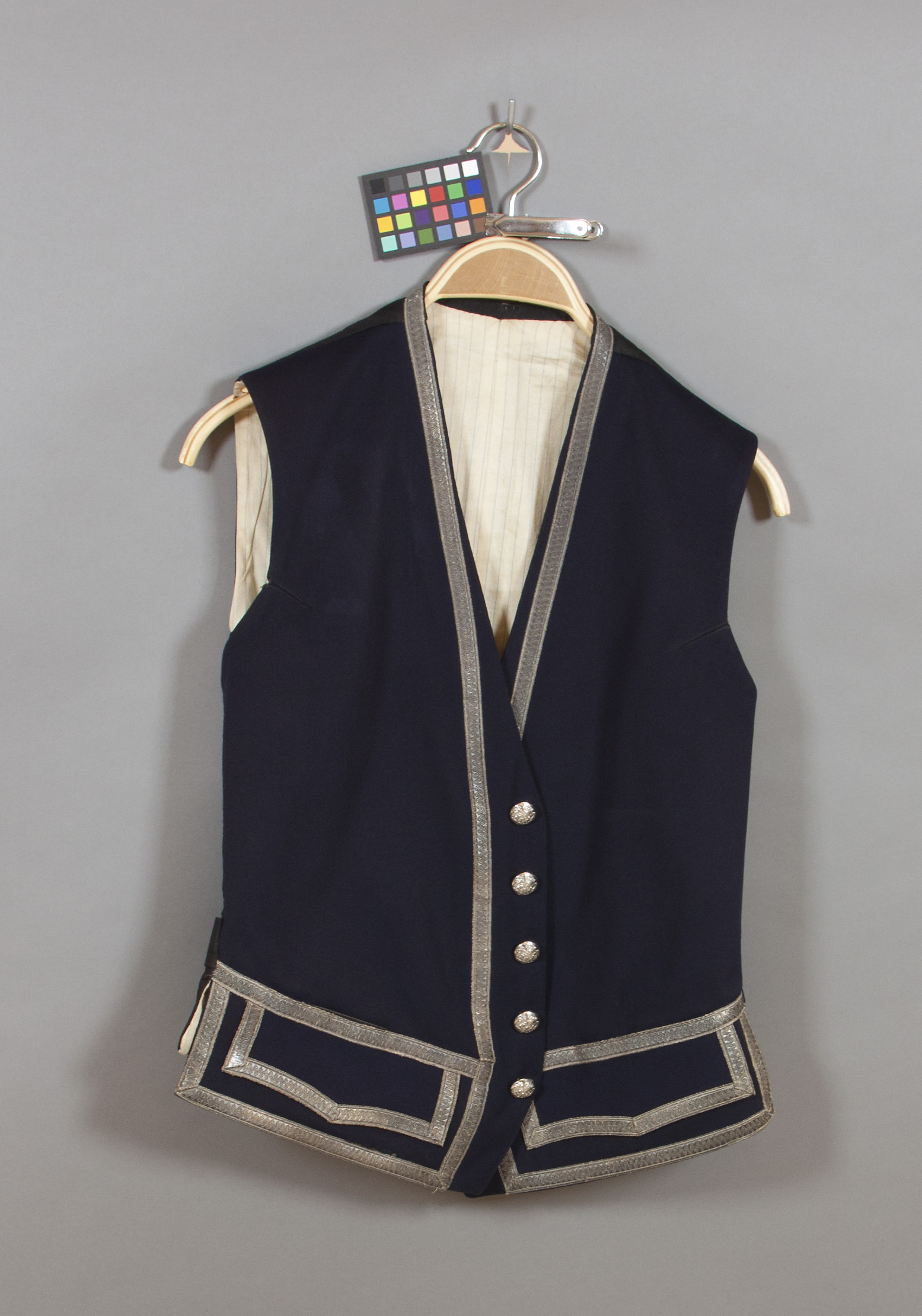 Väst utan slag, enkelradig med fem knappar, Framstycken av mörkblått kläde, sprund i sidsömmarna, l: på framstycket 80 mm, på bakstycket 50 mm. I ärmhålen figurveck, l: 35 mm. Påsydda silvergaloner, b: 13 mm, längs kanterna innanför knapp- och knapphålsrad, runt halsen samt längs nederkanterna och i midjan. Innanför galonen i midjan två fickor, foder av grå bomullskypert. Falska ficklock, l: 160 mm, h: 70 mm med liten spets nertill på mitten, kantning av silvergalonen. Fem välvda, försilvrade knappar, d: 19,1 mm med stora riksvapnet efter 1905, på baksidan stämplat: " C. C. SPORRONG & CO STOCKHOLM ". Bakstycke av svart bomullskypert med mittsöm och sprund nertill, l: 60 mm. I nederkanten två kilar, 30 mm från sidsömmarna. Spänntampar av samma tyg, b: ca 30 mm svartlackerat stålspänne, märkt: SOLIDE. Foder av vit satäng med smala blå ränder.