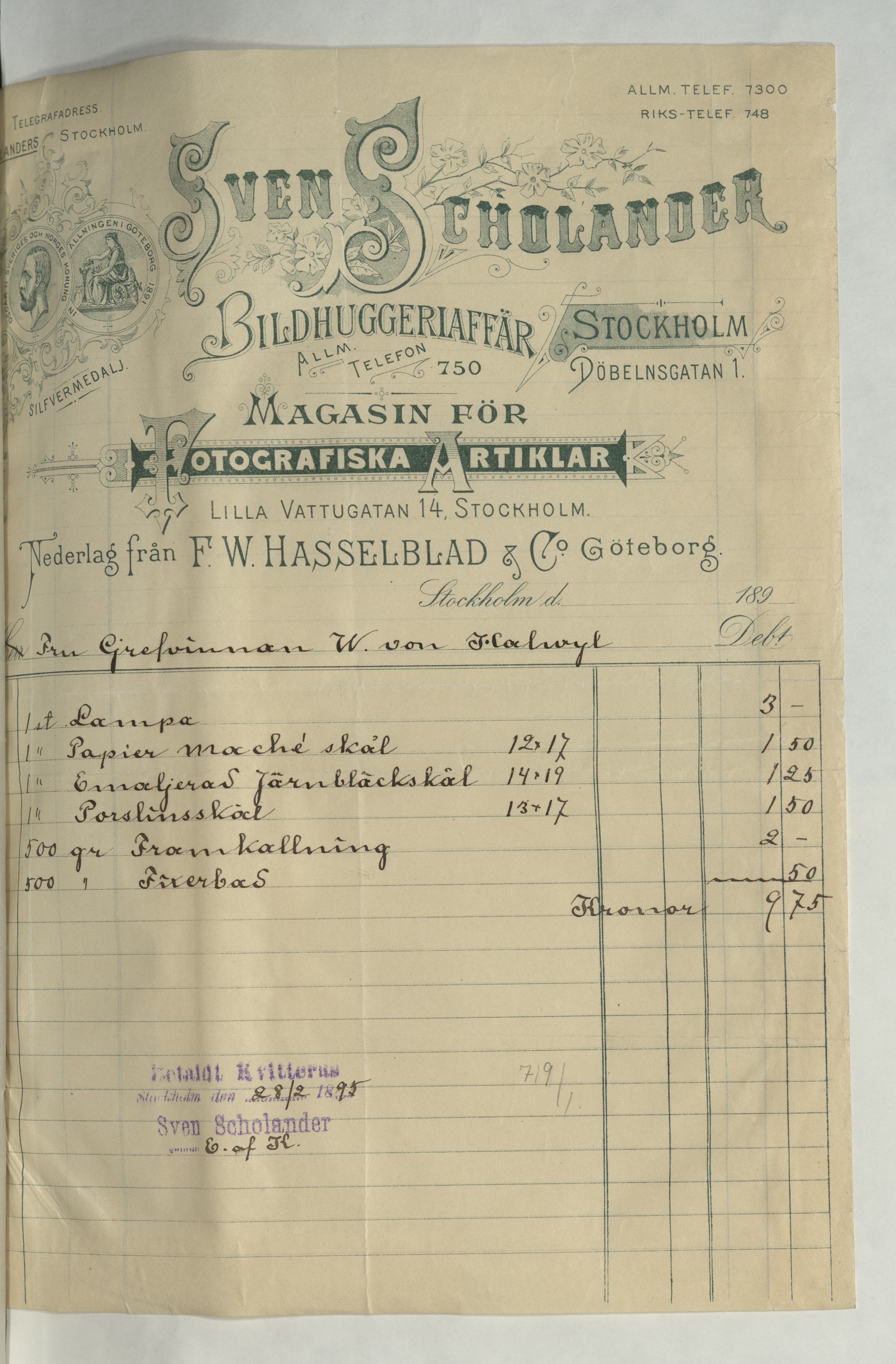 Kvitto från Sven Scholander, Bildhuggeriaffär för fotografiska artiklar till Grevinnan von Hallwyl. 9:75Kr betalt, Stockholm 28 februari 1895.