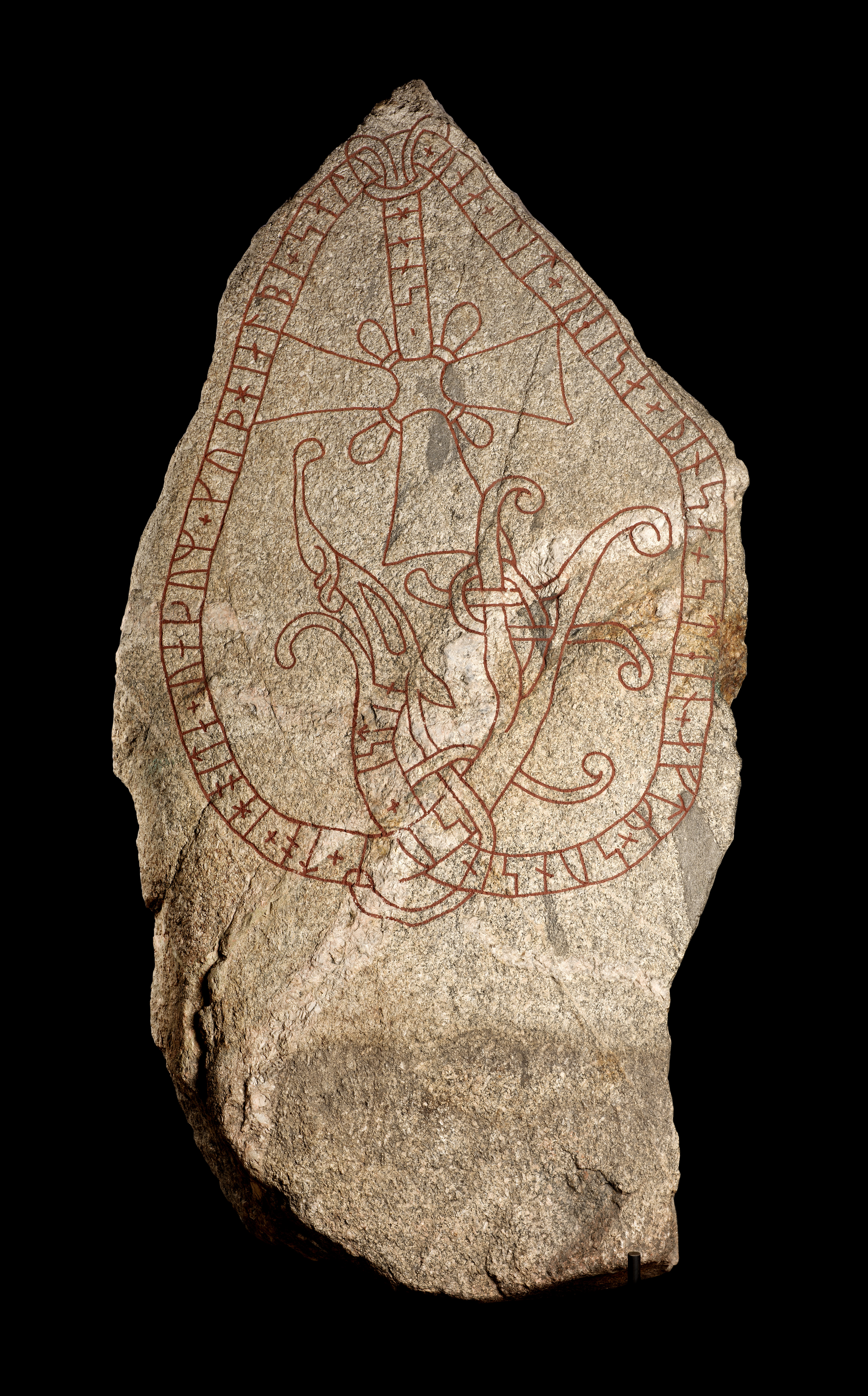 Runor: una + lit + reisa + þinsa + stein + aftR + sun sin + istin sum + to + i hoita+uaþum + kuþ hialbi + salu hans (Una/Unna let ræisa þennsa stæin æftiʀ sun sinn Øystæin/Æistæin, sum do i hvitavaðum. Guð hialpi salu hans.)