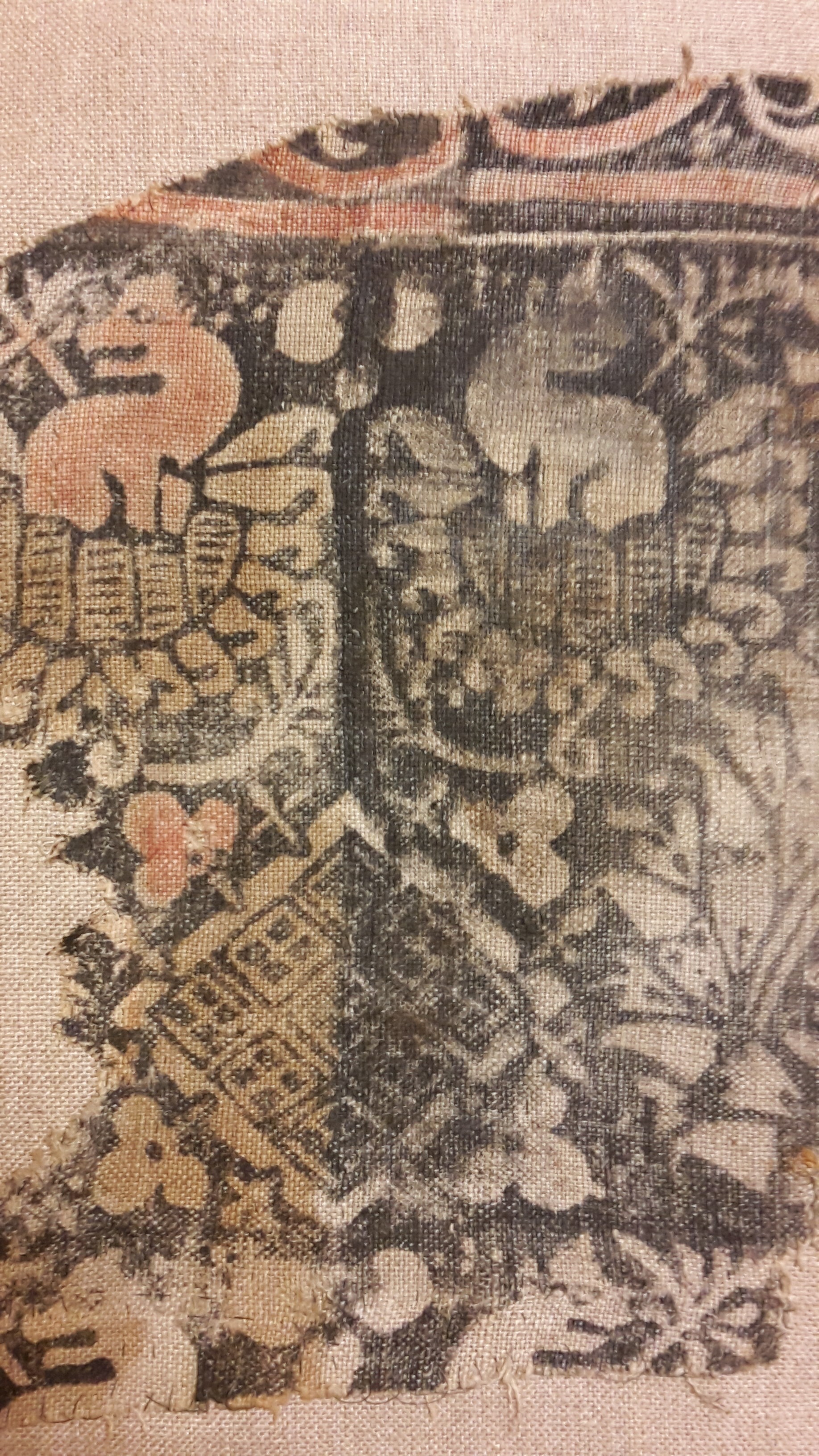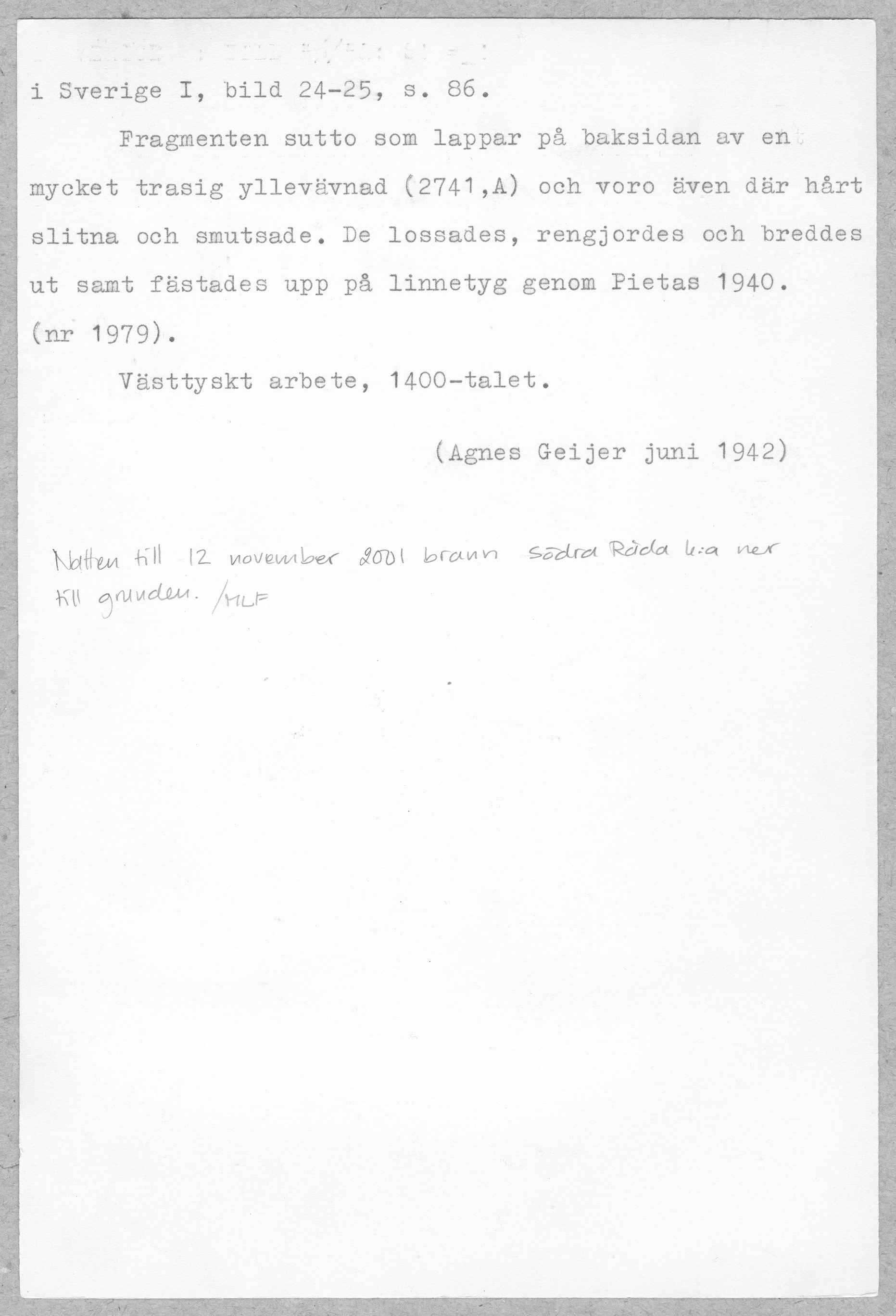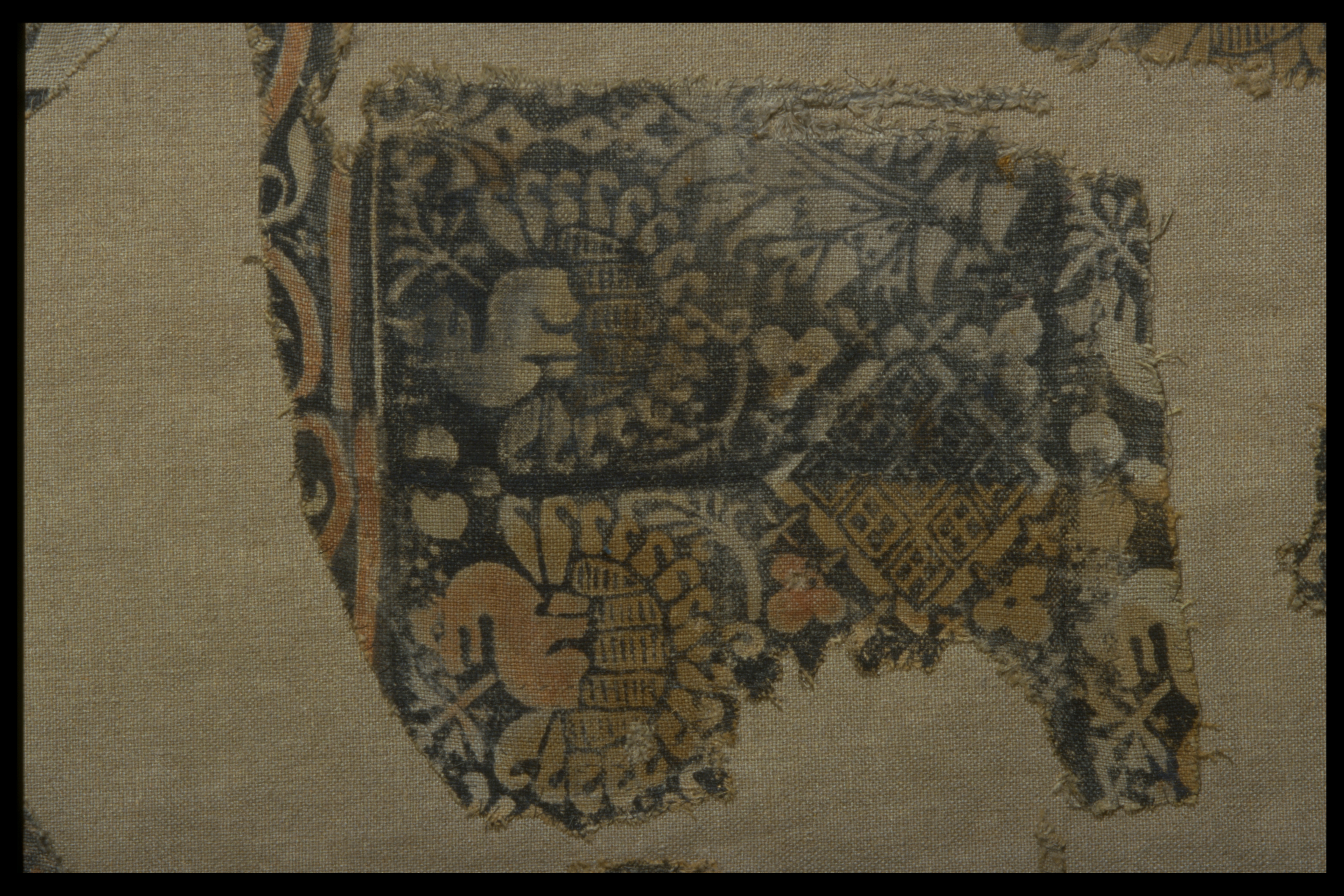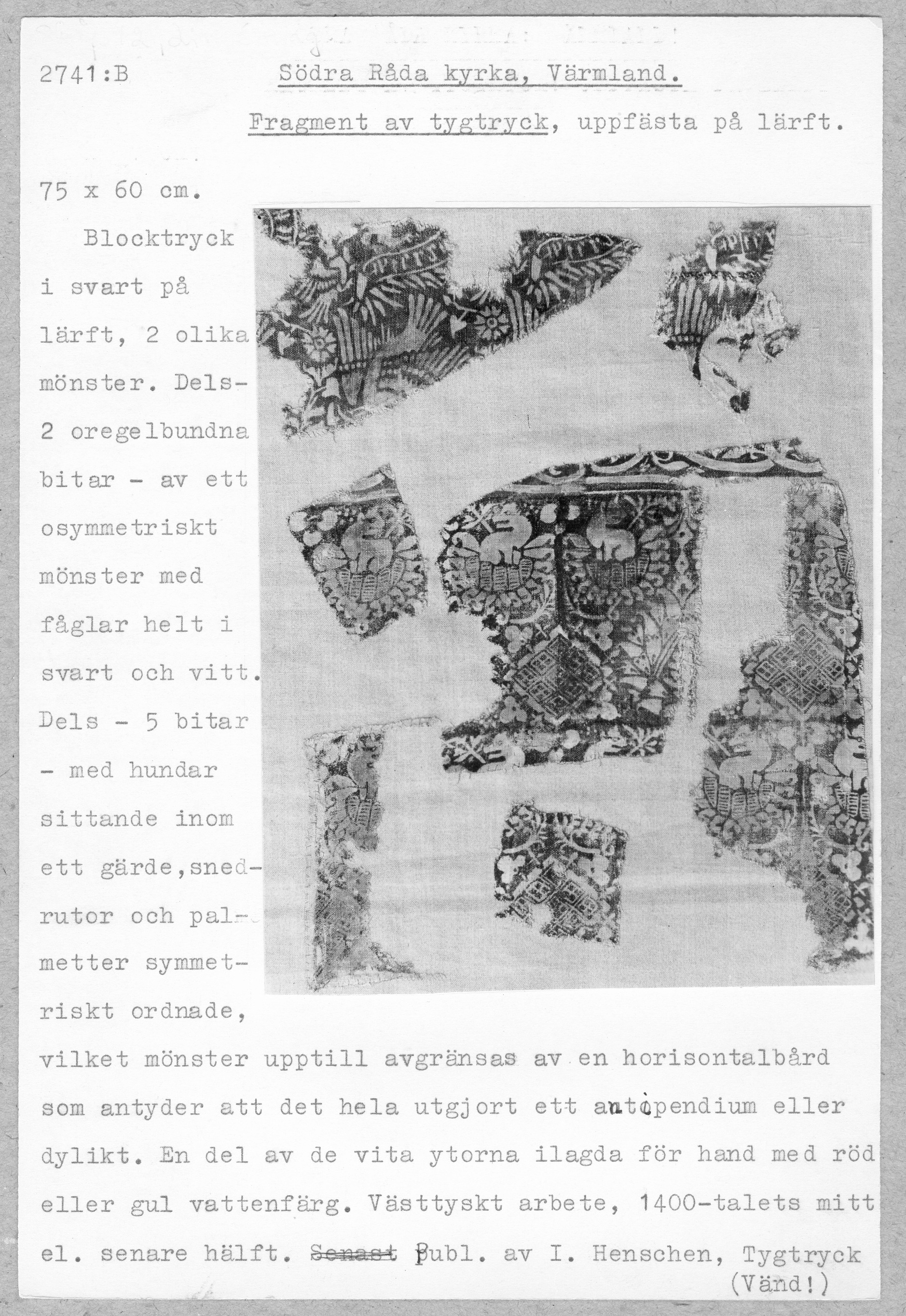 Lärft med svart blocktryck av två typer, bemålad bakgrund. Västyskt arbete. Inlämnad 1860. Två bitar av trycket har fåglar och textband. Ett högt kvalitativt arbete. Ej komplett rapport. Fyra bitar av trycket har hundar, snedställda rutor, granatäpplen och avgränsas upptill av en horisontell bård. Något kladdigigt tryck. Ej komplett rapport. Båda trycken har påmålad röd färg för att accentuera delar av trycket. Det med fler delar har också en adderad gulbrun färg på vissa partier. Trycket med fåglar möjligen äldre än det med hundar. Vid inlämnandet till museet satt dessa tyger fastsydda på baksidan av 96386_HST, som omnämns som antependium.