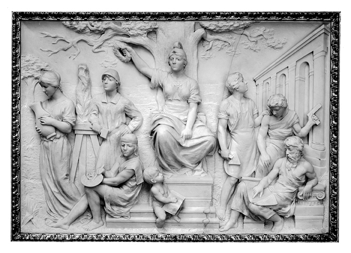- Marmorn från Carrara, Italien. Reliefen af liggande rektangulär form. I förgrunden åtta figurer, däraf fem manliga, två kvinnliga och ett barn. I midten en allegorisk kvinnofigur sittande på en tron samt vänd framåt, tronen på ett podium i två afsatser; hufvudet svagt vridet åt högra axeln, högra armen förd snedt utåt-uppåt, i handen en krans, vänstra armen nedåtriktad och sträckt, handen löst knuten med pekfingret sträckt nedåt, knäna åtskilda; kvinnan i liten hjälm med framtill insvängd låg kam, fotsid klädnad med korta (delvis uppvikna) ärmar, öfver knäna en löst liggande mantel. Bakom tronen och kvinnan en ek. Vid den tronande midtfigurens högra sida tre figurer, symboliserande bildkonsten. Ytterst en stående ung kvinna (Konsthandtverket), vänd snedt framåt med ryggen åt de två öfriga, armarna böjda framför lifvet, i händerna en vas, i den vänstra dessutom ett pennstift, hufvudet något nedböjdt mot vasen; iklädd löst sittande fotsid klädning, sammanhållen kring höfterna af ett ej synligt skärp. Stående närmast midtfiguren en ung man (Skulpturen), vänd framåt samt med högra Vid den tronande midtfigurens vänstra sida tre män, symboliserande Byggnadskonsten. Stående närmast en yngling, vänd åt höger samt med en murslef i högra handen, iklädd arbetsblus, öfver hvilken ett förkläde, ärmarna uppkaflade, benen nakna. Vid ynglingens vänstra sida en ung man, något framåtböjd öfver en sittande äldre man, hvilken öfver sina knän lagt ut en ritning; den unge mannen med högra handen stödd mot högra knäet, som är något uppåtböjdt, vänstra armen böjd utåt, i handen en vinkelhake; iklädd lång arbetsdräkt, som lämnar högra axeln och armen samt vänstra armen bara. Den äldre mannen med långt skägg samt sittande med bakåt-lutadt öfverlif, vänd mot midtfiguren, vänstra armen, som är böjd snedt bakåt, stödd mot ett joniskt kolonnkapitäl, liggande på några marmorblock, högra armen något böjd framför kroppen samt med handen pekande på ritningen, benen böjda, det högra något framåtfördt. Till höger bortom männen en byggnad med tre arkadbågar, mellan hvilka pilastrar, taket ej synligt. I bakgrunden kalt slättlandskap med ett träd längst till vänster. I högra nedre hörnet signering: Höjd: 88 cm.; längd: 1.29 m. Från år 1899; skulptören Vilhelm Maurits Gustaf (Gusten) Lindberg, f. 25 April 1852, d. 15 April 1932; reliefen huggen i Florens under dennes tillsyn och medverkan. Modellerad efter beställning af Walther och Wilhelmina von Hall-WYL, f. KEMPE, af konstnären Gusten Lindberg, se kontrakt 9 December 1897. Betaldt 1 November 1898. Pris: Kr. 1800, se Rescontra (Huset N:o 4 vid Hamngatan), kontrakt samt kvitto till Kontoret. Gipsmodellen: Frakt till Florens, se räkning 25 Januari 1899. Betald 31 December 1899. Pris: Lire 309:05 (Kr. 210:15, tillsammans med frakt för gipsmodeller till reliefer II:B.a.i—3), se Rescontra (Huset N:o 4 vid Hamngatan) och räkning. Reliefen huggen i Florens, se räkning 25 Januari 1899. Betaldt 31 December 1899. Pris: Lire 4200 för grofhuggning (tillsammans med reliefer 2 och 3) och Kr. 3600 för finhuggning (tillsammans med reliefer 2 och 3), se Rescontra (Huset N:o 4 vid Hamngatan) och räkning. Afsänd 21 November 1899 från Lübeck tili Stockholm, se avis. Ankom 23 November 1899, se avis. Betaldt 31 December 1899. Pris: Kr. 415:09 (tillsammans med frakt för reliefer 2 och 3), se Rescontra (Huset N:o 4 vid Hamngatan) och räkning. Bidrag till konstnären Gusten Lindbergs resa till Italien Kr. 500 betaldt 31 December 1899, se Rescontra (Huset N:o 4 vid Hamngatan) samt räkning 25 Januari 1899.