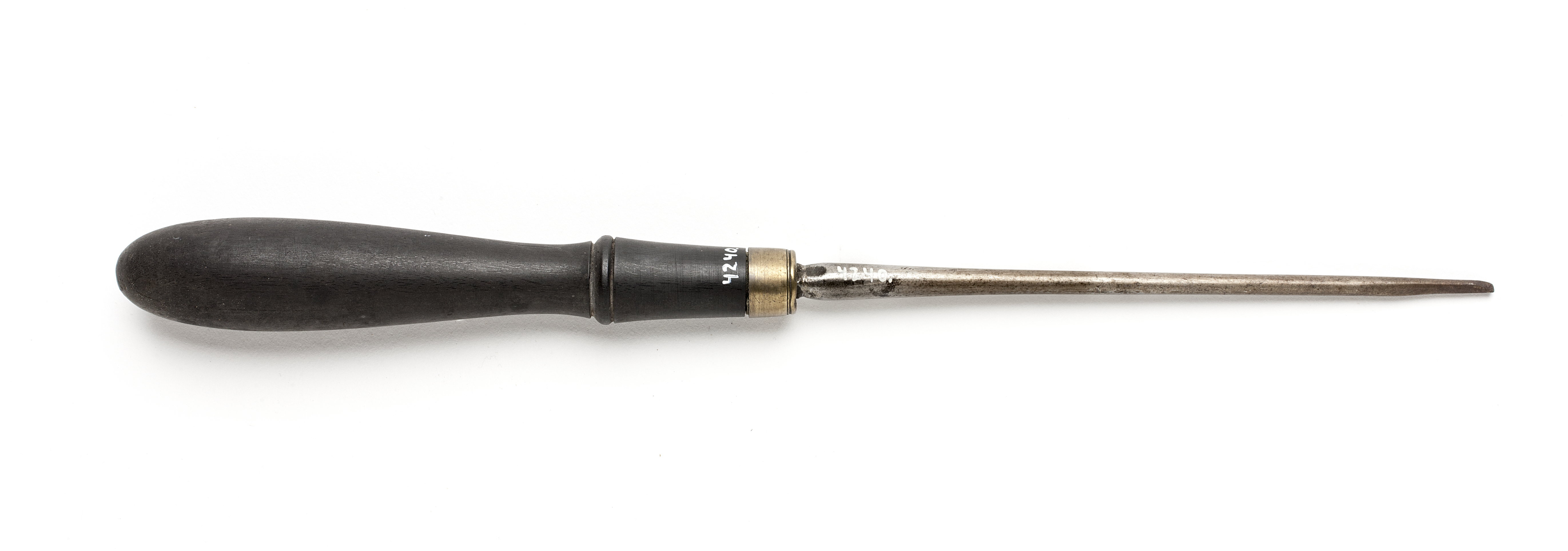 Rund klinga. Eggen något sned. Svarvat skaft av ebenholts med en vulst. Mässingsring. Stämplat på klingan: "S B".