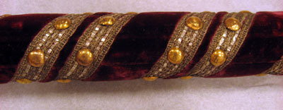 Lång rund bärstång av trä med förstärkning av metallskoning upptill. Klädd med röd sammet och dekorerad med ett vävt band av gulbeige silkestråd, silvertråd och silverlan virat runtom, med två rader intill varandra. På bandet sitter förgyllda nitar. I övre delen en 85mm lång metallspets fästad vid en rund ring av metall. Botten ej täckt av sammet utan trät blottas.