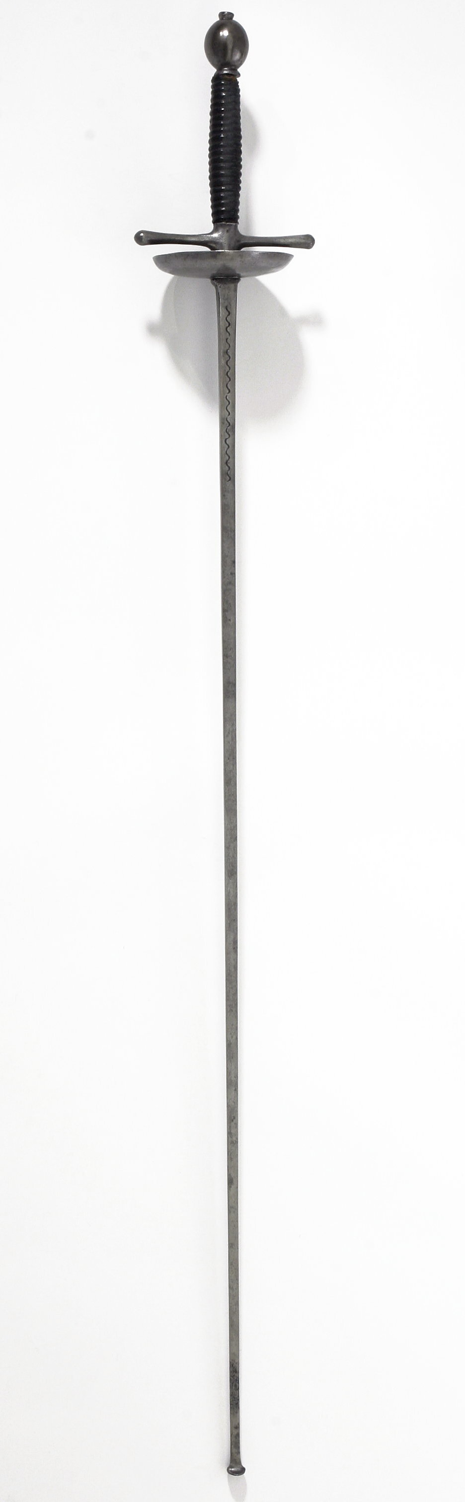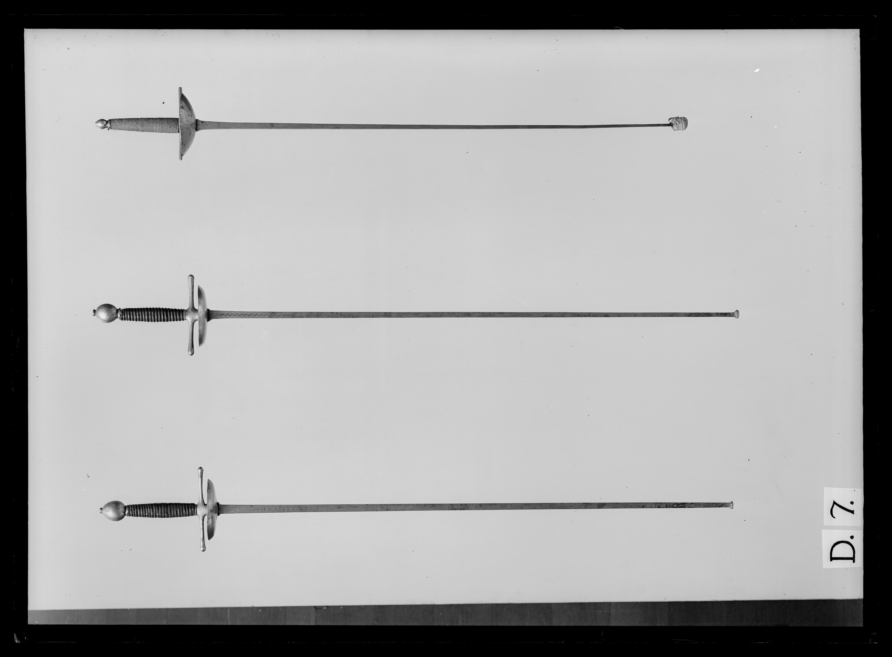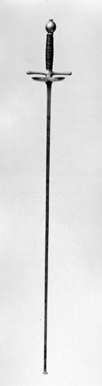 Enkelt fäste av stål med runt tvärsnitt, låg, rund nitknapp. Raka, i ändarna förtjockade parerstänger. Rund, skålformig parerplåt. Kaveln klädd med skinn ovanpå spirallindat segelgarn, som bildar räfflor. Klinga rak med rektangulärt tvärsnitt. Nära basen på in- och utsidan längs klingan en våga linje. Vid klingbasen på ena sidan inslaget ett litet S:t Georgskors. Ytteränden med cirkelrund skiva. Enligt inventarium 1748 är floretten leverad 1716 av hovauditören Folcker (Zacharias F. 1662-1739) och skall ha kommit från Gripsholm.