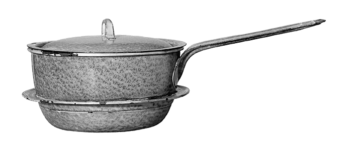 KASTRULL med lock Av emaljerad stålplåt, emaljen gråspräcklig. Rund, avsmalnande nedåt, med svagt skålig botten samt med fläns och snett utstående skaft. Kring brädden en utstående stav, flänsen bred, rakt utstående, med stavformig ytterkant samt anbragt ett stycke nedanför mitten. Skaft platt, jämnbrett, med flackrundad översida och stavformig undersida, något indragen från kanterna, ytteränden rundad samt med ett ovalt hål, kanterna innanför detta med en kort insvängning; från skaftets inre ände utgående en nedböjd rundad flik, fäst vid kastrullen. Höjd: 8,9 cm.; diameter: 16,9 cm. Skaft, längd: 16 cm. Lock: Lågt, svagt kupigt, kring kanten en rakt uppstående fals med rakt utstående kantfläns; på mitten avlångt handtag av platt skena, med nedböjda ändar och ovalstavigt mittstycke samt med ytterändarna rakt utstående och fästa vid locket. Höjd: 1,4 cm.; diameter: 17,5 cm.
