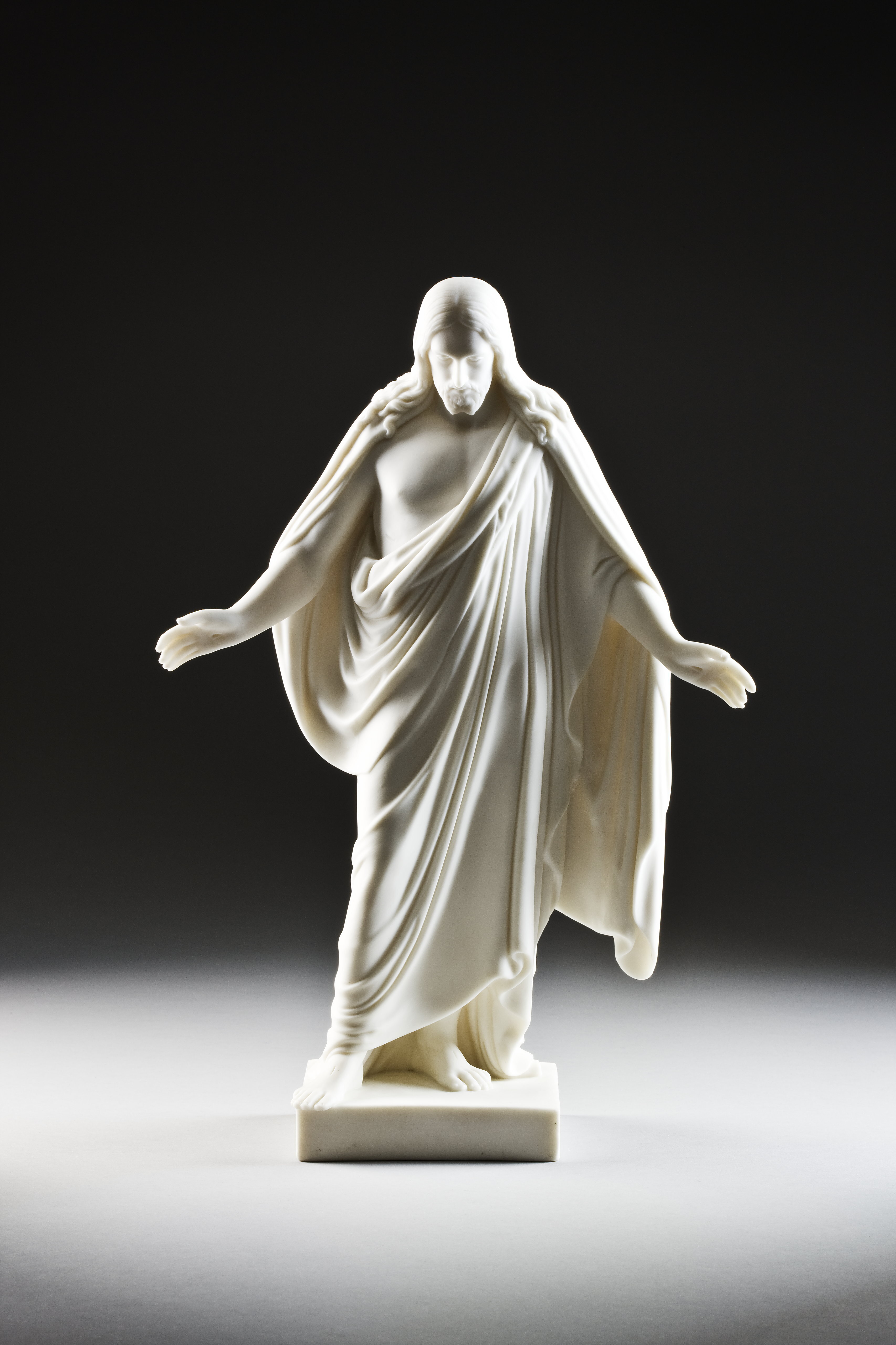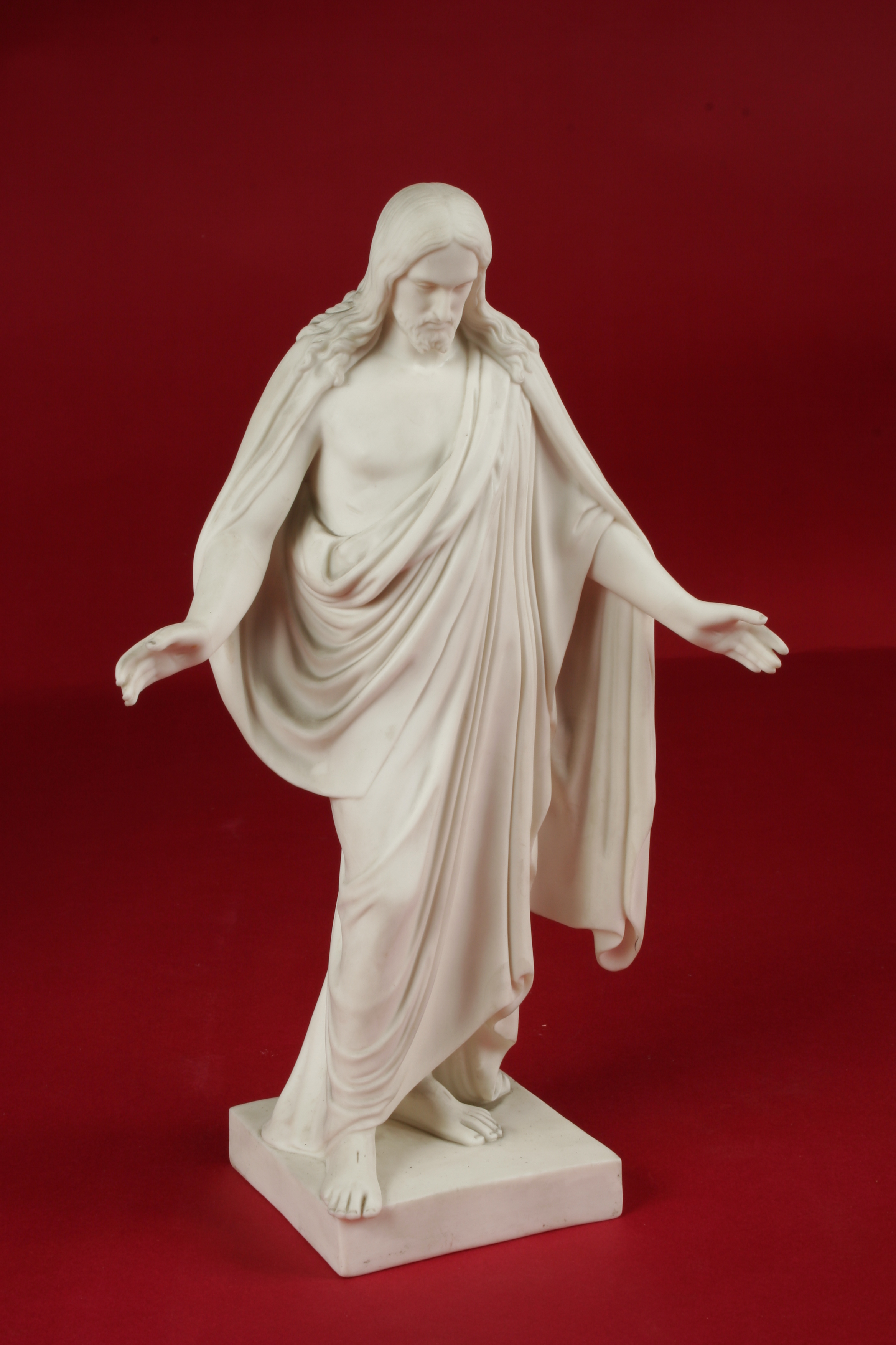 FIGURIN. Kristusfigur av s. k. parian på slät fyrsidig fotplatta med urholkad undersida. Utförd efter Berthel Thorvaldsens modell. Figurinen har sin förebild i den danske skulptören Bertel Thorvaldsens Kristus, som gjordes för Vor Frue Kirke i Köpenhamn 1821 och som utfördes i marmor 1839. Den blev en ikonliknande skulptur som spreds i bild och i kopior av alla de slag. Thorvaldsens arbeten fick stor betydelse som förlagor inom 1800-talets konsthantverk. När Bing & Gröndahl startade sin porslinstillverkning i Köpenhamn 1853 var en av de första produkterna biskvifigurer och just Thorvaldsens skulpturer var det man anhöll om tillstånd att få kopiera. Vid Höganäs kärlfabrik framställdes Thorvalsens reliefer på hushålls- och prydnadskärl. Att Thorvaldsen fick ett eget museum i Köpenhamn, som öppnade 1848 bidrog också till att upphöja honom som sin tids störste skulptör. Flera andra av hans skulpturer avbildades i parian vid Gustavsberg. Denna Kristusfigur är från 1870-talet och den tillverkades vid Gustavsberg mellan åren 1872-1925. Fabriken grundlagd 1825 av grosshandklaren J.H.Öhman och kommerserådet J.O.Wennberg. Efter att ha varit i olika ägares händer inköptes företaget 1875 av Aktiebolaget Gustafsbergs Fabriks Intressenter.Till 1855 tillverkades endast fajans men från detta år även s.k. halväkta porslin (ironstone china) från 1864 dessutom fältspatäkta porslin. Pris: okänt. Inköpt under 1870-talets första hälft av WvH i Gustafsbergs försäljningslokal på Lilla Nygatan 14, Sthlm.