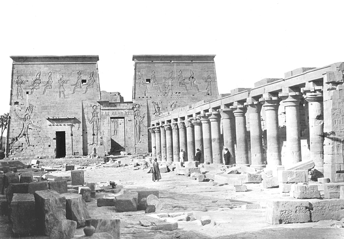 Från ön File (Philae) utanför Assuan. Egypten. Text på fotografiet: Phylae. Fotografierna LXVI:M.01.- 201. kommer från resan till Egypten och Sudan som Wilhelmina och Walther von Hallwyl gjorde vintern 1900-1901. De lämnade Sverige den 5 november 1900 och fortsatte från Egypten till Palestina den 28 mars 1901. Med på resan var döttrarna Ellen med maken Henric de Maré och Irma med maken Wilhelm von Geijer. Wilhelminas sällskapsdam, fröken Ida Uhse reste också med. Under en del av resan anslöt sig ledamoten av Internationella domstolen i Kairo, assessorn Otto Conrad Waldemar Cedercrantz med makan Anna Elisabeth. Vid resan uppför Nilen hade Walther von Hallwyl hyrt ångfartyget Columbia med besättning. Båtresan startade i Kairo 27 december 1900, gick ända till Wadi Halfa varifrån man reste vidare med tåg till Khartum och tillbaka till Wadi Halfa. Båten vände åter i riktning mot Kairo, men det verkar som att sällskapet tog tåg sista biten, från Luxor. Henric och Ellen de Maré samt fru Cedercrantz lämnade båten redan då de passerade Luxor första gången. Resten av sällskapet återvände till Kairo den 1 mars. Fotografierna LXVI:M.01.-120. togs av resenärerna själva, de största av Ellen de Maré, de mellersta av Wilhelmina von Hallwyl och de minsta av Wilhelm von Geijer. Resten köptes av professionella fotografer i Kairo, de flesta från Studio Photogr. Artistique G. Lekegian & Cie. Alla uppgifter kommer från Ida Uhses reseanteckningar. Inköpt hos studio Photogr. Artistique G. Lekegian & Co.