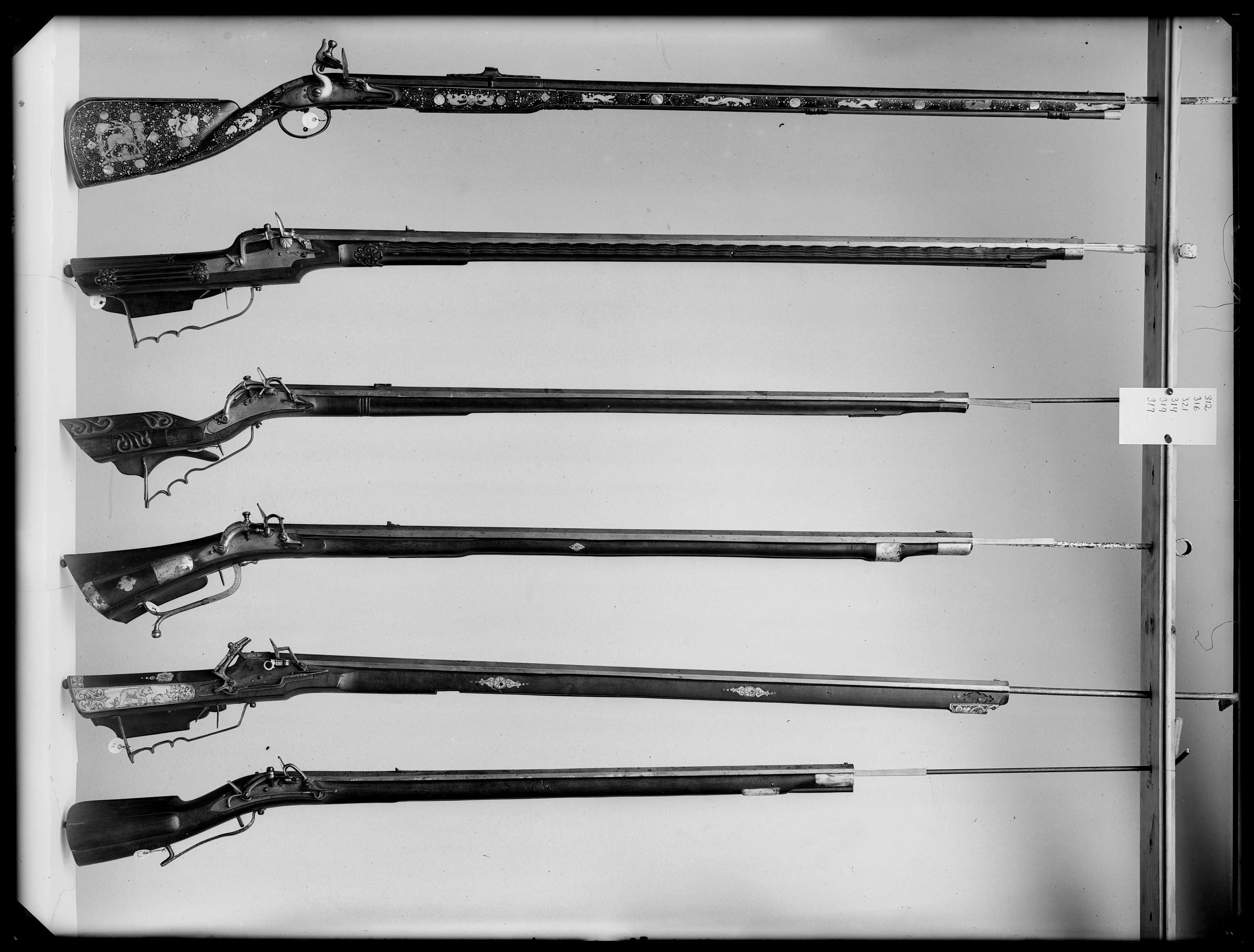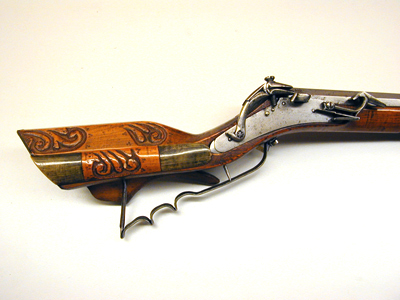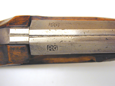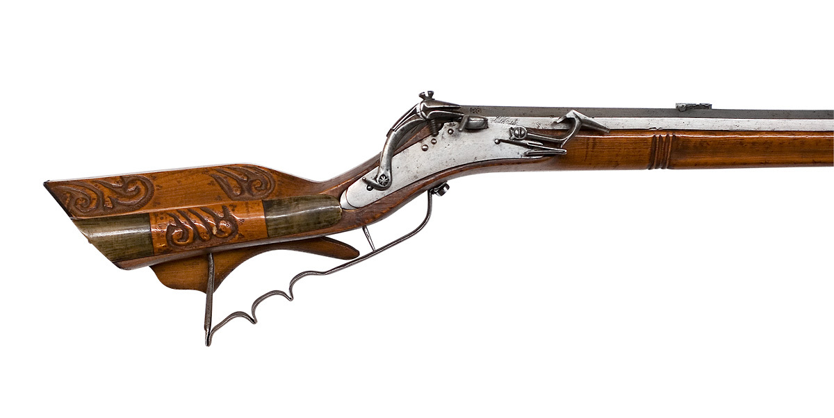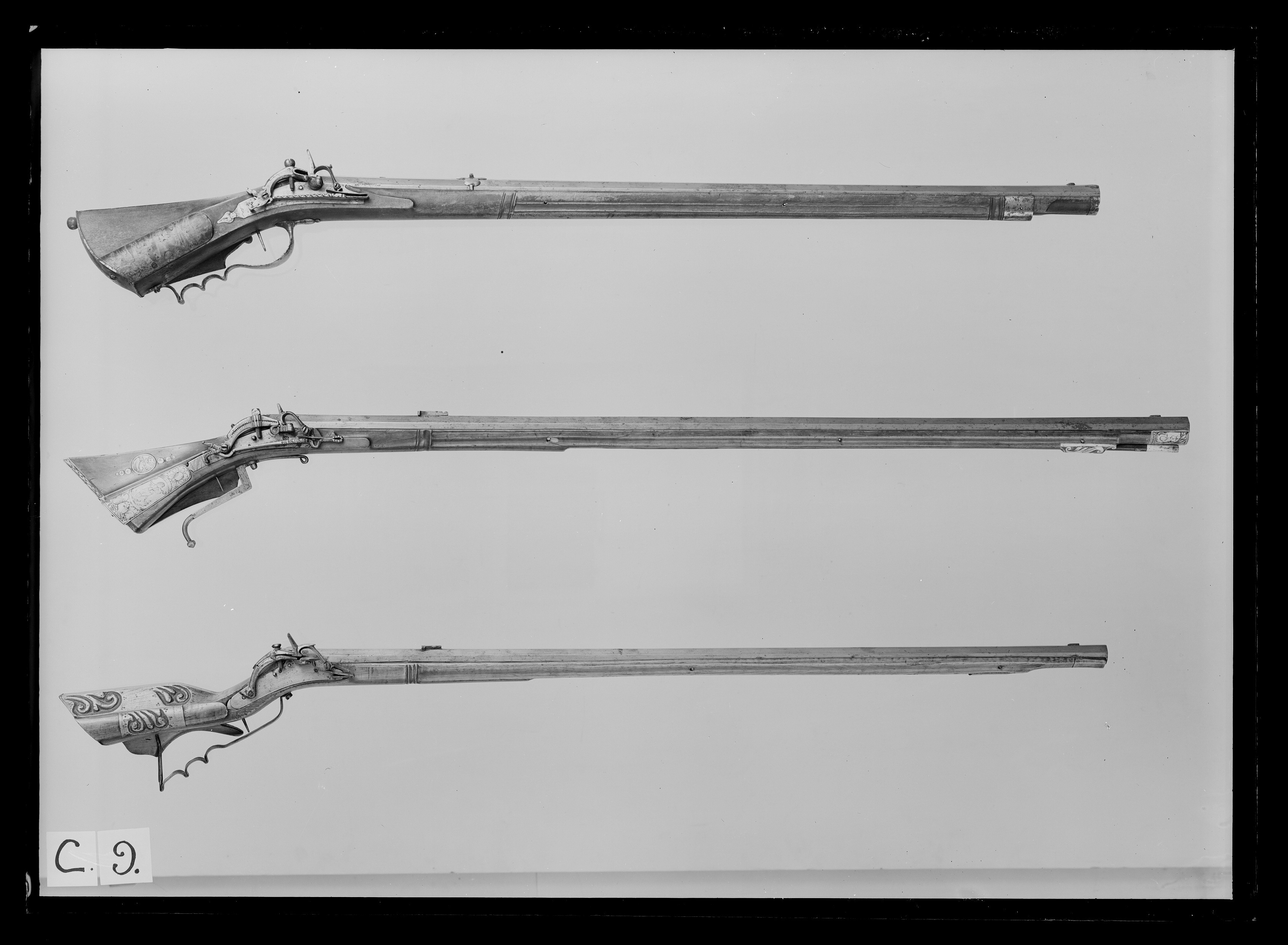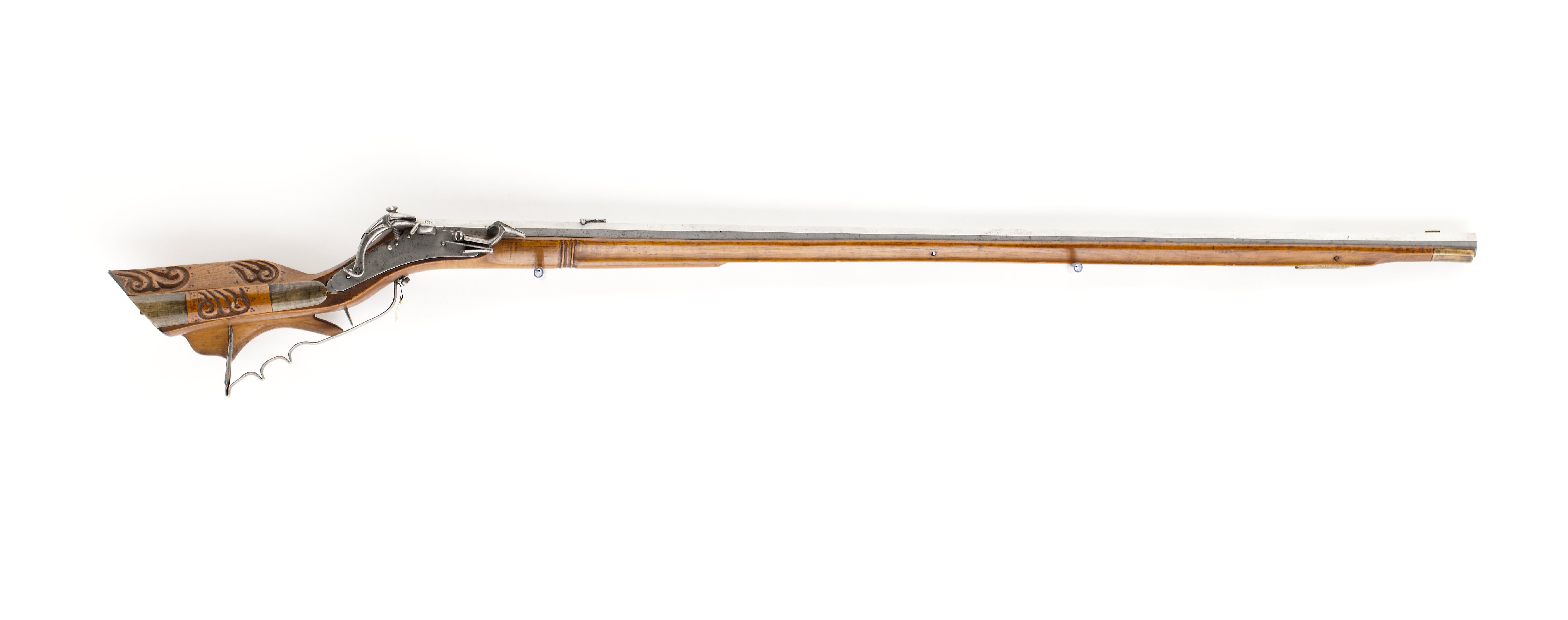 Åttsidig, åttaräfflad pipa med i vinkel böjt, tvärt avskuret svansskruvblad, kanterna på svansskruvbladets vågräta del fasade. På sidofaserna vid pipbasen stämpel: "P.G" (Stöckelnr 459). Riktmedel: Siktskåra från vinkeln på svansskruvbladet till siktet. Kulissikte av stål, blyplattan saknas. Stolpkorn av mässing. Fästning: Två häften. Pipan fäst med krysskruv underifrån (varbygelskruven) samt två pipstift av stål. Snapplås, lägglås av svensk typ, plant låsbleck med försänkt, spetsoval bakre spets. Böjd, rundad hane med inlaxad överkäke, tvärt avskurna käkar, käkskruv med tillplattat, kulformigt huvud. Fängpanna rundad med fasade kanter, välvt fängpannelock med nedåtböjt grepp. Batteri med plant fängpannelock, rakt eldstål med rundad överände, rundad baksida, åsad arm. Batterifjäder med fasade kanter, nederdelen kortare. Invändig slagfjäder, komma-formig nöt. Fästning: En låsskruv. Avtryckaren smal, rak. Helstock med kolv av teschitztyp, kolvl: 210 mm, plan rygg, vinge, kolvlåda med lock med hornplattor i båda ändar. Snidad dekor på kolvens h. sida och på kolvlådelocket i form av rankor i relief mot prickad bakgrund, ringpunsningar på rankorna. På anslaget i försänkt relief ett lejon (?) och en hund, vid bakkanten en äggstavsbård. Bakplåt, rund låsskruvbricka, överrörka och näsband av horn. Varbygel av stål med tre breda fingerlägen, bakstolpen inskruvad i kolven.