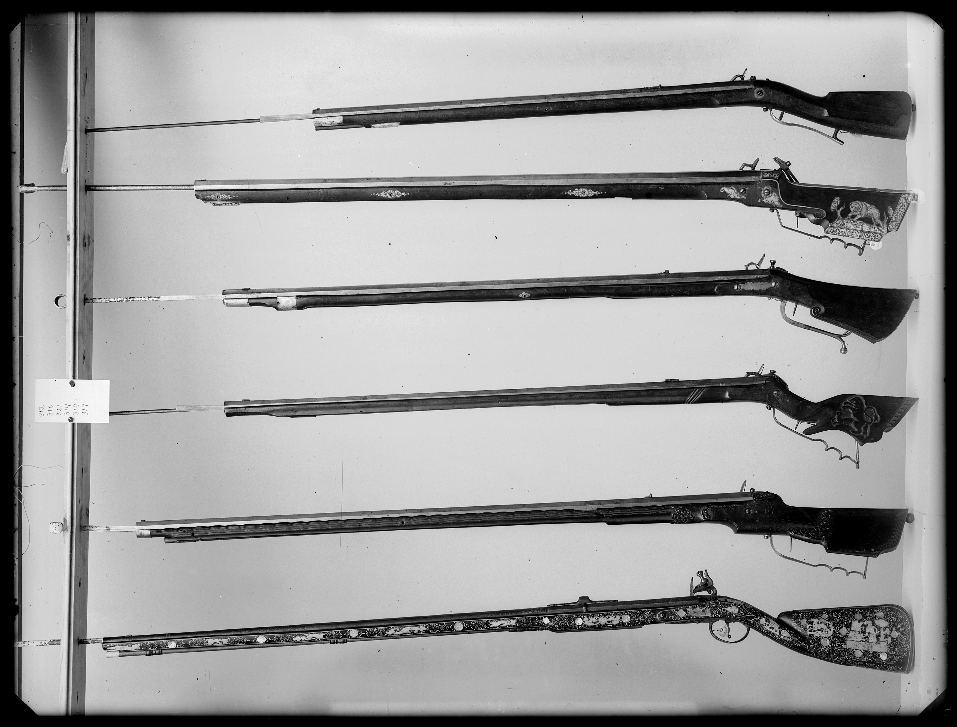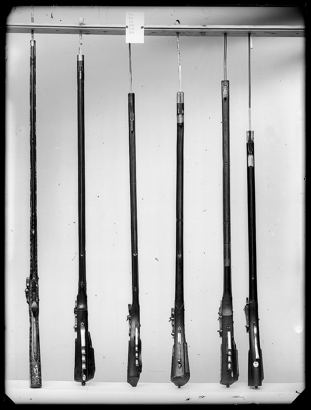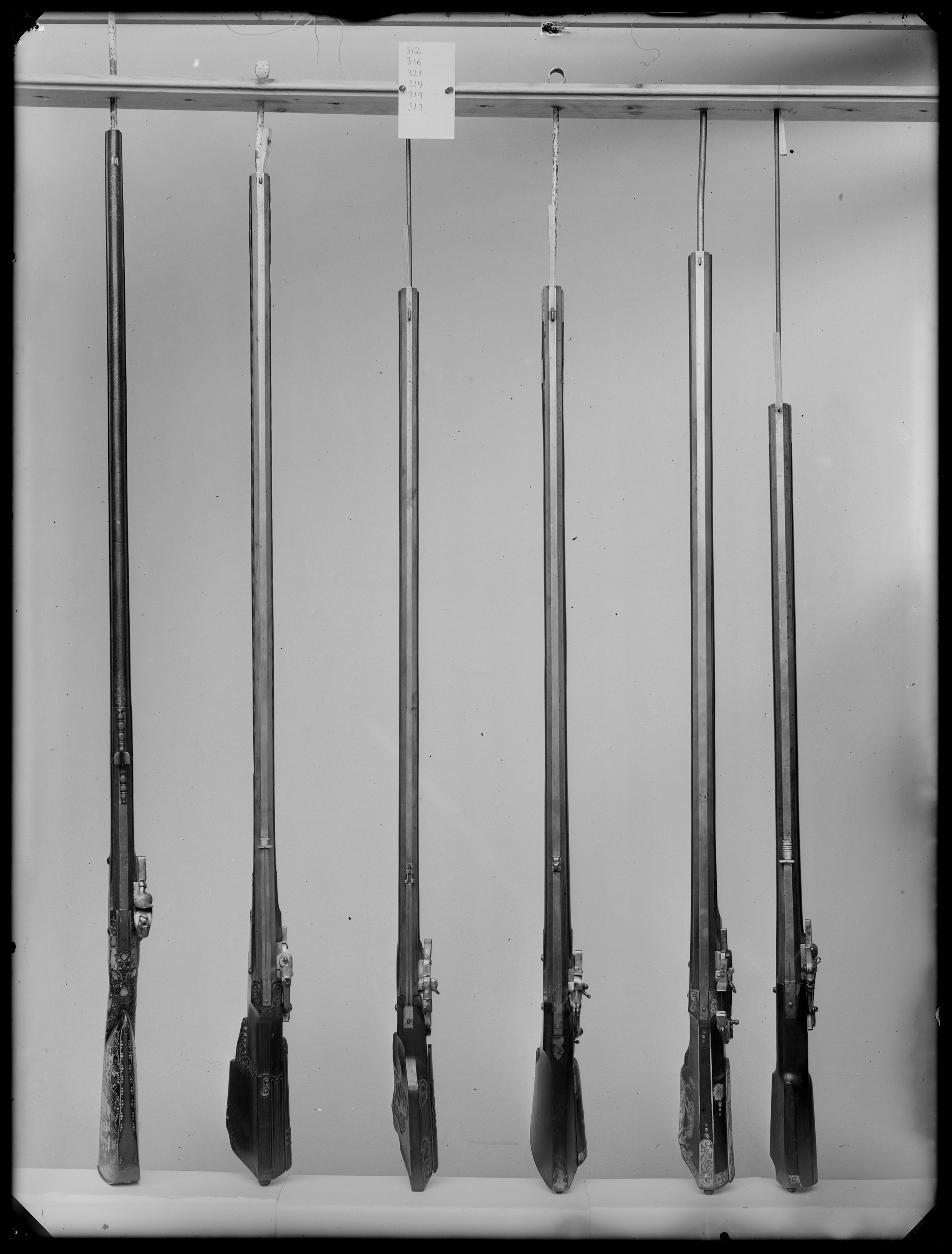 Åttsidig, åttaräfflad pipa med i vinkel böjt, tvärt avskuret svansskruvblad, kanterna på svansskruvbladets vågräta del fasade. På sidofaserna vid pipbasen stämpel: "P.G" (Stöckelnr 459). Riktmedel: Siktskåra från vinkeln på svansskruvbladet till siktet. Kulissikte av stål, blyplattan saknas. Stolpkorn av mässing. Fästning: Två häften. Pipan fäst med krysskruv underifrån (varbygelskruven) samt två pipstift av stål. Snapplås, lägglås av svensk typ, plant låsbleck med försänkt, spetsoval bakre spets. Böjd, rundad hane med inlaxad överkäke, tvärt avskurna käkar, käkskruv med tillplattat, kulformigt huvud. Fängpanna rundad med fasade kanter, välvt fängpannelock med nedåtböjt grepp. Batteri med plant fängpannelock, rakt eldstål med rundad överände, rundad baksida, åsad arm. Batterifjäder med fasade kanter, nederdelen kortare. Invändig slagfjäder, komma-formig nöt. Fästning: En låsskruv. Avtryckaren smal, rak. Helstock med kolv av teschitztyp, kolvl: 210 mm, plan rygg, vinge, kolvlåda med lock med hornplattor i båda ändar. Snidad dekor på kolvens h. sida och på kolvlådelocket i form av rankor i relief mot prickad bakgrund, ringpunsningar på rankorna. På anslaget i försänkt relief ett lejon (?) och en hund, vid bakkanten en äggstavsbård. Bakplåt, rund låsskruvbricka, överrörka och näsband av horn. Varbygel av stål med tre breda fingerlägen, bakstolpen inskruvad i kolven.