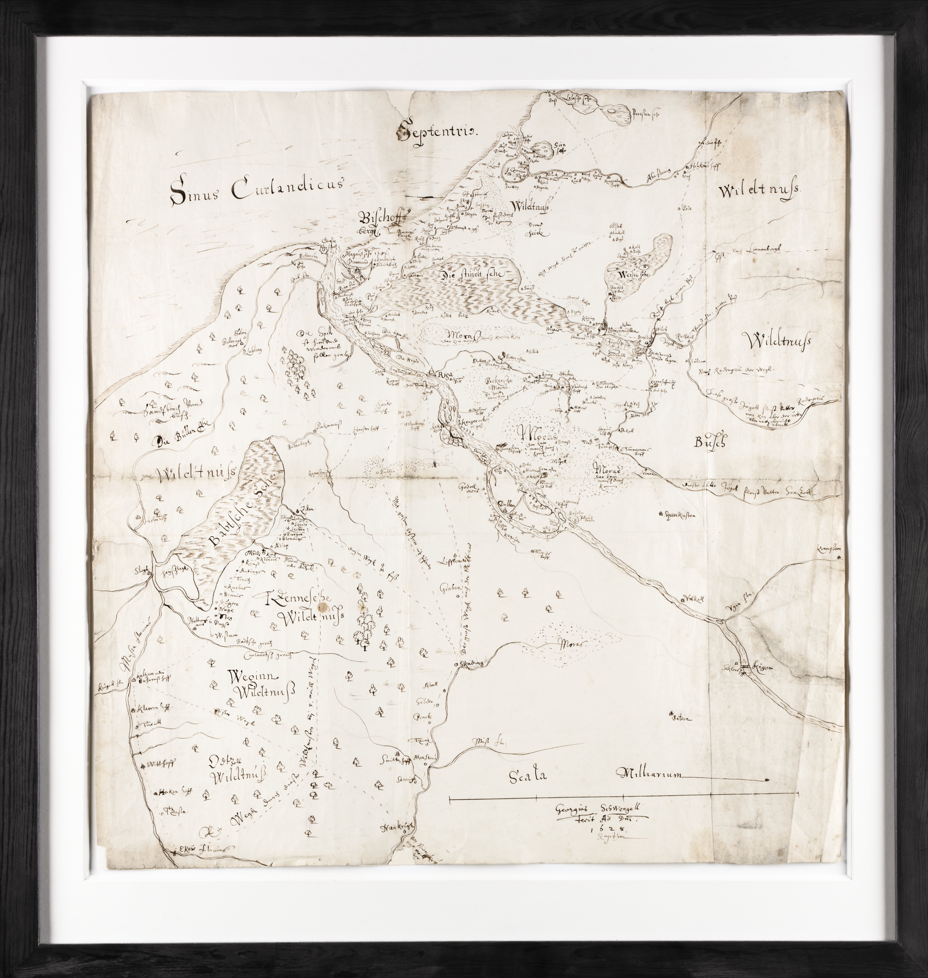 Karta över Kurland (idag Lettland) med utmärkande av [...] Handtecknad, på papper. Tusch ovanpå blyertsskiss.