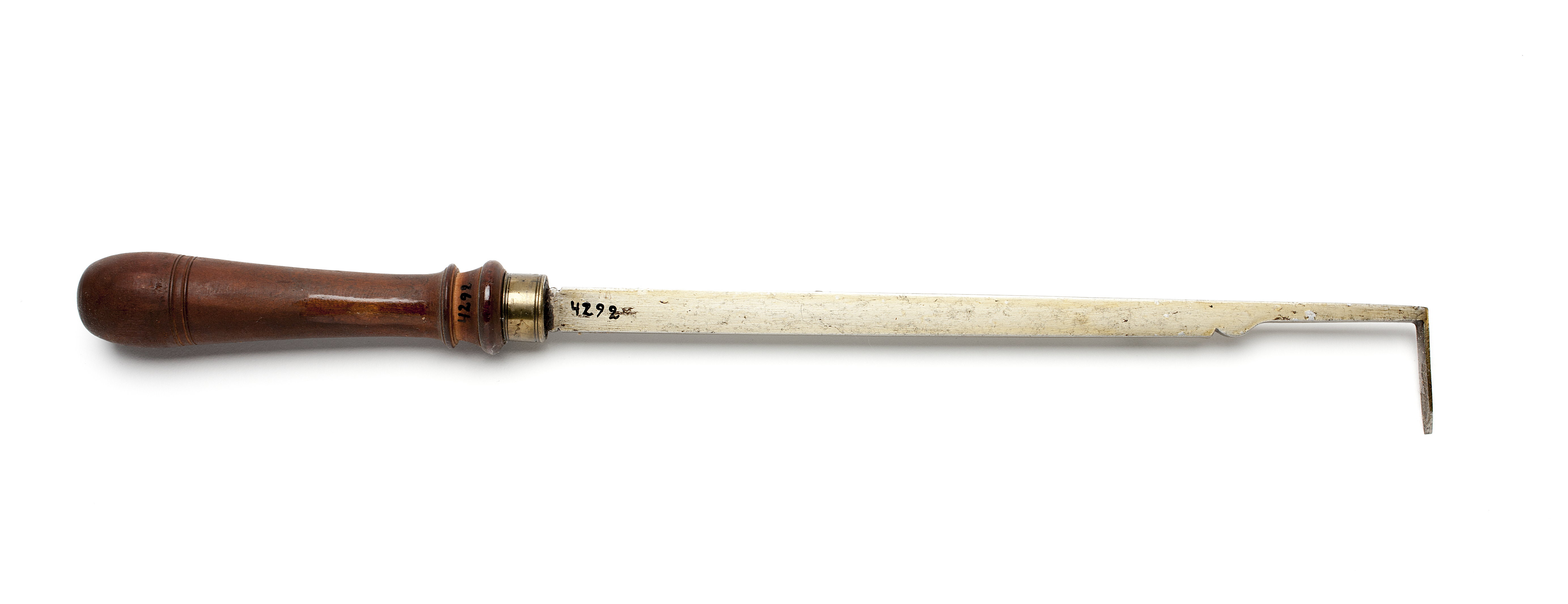 Klinga med rektangulär genomskärning och profilerad hals. Stämplat på klingan: hjärta under kors. Änden avsmalnande och svängd samt böjd i tvär vinkel. Kort egg i spetsen. Svarvat skaft av päronträ med två vulster nedtill ("rydboholmstyp"). Mässingsring.