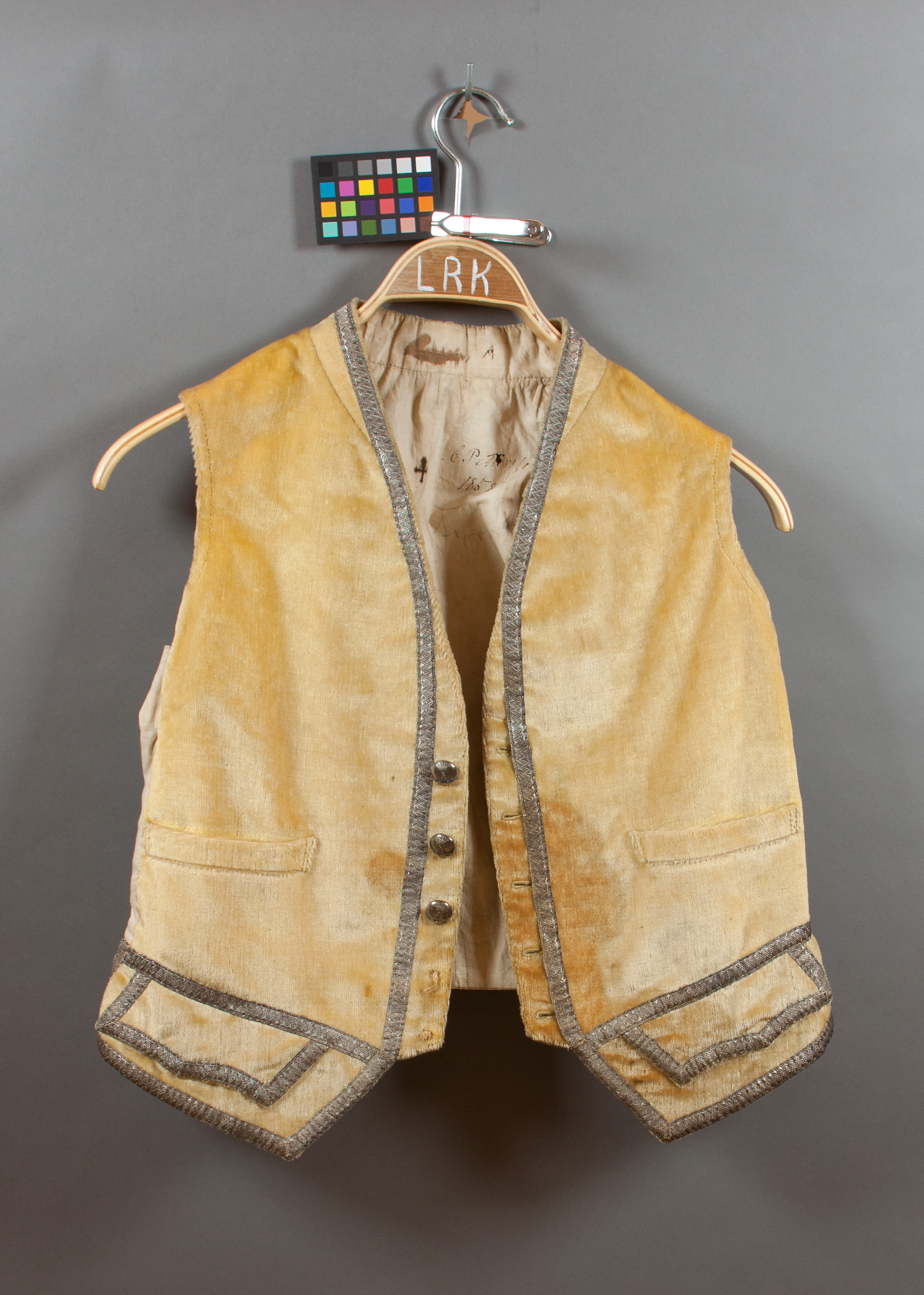 Väst av gul silkesplysch, kantad med silvergaloner. Enkel knäppning med välvda silverknappar, d: 18 mm med i relief ett " A " krönt med hertigkrona, tre kvar, två bortrivna. Krage uppstående baktill, framtill övergående i bröststycket, där halsöppningen långsamt smalnar ned till knappraden. Ärmlös. Två stolpfickor samt två ficklock med påsydda mindre lock fastsydda nedtill, kantade med silvergaloner. Foder och ryggstycke av vitt linne. Nedtill bak påsydda tyglappar för snörning. Inuti märkt och skrivet med bläck: " A // C. Pettersson // 1858 )) + // Forslund 82 // C. J. Johansson ".