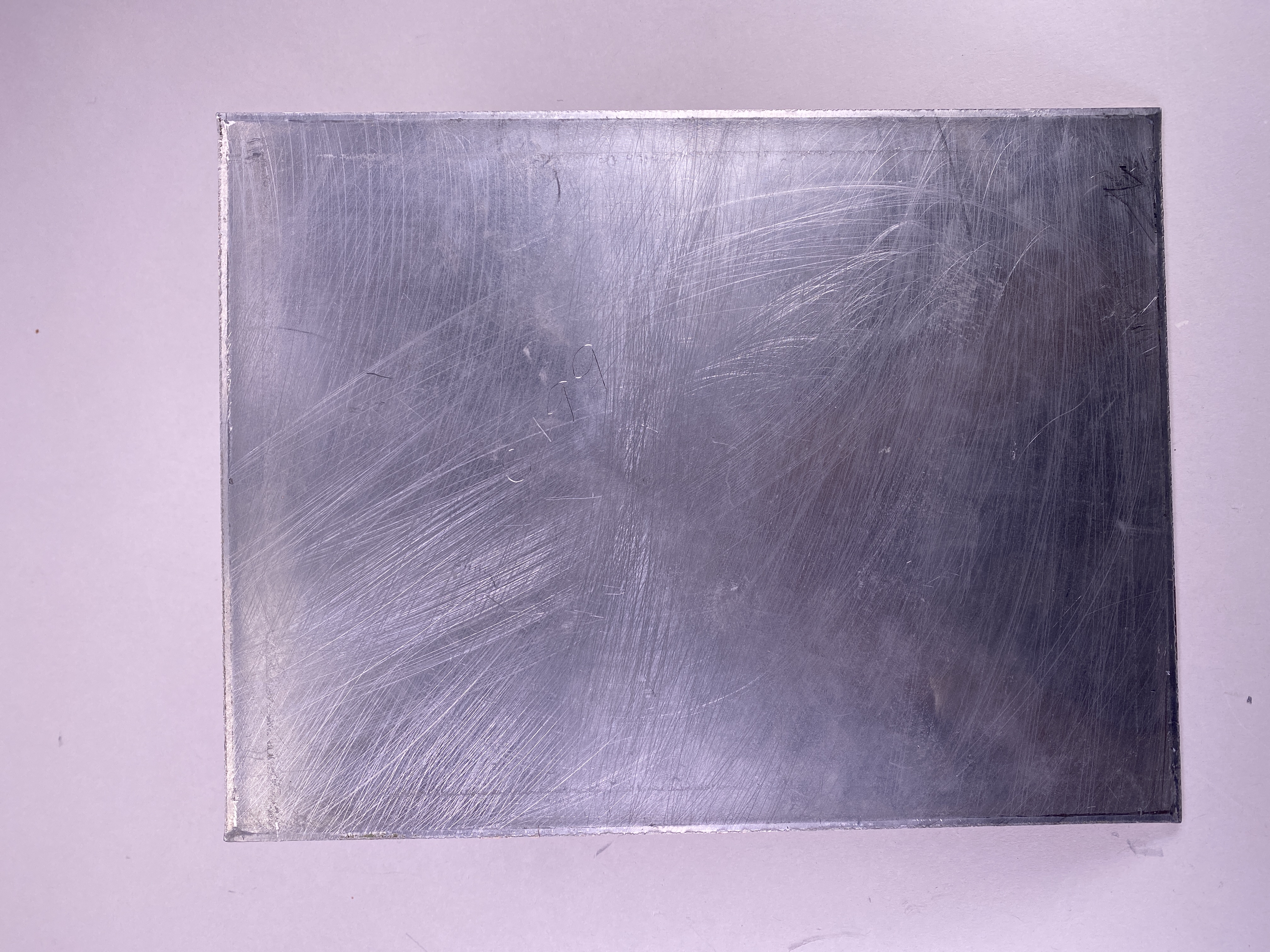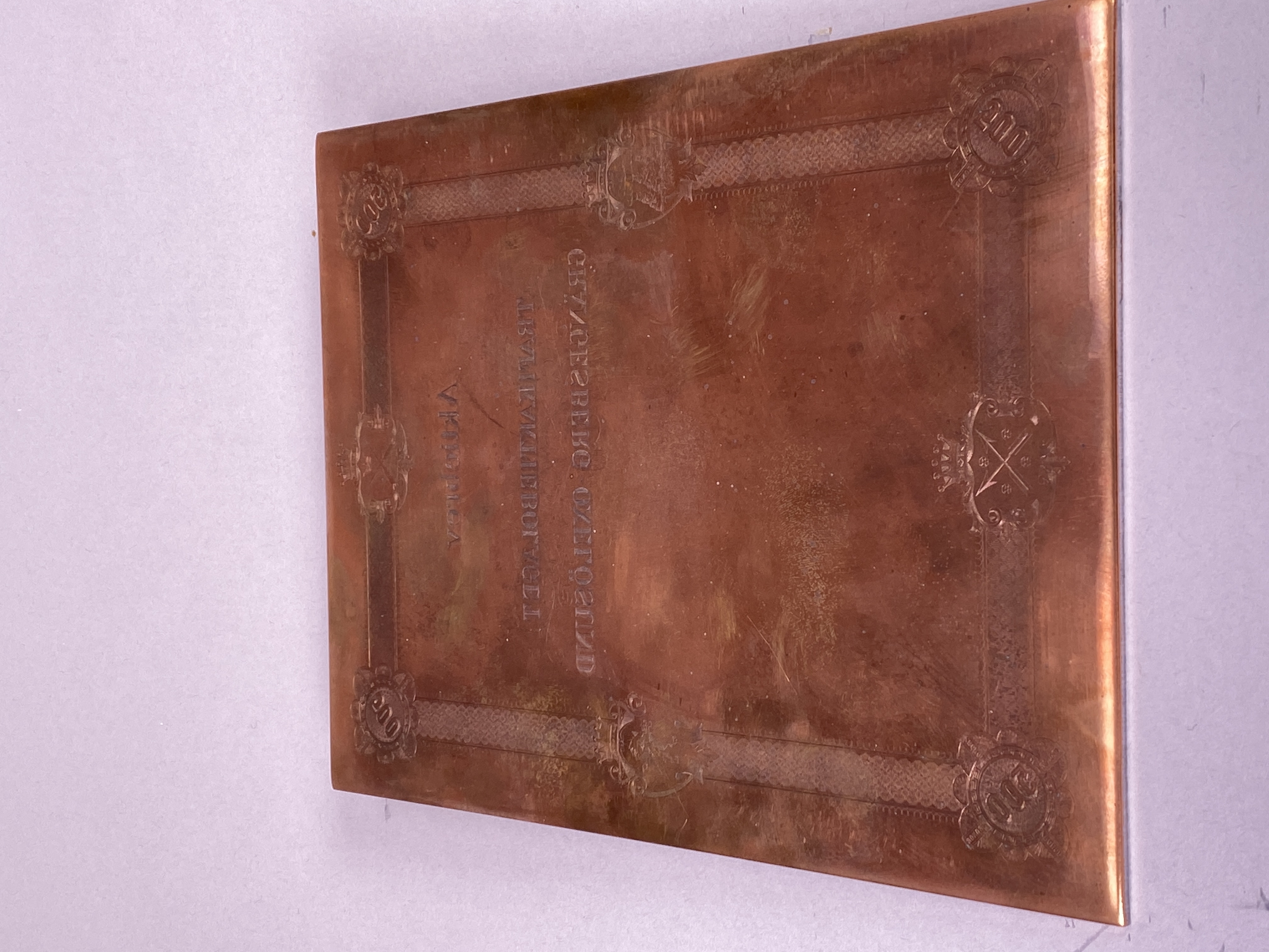 Tryckplåt i rostfritt stål till aktiebrev 500 kronor, stående format, med kopparöverdrag på framsidan. Text: "Aktiebrev / Trafikaktiebolaget / Grängesberg-Oxelösund".