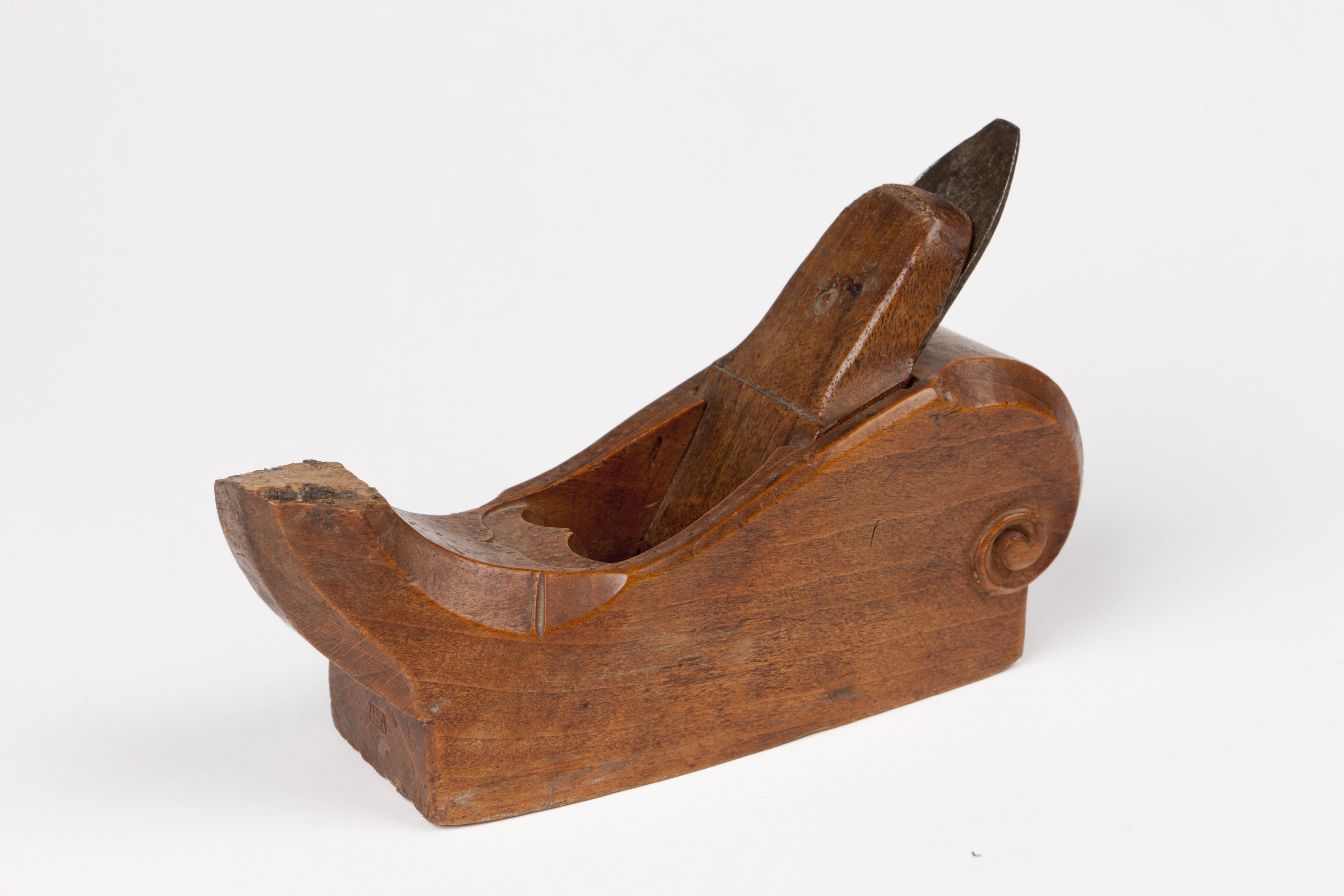 Plan undersida, skurna voluter och profilering vid nedsänkningen. Kil av valnöt med skuren, försänkt rundel omgiven av punkter. Järnet stämplat med kryss och fyra punkter. Stocken stämplad: I:A.