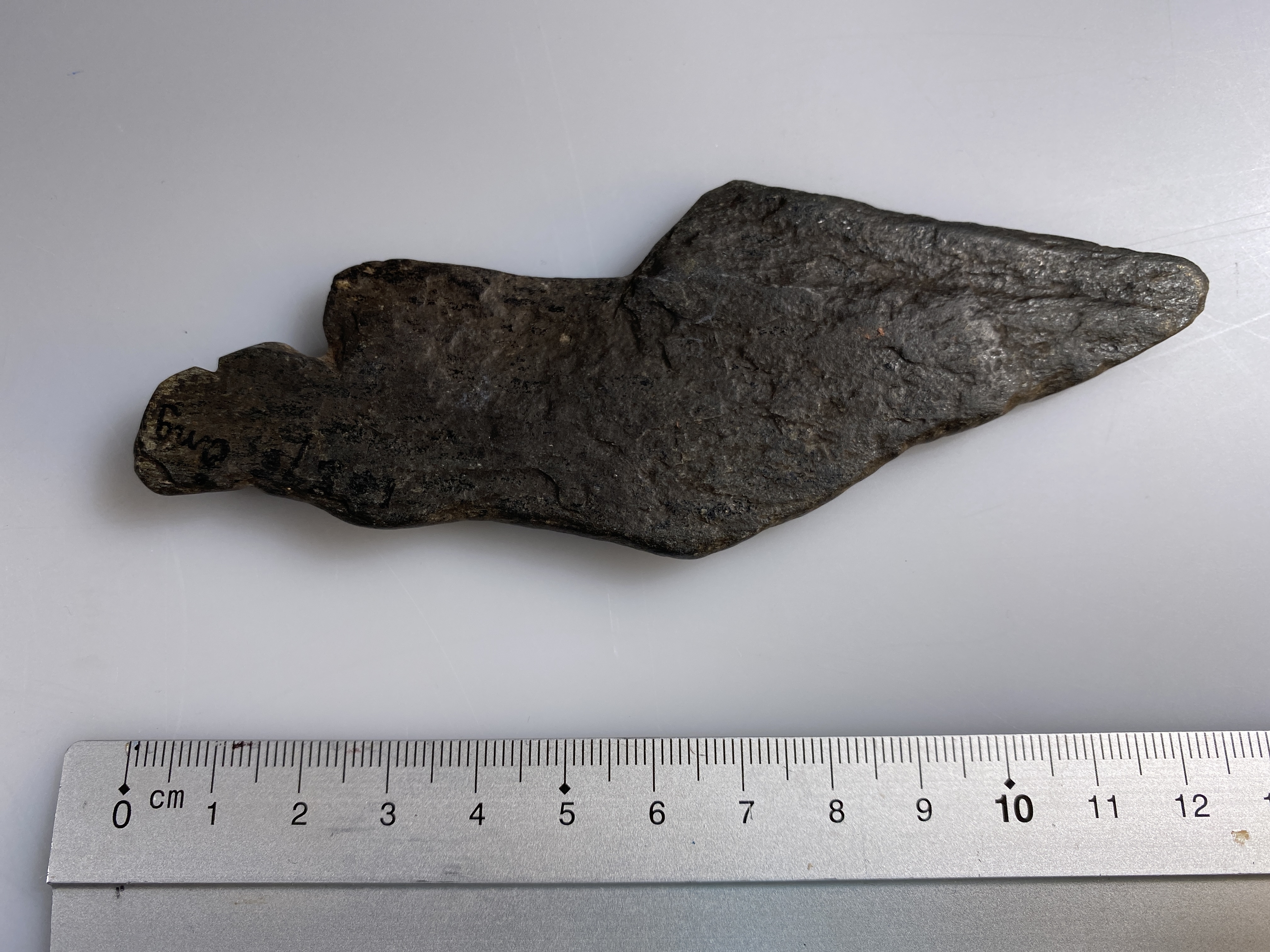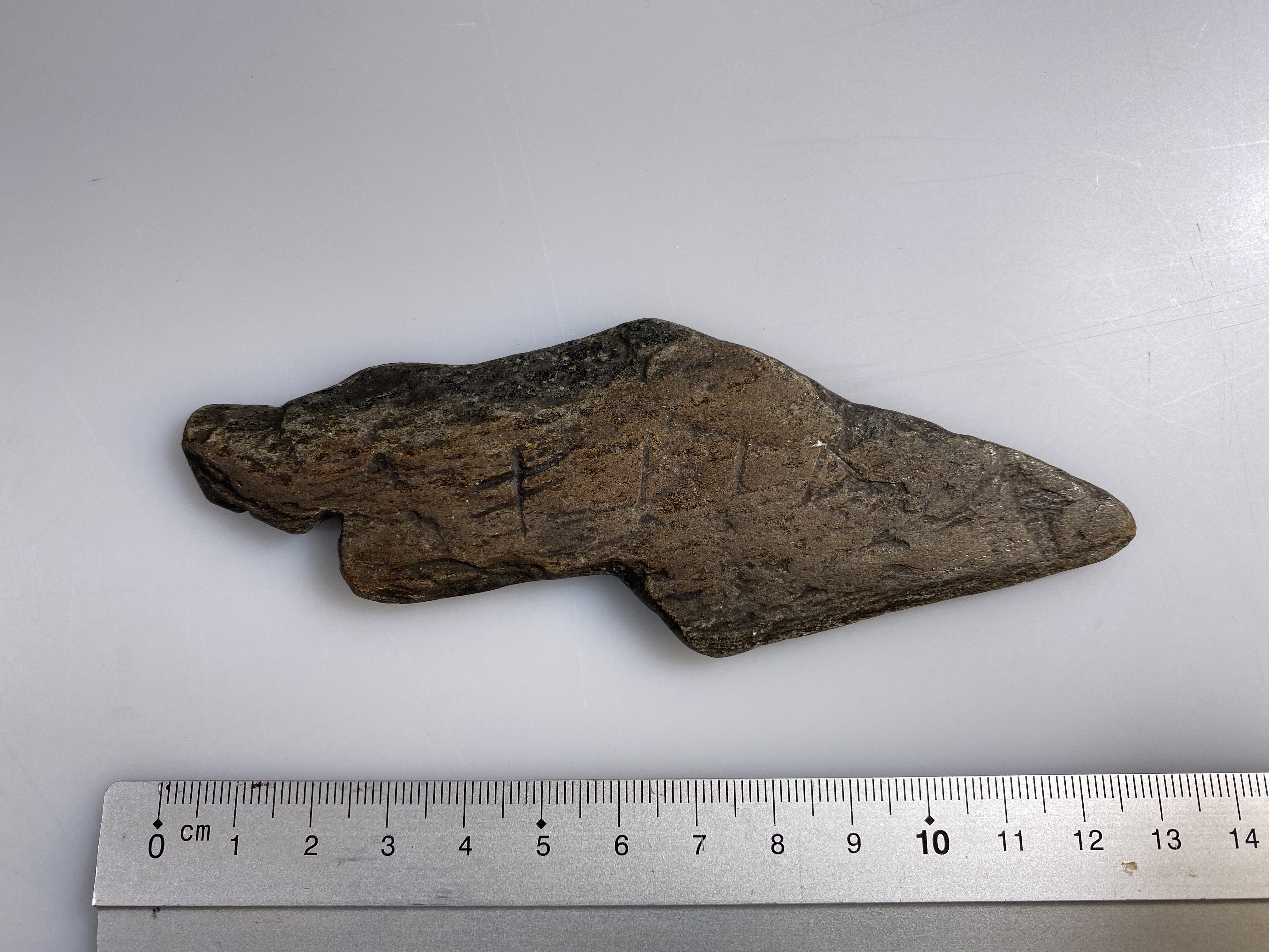 Knivliknande föremål av skiffer med runor. Inristat med bl a runorna: n-þ. Ån Fv1908;298B. Osäker datering