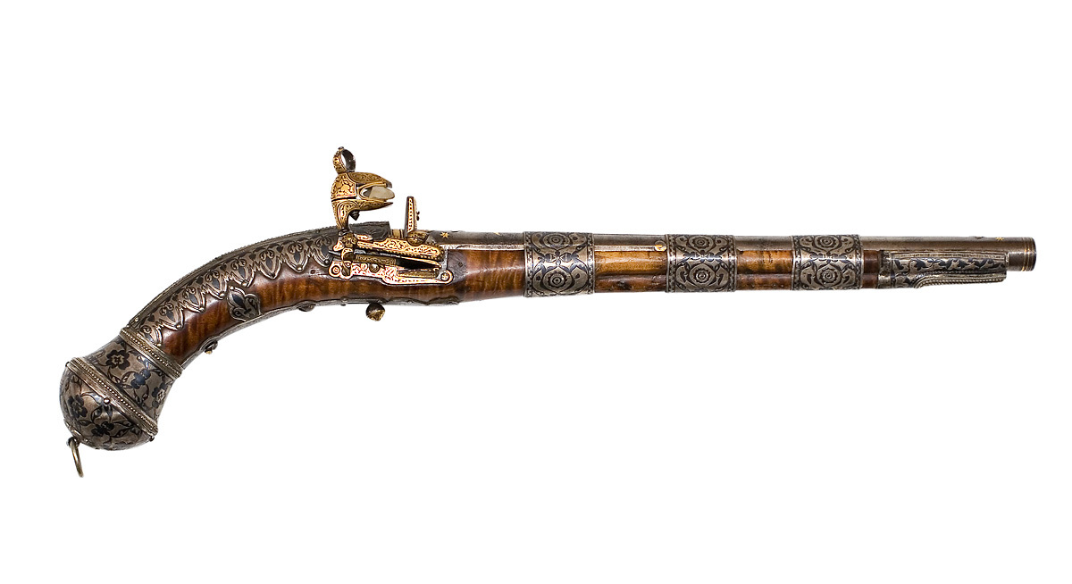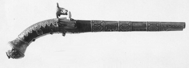 Rund, slätborrad pipa av damaskerat stål med plan ribba på ovansidan, avslutad fram- och baktill med tulpandekor i relief, påslagen gulddekor bl. a. i stjärnmönster. Vid pipbasen en bredare, guldbelagd vulst, därframför ett större, framtill rundat relieffält med droppformig fördjupning och guldstämpel. Runt mynningen tre inslagna guldringar. Fästning: Pipan fäst med två krysskruvar underifrån, huvuden med gulddekor, samt tre pipband av silver med niellodekor. Snapplås av katalana-typ av mörkanlöpt stål, nästan helt täck av påslagen gulddekor av rankor med tulpanmönster, nedanför batterifjädern skrifttecken(?). Hane med lös överkäke med fasade kanter och mittås, ringformigt käkskruvhuvud. Eldstål med lös, räfflad slagyta, fäst med skruv från ryggsidan. Utvändig slagfjäder. Fästning och avtryckare: Två låsskruvar med välvda huvuden med gulddekor. Avtryckare med kulformig ände och gulddekor. Brun helstock av tvärflammigt ädelträ (valnötsrot?) med fast, i framstocken inskuren markering för laddstock. Beslag av silver med niellodekor i form av bladrankor mot finpunsad bakgrund. Halvsfärisk kolvkula med svängd hals mot kolven, pärlstavsband längs sfärens kant och vid halsens överände. Sexpassformig, blomformig centrumplatta med fasetterad bygel och bärring av stål. Längs kolvryggen ett silverband från kolvkula till svansskruv, niellodekor och framtill en kvadratisk platta i låg relief med en liten siktskåra. På vardera sidan därom silverbeslag med nederkanter i form av åtta tungor på låssidan, sju på anslagssidan, niellodekor samt längs ryggbandet pärlstavar, på varje tunga en fästspik av silver, längs ryggbandet tre spikar. Anslagssidans bleck övergående i sidbleck med konturerad nederkand. Längs kolvens undersida ett silverband med niellodekor, utvidgat på två ställen för pipans krysskruvar, blomformig avslutning framför avtryckarens hål. Mellan underbeslag och sidobeslag en trebladformig silverplatta på vardera sidan. Tre breda pipband-rörkor av silver med niellodekor. Näsband av silver med niellodekor, l: 67 mm, antydd laddstocksöppning med pärlstavskantbårder.