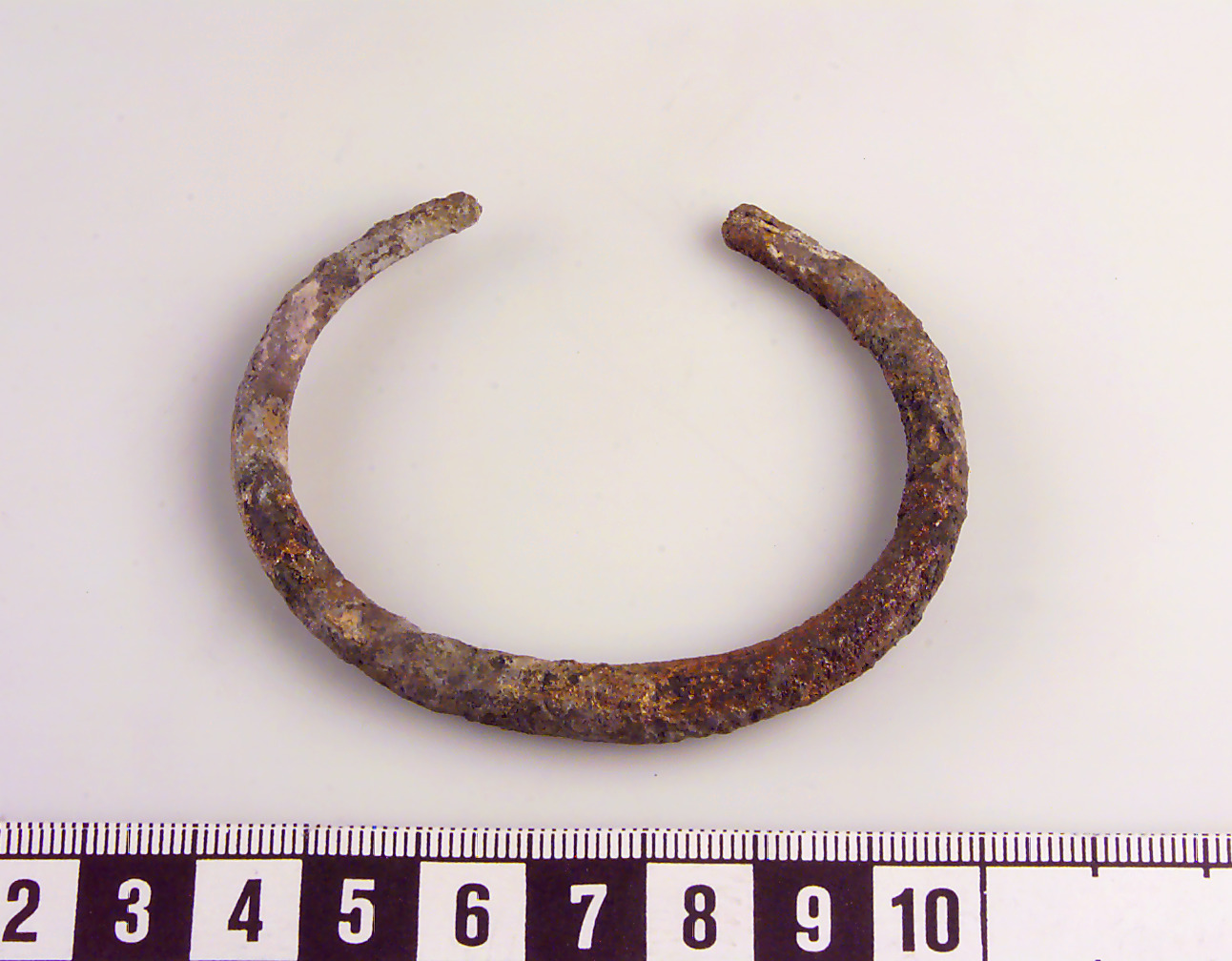 Rundad ten med avsmalnande ändar. Kraftigt korroderad.