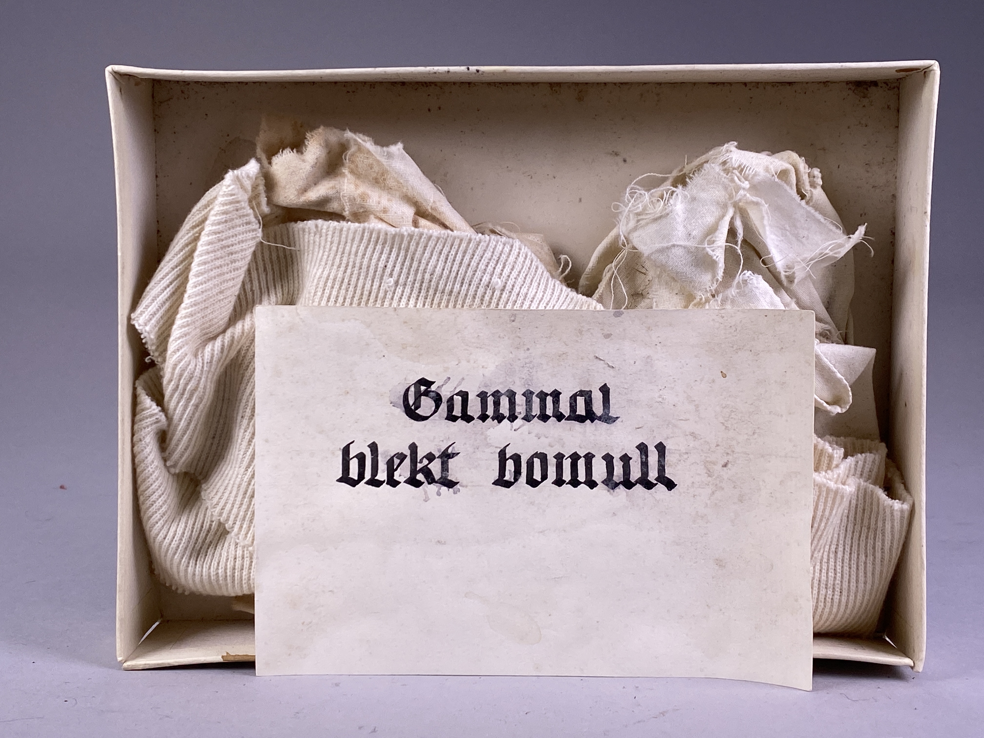 Prover på fyra stora bitar av Gammal Blekt Bomull i en ask.