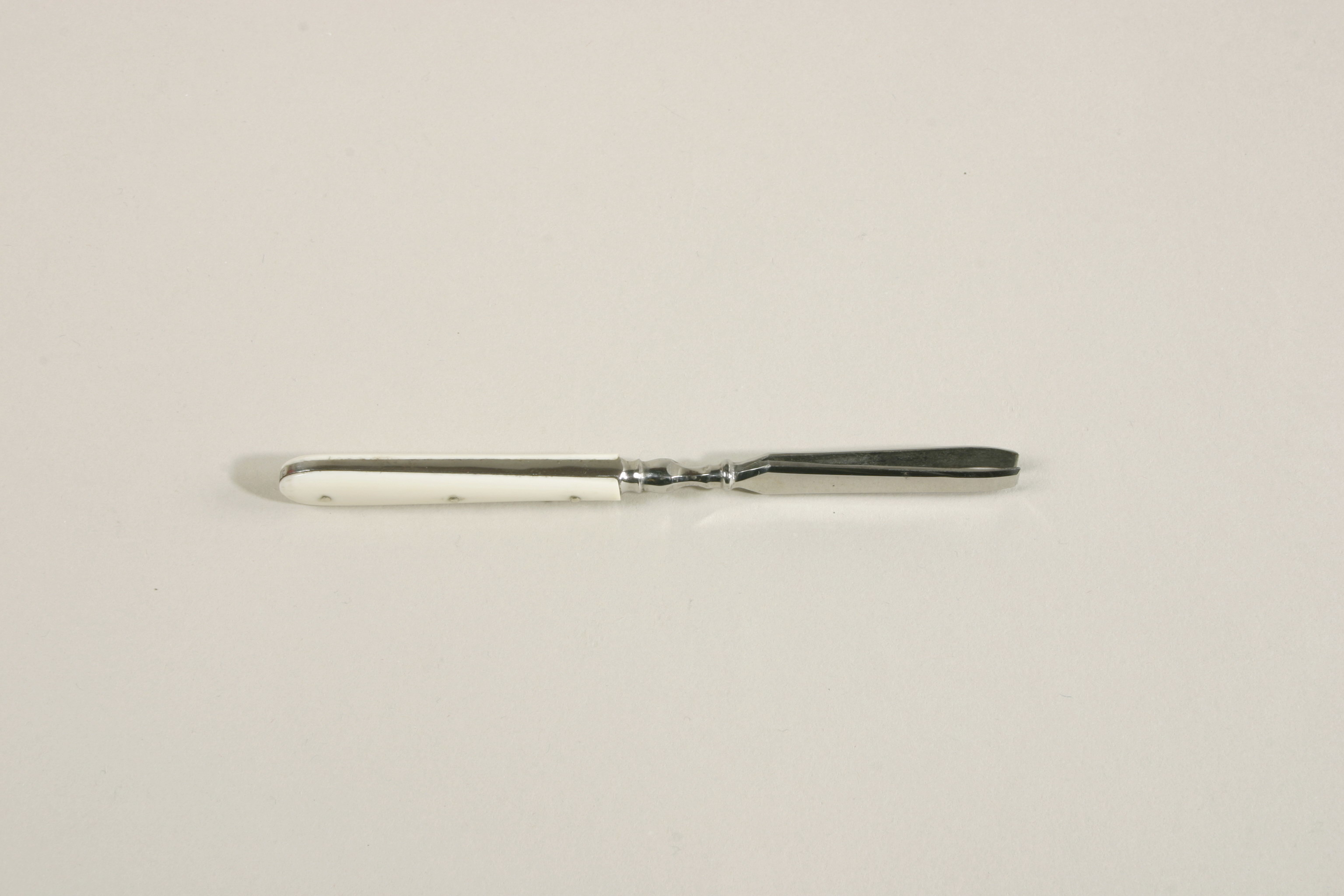 Pincett av stål med avfasade sidor. Övergången till handtaget profilerad och fasetterad. Handtag klätt med fastnitad elfenben, slät, polerad.