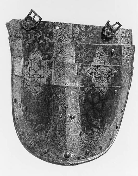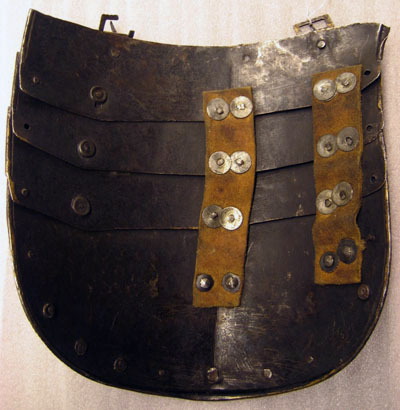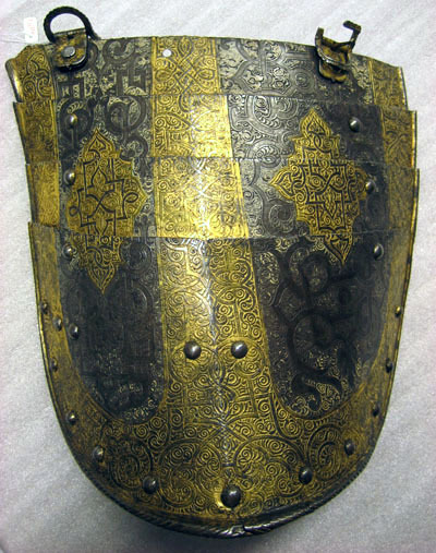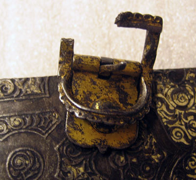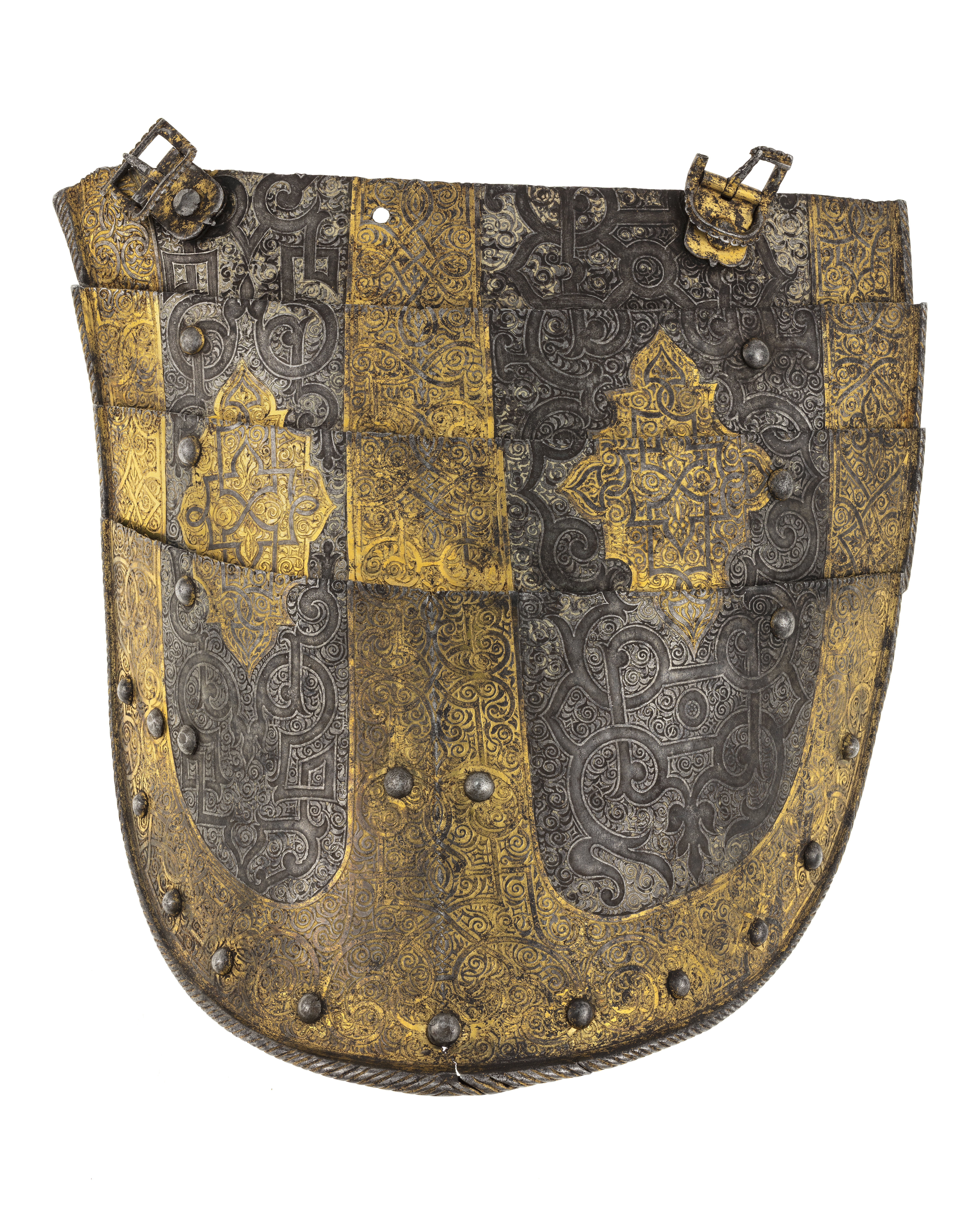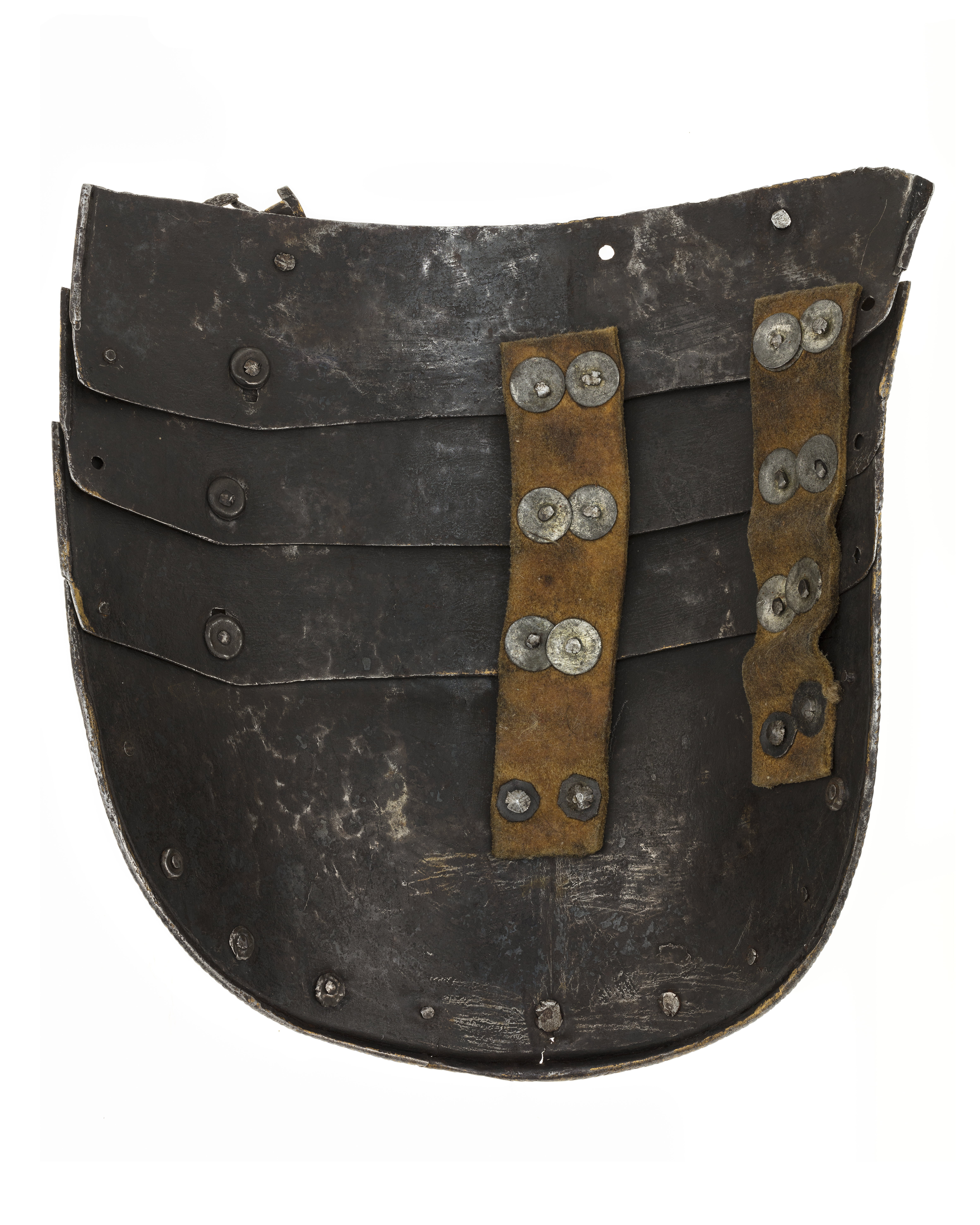 Driven stålplåt med på utsidan etsad och kallemaljerad dekor. Sammanlagt fyra delar. Av fyra välvda och svagt nedåt avsmalnande skenor. Övre skenan med i var sida en nitad sölja. Plattan med insvängda sidor och i mitten spets. Ramen vinklad uppåt 45 grader, framtill rektangulär och baktill rundad. Kanterna tandade och punsade. 10 mm från mittåsen ett runt hål , diam 4 mm, mot insidan. Driven låg mittås. Nedersta plåten rundad i nedrekant. Sidorna omvikta, rundsmidda och linjefilade. Nitar i sidorna. Skenorna rörliga genom förstorade nithål i sidorna. Insidan svärtad med kantband, b 20 mm, av mörkbrunt läder. Även två ljusbruna sämskade läderband, b 35 mm.