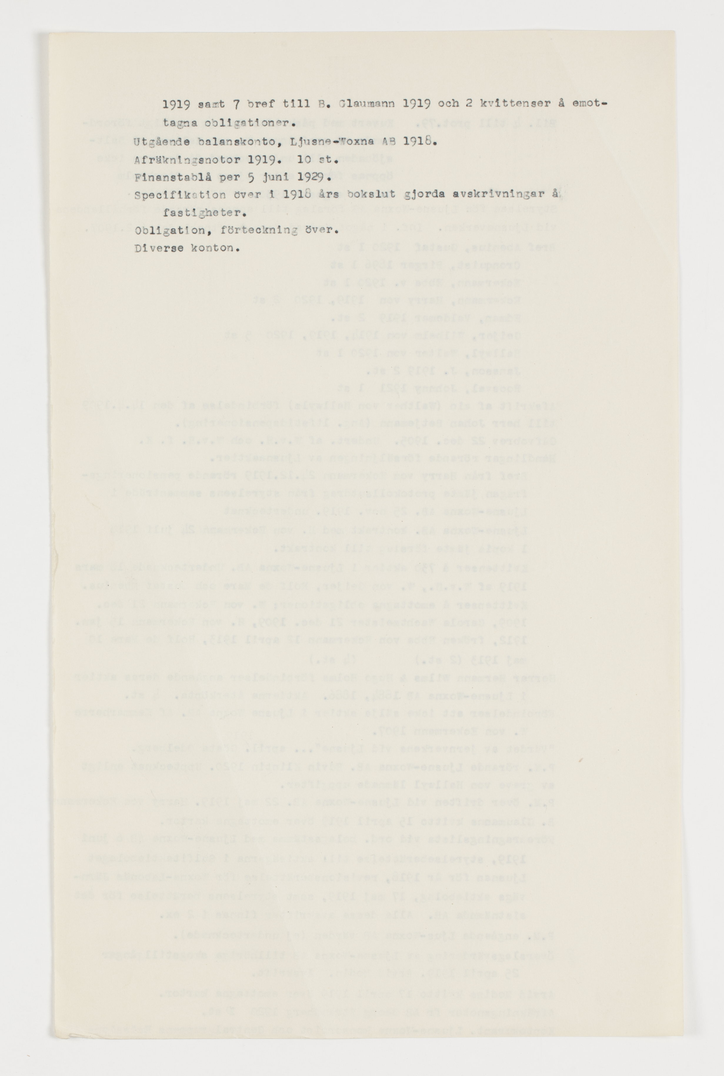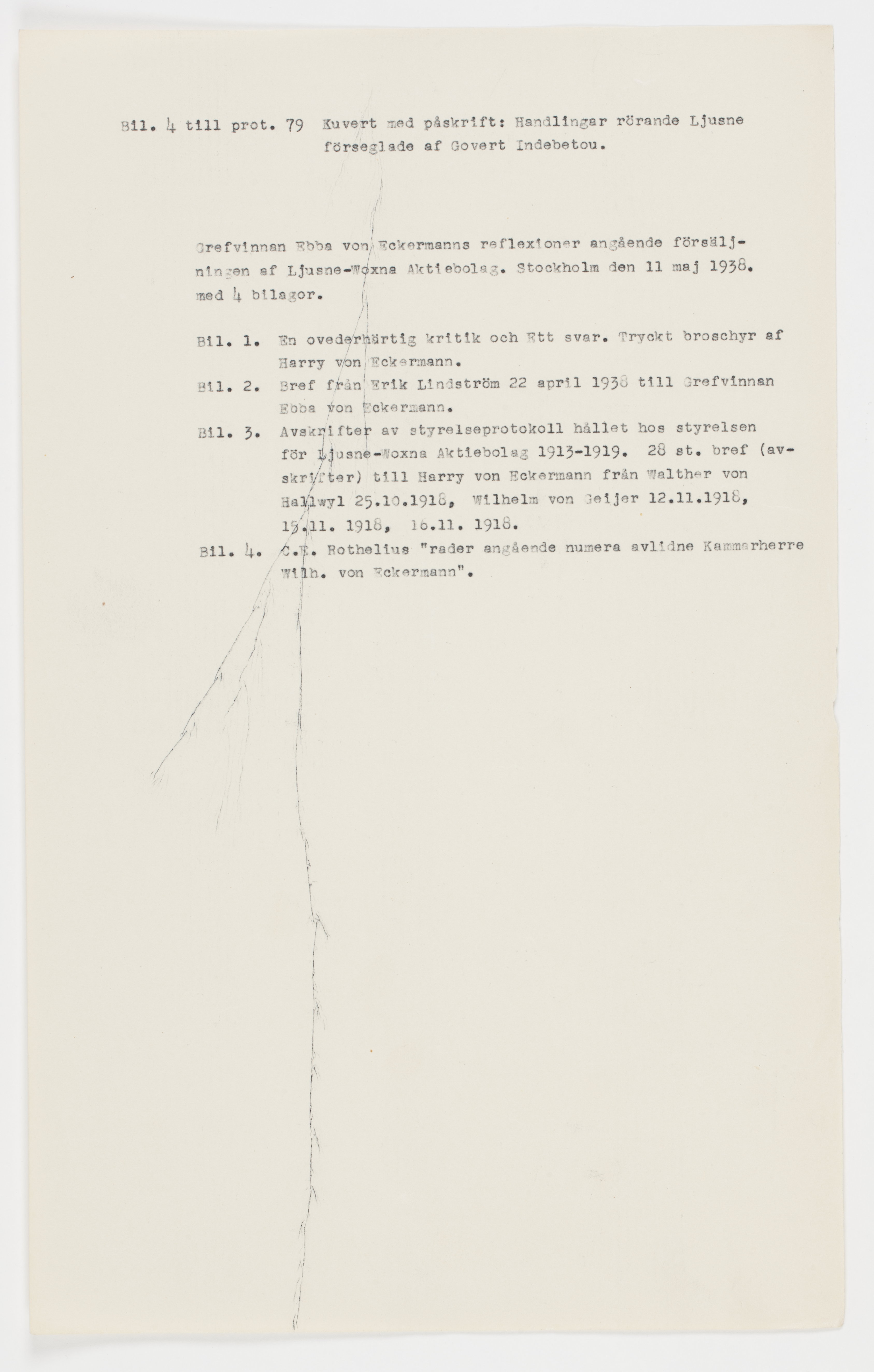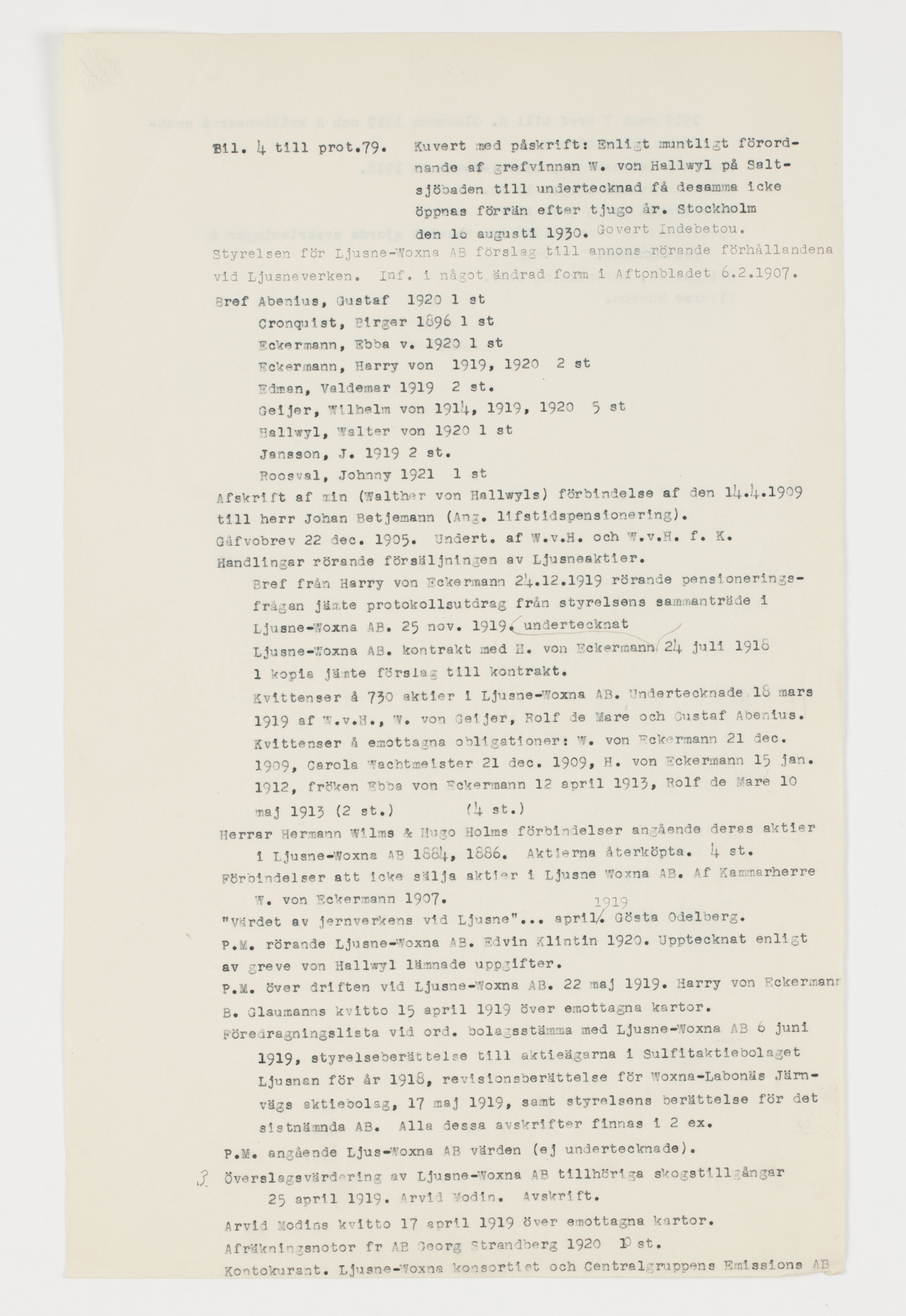 Handlingar rörande Ljusne-Voxna AB I 3 kuvert med påskrift: "Enligt muntligt förordnande af grefvinnan W. von Hallwyl på Saltsjöbaden till undertecknad få desamma icke öppnas förrän efter 20 år. Stockholm d. 11 (resp. 16) aug. 1930. Govert Indebetou". "Handlingar rörande Ljusne förseglade af Govert Indebetou". Första kuvertet: grevinnan Ebba von Eckermanns reflexioner angående försäljning av Lusne-Woxna Aktiebolag. Stockholm den 11 maj 1938. med 4 biligor. Bil.1. En ovederhärtig kritik och Ett svar. Tryckt broschyr av Harry von Eckermann. Bil. 2. Brev från Erik Lindström 22 april 1938 till grevinnan Ebba von Eckermann. Bil. 3. Avskrifter av styrelseprotokoll hållet hos styrelsen för Ljusne-woxna Aktiebolag 1913-1919. 28 st. brev (avskrifter) till Harry von Eckermann från Walther von Hallwyl 25.10.1918, Wilhelm von Geijer 12.11.1918, 15.11.1918, 16.11.1918. Bil. 4. C. E. Rothelius "rader angående numera avlidne kammarherre Wilh. von Eckermann". Andra kuvertet: Bil 4 till prot. 79 1- Utredning rörande förvaltningen av Lusne-Woxna Aktiebolag under åren 1913-1918. Sthlm 2 mars 1920 Gustaf Abenius, Edwin Klintin. 2- P.M. till undertecknads värdering av Ljusne-Woxna AB:s skogar. Sthlm 3 maj 1919. Arvid Modin. Avskrift. 3- Överslagsvärdering av Ljusne-Woxna Aktiebolag tillhöriga skogstillgångar. Stockholm 25 april 1919. Arvid Modin. Avskrift. 4- P. M. rörande södra Ljusne Jernverks skogar inom Söderala och Skog socknar i Gefleborgs län. Ljusne den 18 april 1919. 5- P.M. rörande taxering av Ljusne-Woxna Aktiebolags skogsegendomar. Woxna Bruk den 17 april 1919. Otto Nilsson jämte brev från Nilsson. 6- Lagfartsprotokoll, lagtima vartingmed Södra Helsinglands Östra tingslag. Mo Myskje år 1886. 7- Utlåtande om värdet av järnverkena vid Ljusne i april 1919. Genomslagkopia. 8- Bostäder Ljusne den 1 aug. 1919. Knut Blom. 9- Hultebo. Tillgångar och skulder till 1919. 10- August- & Marisgruvorna. Tillgångar och skulder till 1919. 11- Ramhäll. Tillgångar och skulder till 1919. 12- Förteckning över av Ljusne-Woxna Aktiebolag inköpta skogsfastigheter, under åren 1883-1909. 13- Instrument vid värdering av Ljusne.Woxna Aktiebolags skogar vid Ljusne. Stockholm den 31 juli 1919. Arvid Modin. 14- Södra Järnverket. 1909-1918. 15- Fastigheter 1909-1916. 16- Kättingtillverkningen. 1909-1918. 17- Hästar och nötkreatur 1909-1918. 18- Malmer 1909-1912. 19- Kolning och träoljefabriker 1912-1918. 20- Hamn och båtar 1909-1918. 21- Utgående balanskonton den 31 december 1918. 22- Hultobo gruvförvaltning 1914-1918. 23- Gruvfastigheter och inventarier 1909-1918. 24- Arbetarebostäder reparationer 1909-1918. 25- Sågverket 1909-1918. 26- Norra Järnverket 1909-1918. 27- Ångpannehus gaskraftcentral och elektricitetsverk 1909-1918. 28- Mek. verkstad gjuteri m.m. 1909-1918. 29- Motorfabriken 1913-1918. 30- Lösa inventarier 1909-1919. Tredje kovertet: Bil. 4 till port.79. Styrelsen för Ljusne-Woxna AB förslag till annons rörande förhållandena vid Ljusneverken. Inf. i något ändrad form i Aftonbladet 06.02.1907. Brev: Abenius, Gustaf 1920, 1 st Cronquist, Birger 1896, 1 st Eckermann, Ebba v. 1920, 1 st Eckermann, Harry von 1919, 1920, 2 st Edman, Valdemar 1919, 2 st Geijer, Wilhelm von 1914, 1919, 1920, 5st Hallwyl, Walter von 1920, 1 st Jansson, J. 1919, 2 st. Roosval, Johnny 1921, 1 st Avskrift av min (Walter von Hallwyls) förbindelse av den 14.04.1909 till herr Johan Betjemann (Ang. livstidspensionering). Gåvobrev 22 dec. 1905. Undert. av W. v. H. och W. v. H. f. K. Handlingar rörande försäljningen av Ljusneaktier. Brev från harry von Eckermann 24.12.1919 rörande pensioneringsfrågan jämte protokollsutdrag från styrelsens sammanträde i Ljusne-Woxna AB. 25 nov. 1919. Ljusne-Woxna AB. kontrakt med H. von Eckermann undertecknat 24 juli 1918 1 kopia jämte förslag till kontrakt. Kvittenser på 730 aktier i Ljusne-Woxna AB. Undertecknade 18 mars 1919 av W. v. H., W. von Geijer, Rolf de Mare och Gustaf Abenius. Kvittenser på emottagna obligationer: W. von Eckermann 21 dec. 1909, Carola Wachtmeister 21 dec. 1909, H. von Eckermann 15 jan. 1012, fröken Ebba von Eckermann 12 april 1913, Rolf de Mare 10 maj 1913 (2 st.) (4 st.) Herrar Hermann Wilms & Hugo Holms förbindelser angående deras aktier i Ljusne-Woxna AB. 1884, 1886. Aktierna återköpta. 4 st. Förbindelser att icke sälja aktier i Ljusne-Woxna AB. av Kammarherre W. von Eckermann 1907. "Värdet av järnverkerns vid Ljusne"....april 1919. Gösta Odelberg. P. M. rörande Ljusne-Woxna AB. Edvin Klintin 1920. Upptecknat enligt av greve von Hallwyl lämnade uppgifter. P. M. över driften vid Ljusne-Woxna AB. 22 maj 1919. Harry von Eckermann B. Glaumanns kvitto 15 april 1919 över emottagna kartor. Föredragningslista vid ord. bolagsstämma med Ljusne-Woxna AB. 6 juni 1919, styrelseberättelse till aktieägarna i Sulfitaktiebolaget Ljusnan för år 1918, revisionsberättelse för Woxna-Labonäs Järnvägs aktiebolag, 17 maj 1919, samt styrelsens berättelse för det sistnämnda AB. Alla dessa avskrifter finnas i 2 ex. P. M. angående Ljusne-woxna AB. värden (ej undertecknade). Överslagsvärdering av Ljusne-Woxna AB tillhöriga skogstillgångar 25 april 1919. Arvid Modin. Avskrift. Arvid Modins kvitto 17 april 1919 över emottagna kartor. avräkningsnotor fr AB Georg Strandberg 1920, 10 st. Kontokurant. Ljsne-Woxna konsortiet och Centralgruppens Emissions AB 1919 samt 7 brev till B. Claumann 1919 och 2 kvittenser på emottagna obligationer. Utagånde balanskonto, Ljusne-Woxna AB 1918. Avräkningsnotor 1919. 10 st. Finanstablå per 5 juni 1929. Specifikation över i 1918 års bokslut gjorda avskrivningar på fastigheter. Obligation, förteckning över. Diverse konton.