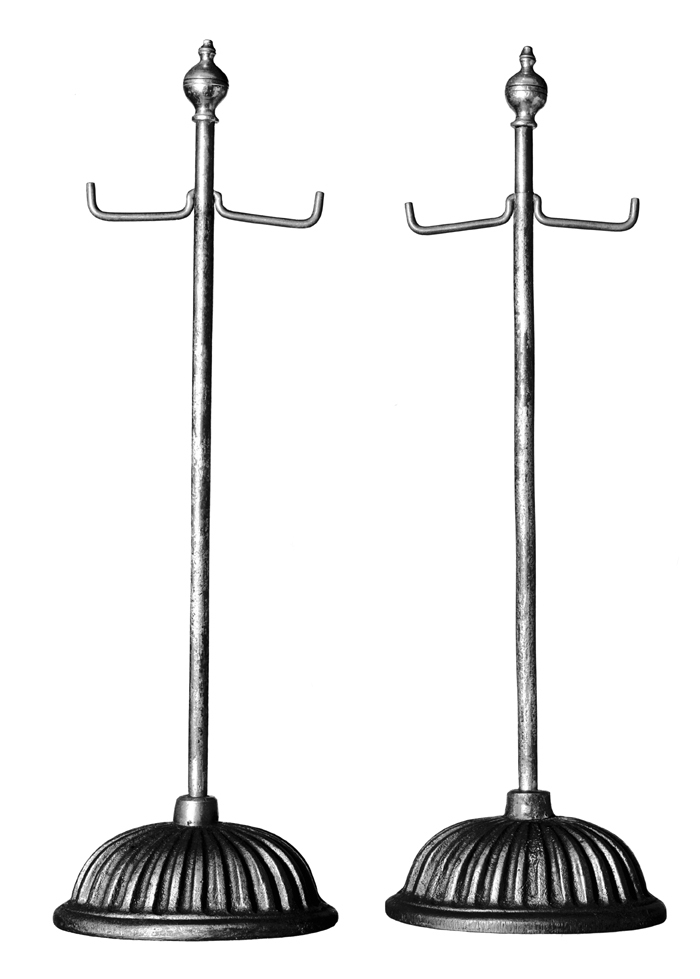 RINGHÅLLARE, (tilljärnspiselringar), två stycken Av järn. Bestående av en kupig oval gjuten fot, radiellt räfflad samt med utstående flackstavig kant; i fotens mitt en rakt uppstående rundstavig stång, vari upptill en tvärgående rundstavig arm av koppar, med i vinkel uppböjda ändar på båda sidor om stången samt överst på denna en profilerad knopp av mässing. Höjd: 47,5 cm. Fot, höjd: 7,2 cm.; längd: 15,4 cm.; bredd: 12 cm.