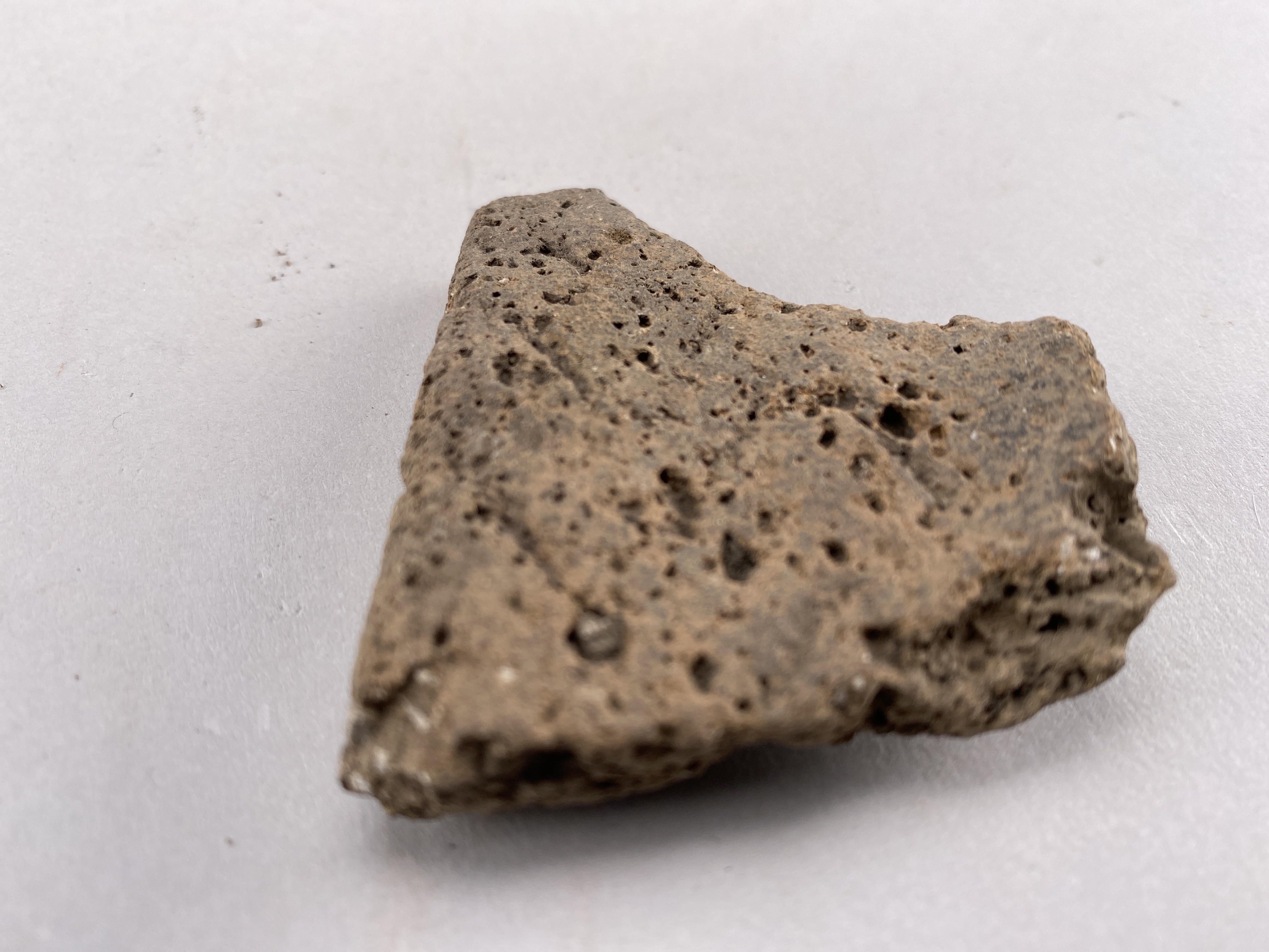 Glättad poröstgods fragment med snedställd linjedekor under mynningen.