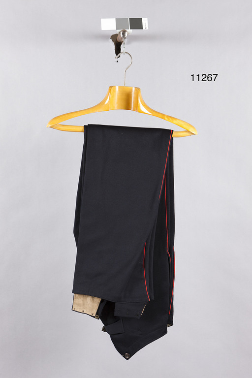 Långbyxor av mörkblått kläde, knäppning med gylf med sju knappar av brunt trä, d: 14 mm. I linningen sju träknappar, d: 17 mm. I baksömmen V-format sprund samt spänntamp dessutom infälld rombisk lapp runt baksömmen. Fickor i sidsömmen utmed denna röd passpoal. Nedtill hälla under foten. Hällan, 75 mm bred, knäppes med tre mässingsknappar d: 14 mm. Foder i linningen av grått siden. Byxbenen skodda nedtill med grovt linne. Fickor av lejonfärgad bomull.
