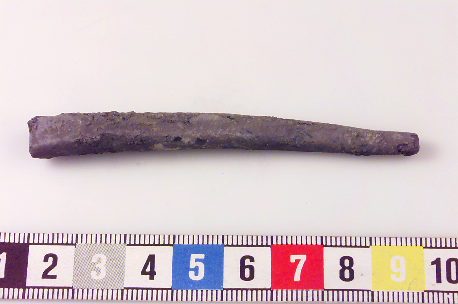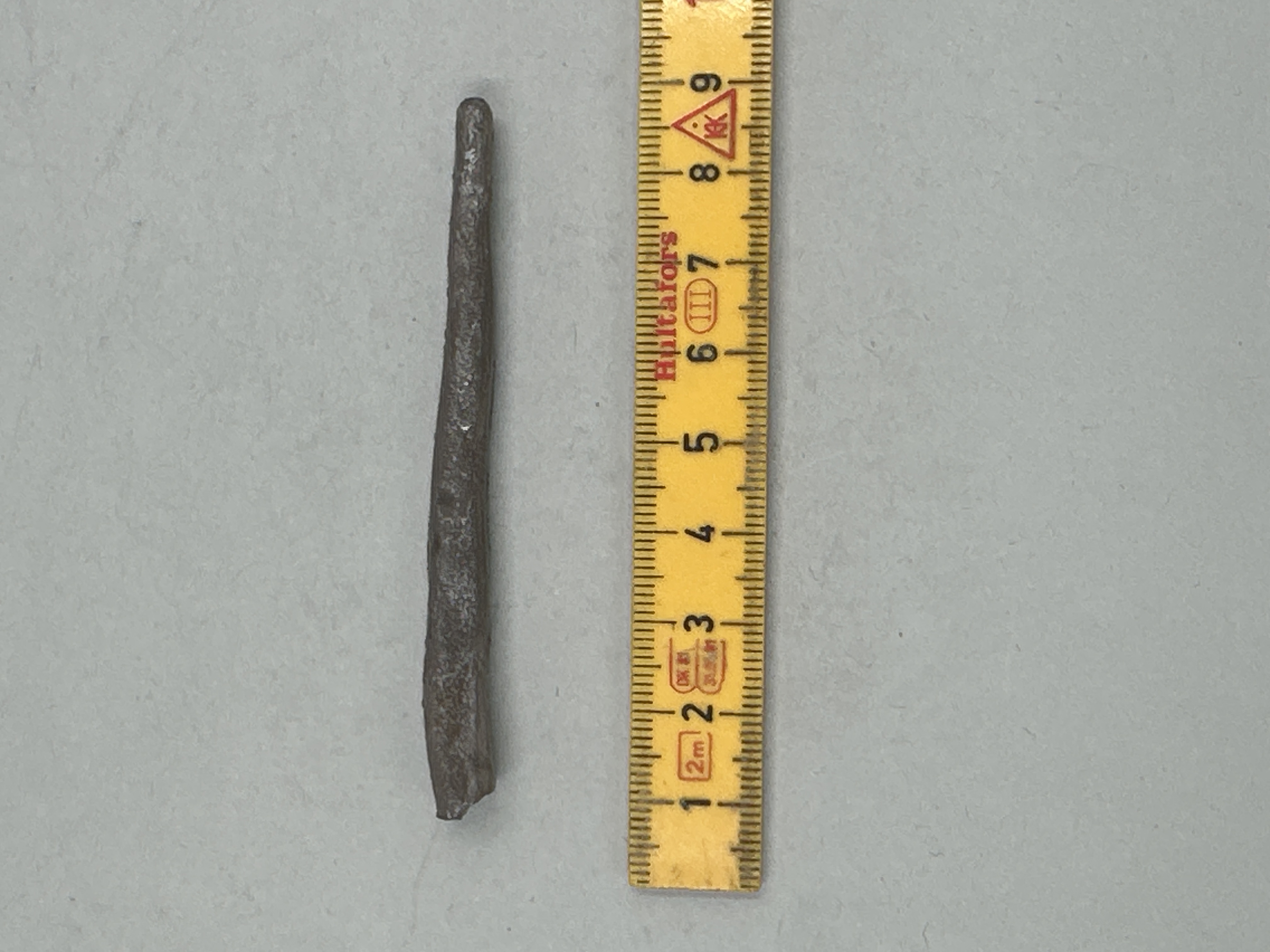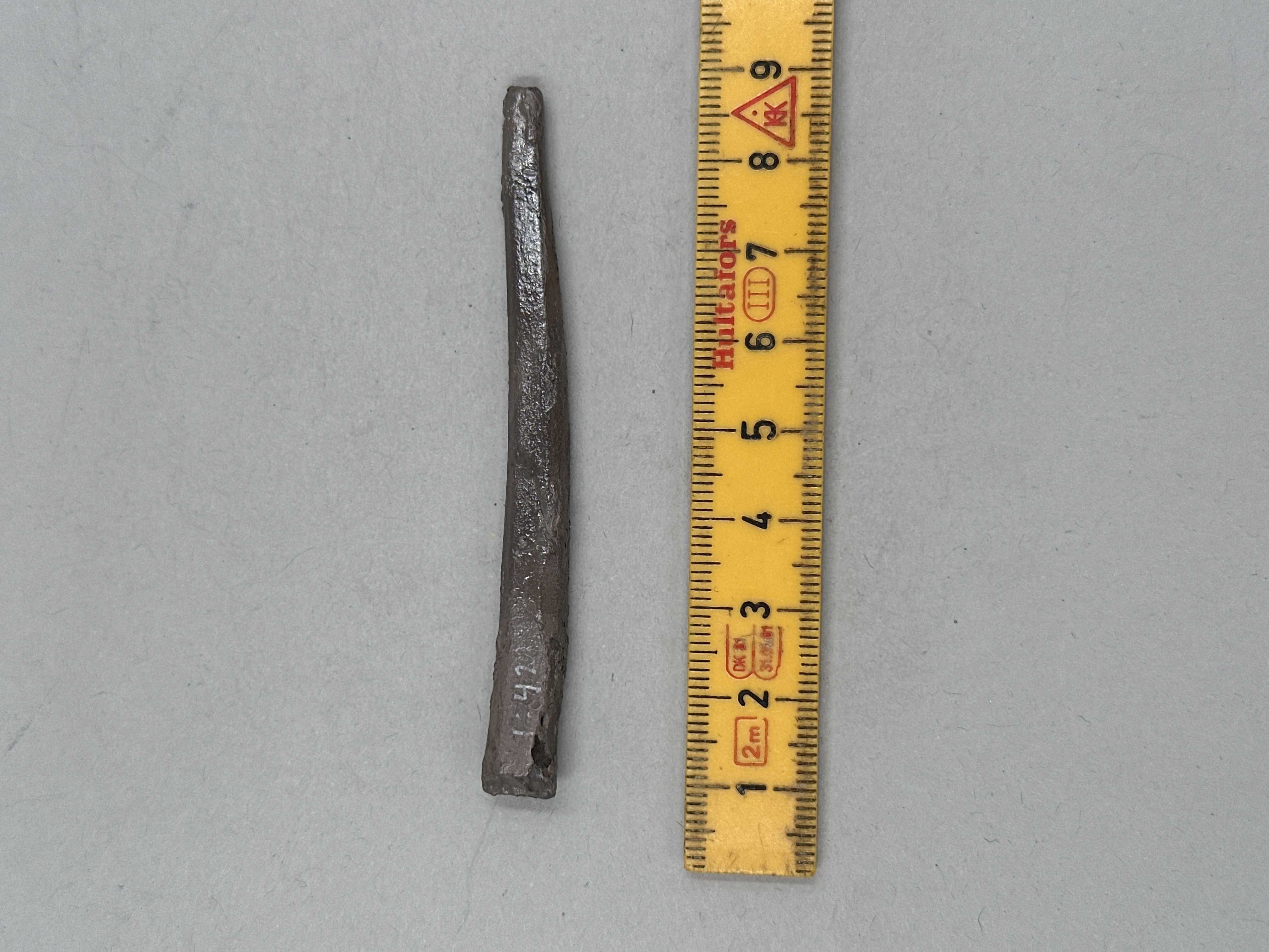 Ten med närmast rektangulärt tvärsnitt. Avsmalnande i ena änden, avbruten i den andra.