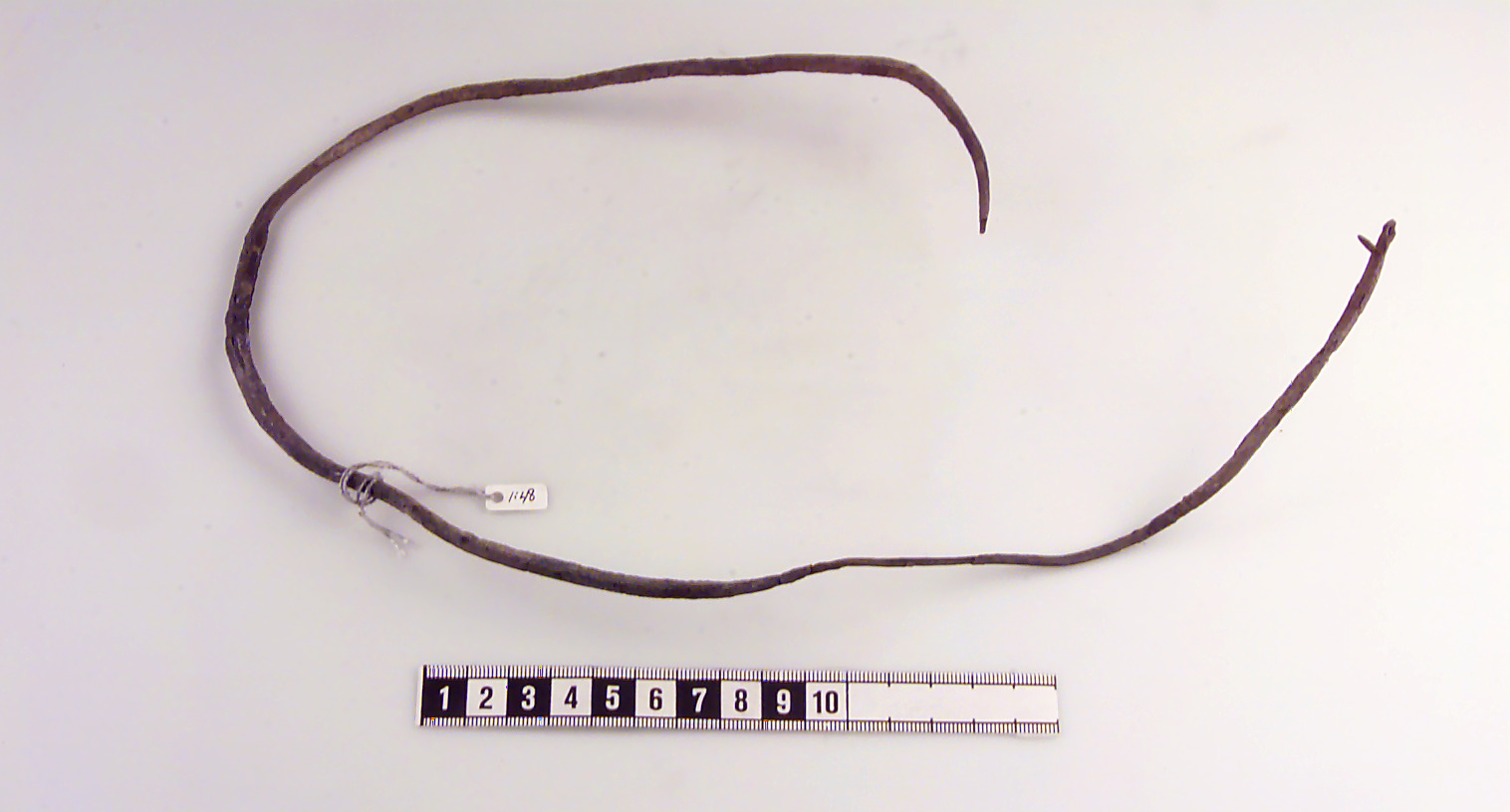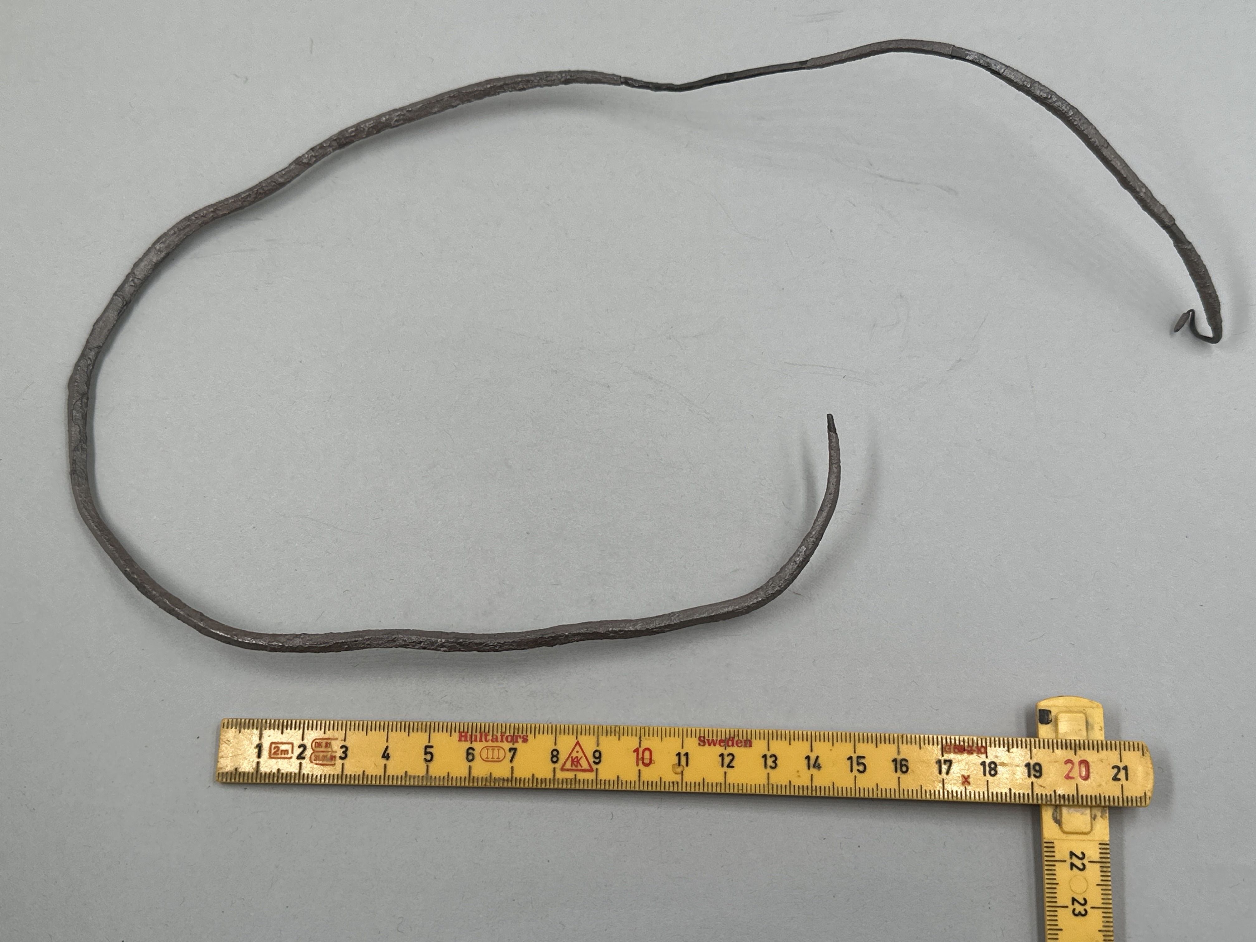 Ten med fyrsidigt tvärsnitt och spetsiga ändar. Böjd. Skadat ytskikt.