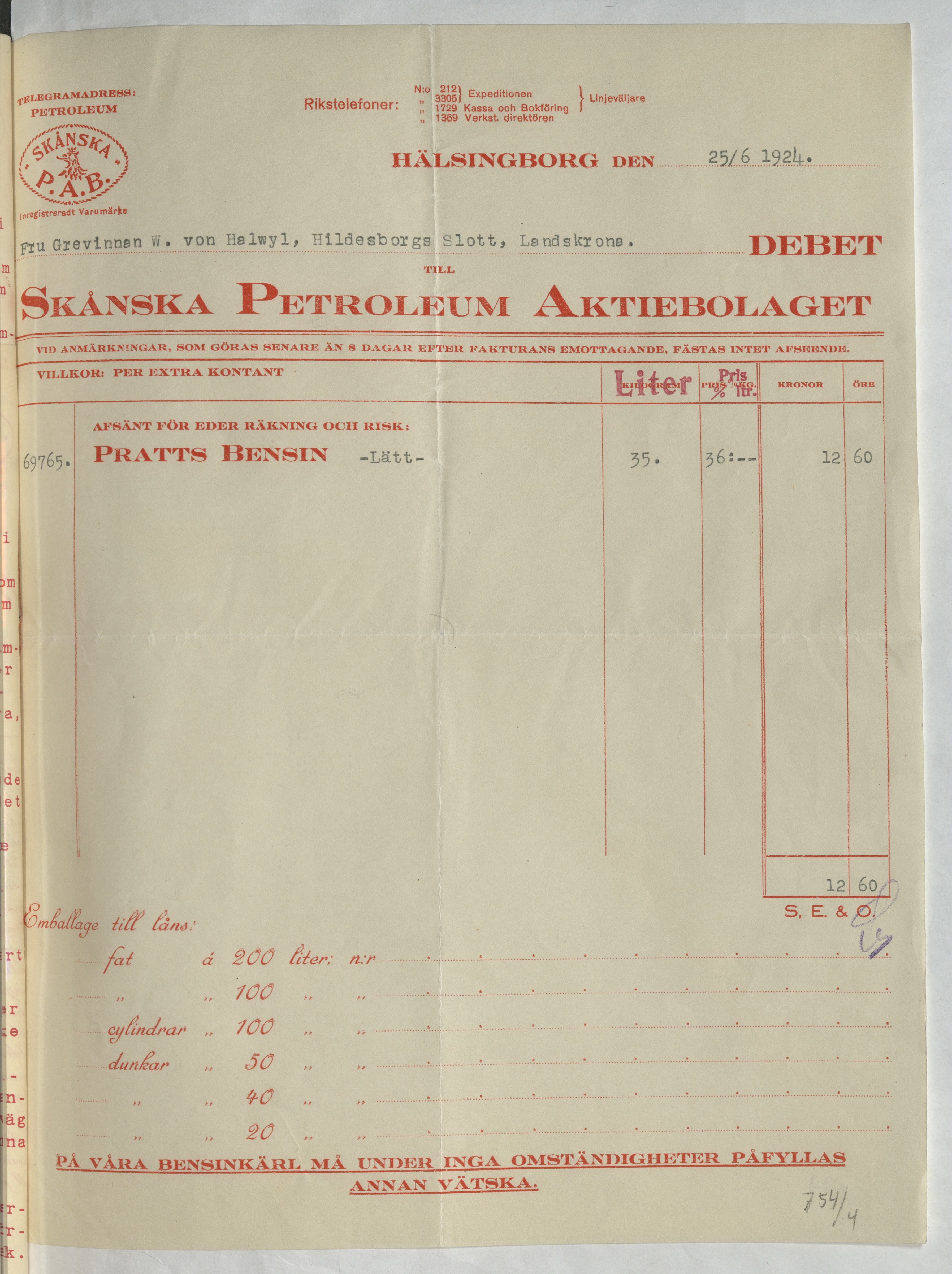 Kvitto från Skånska Petroleum Aktiebolaget. Gällande inköp av 35 liter bensin. Helsingborg, 1924.