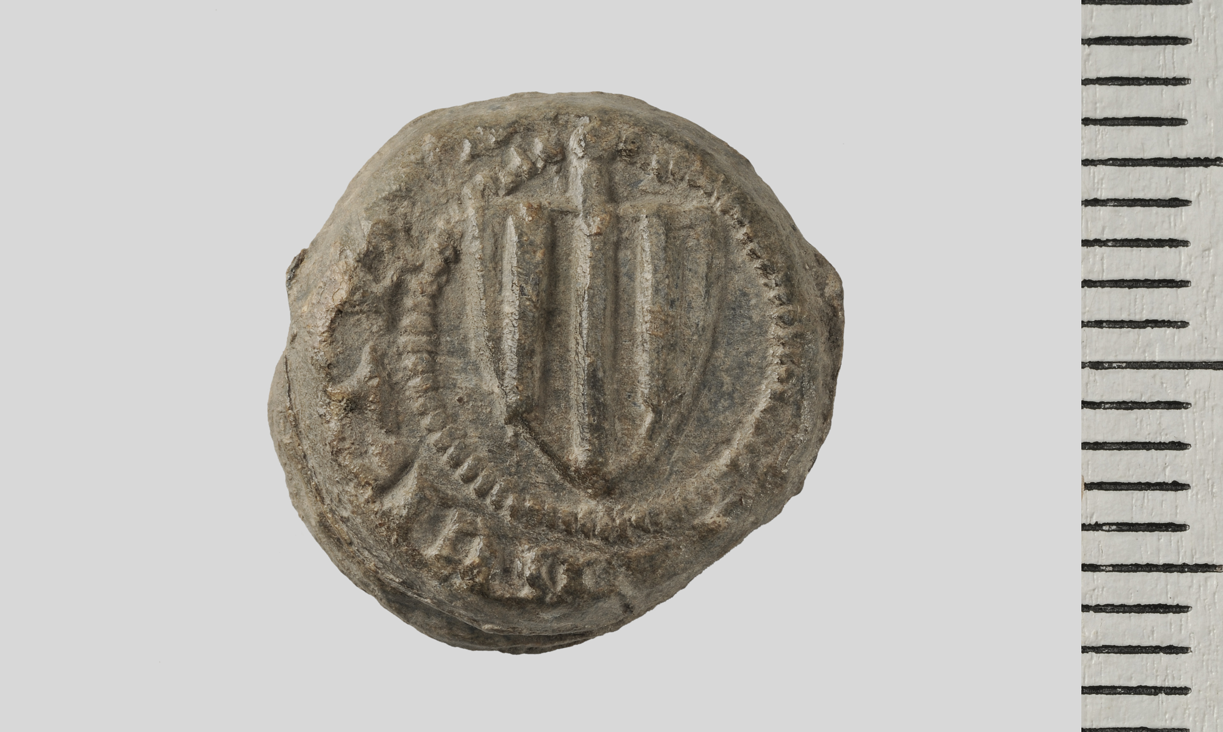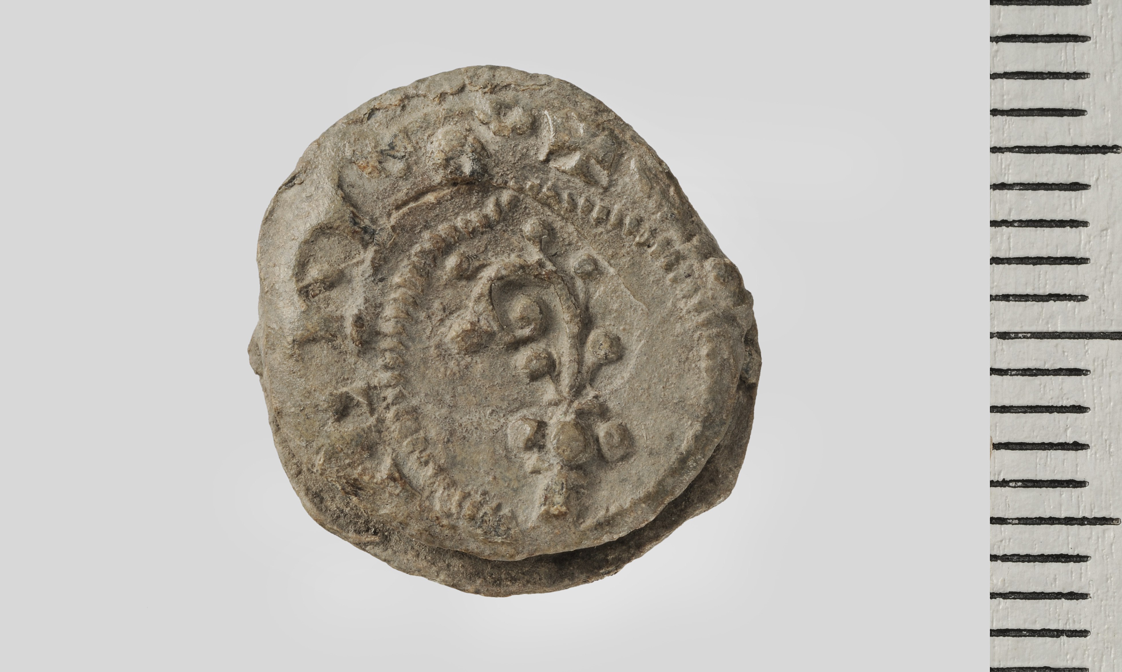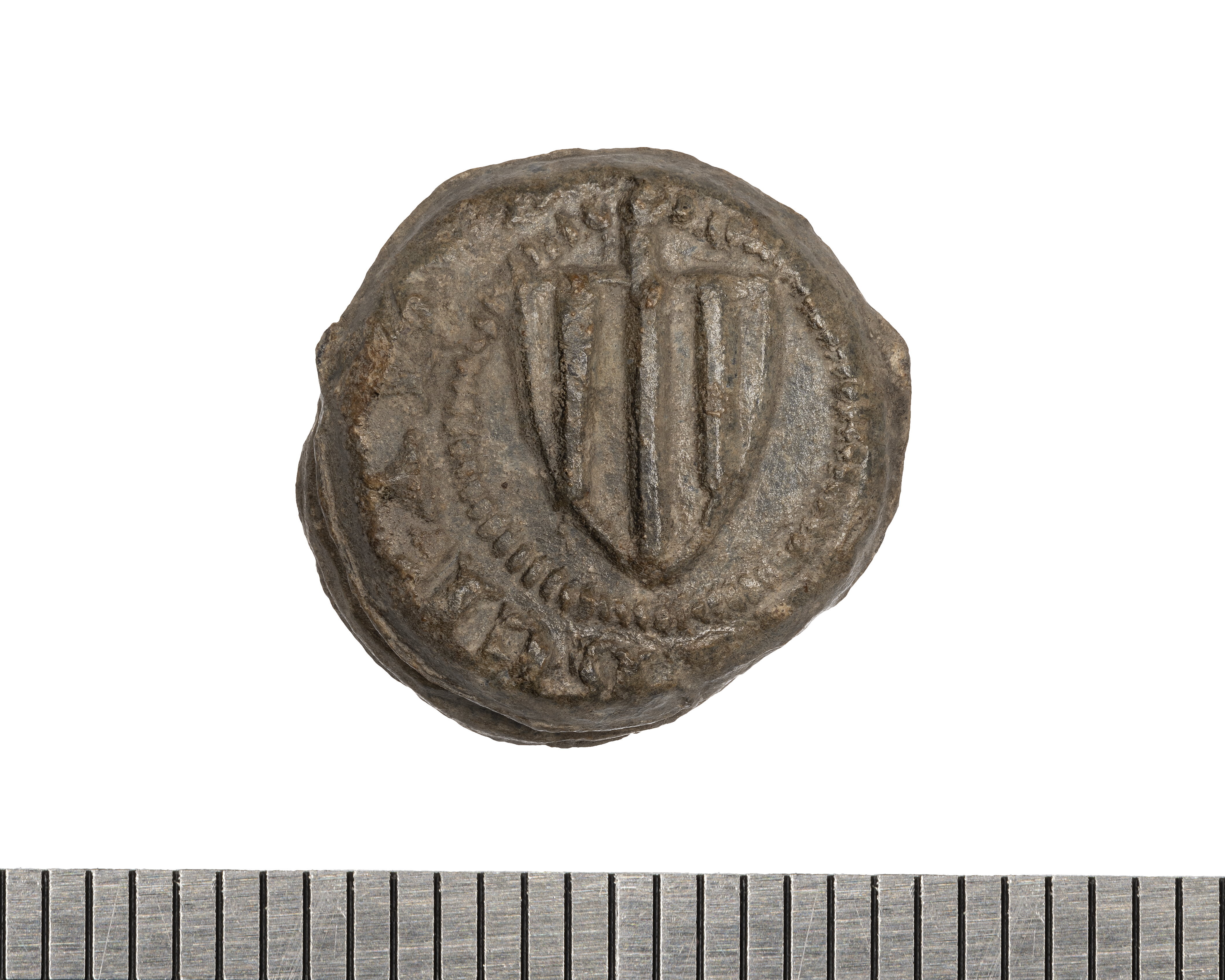 Varuplomb för textil från Mechelen. Plomben har en vapensköld på ena sidan och en biskopskräkla på den andra. Vapenskölden har stilistiskt daterats till 1300-tal.