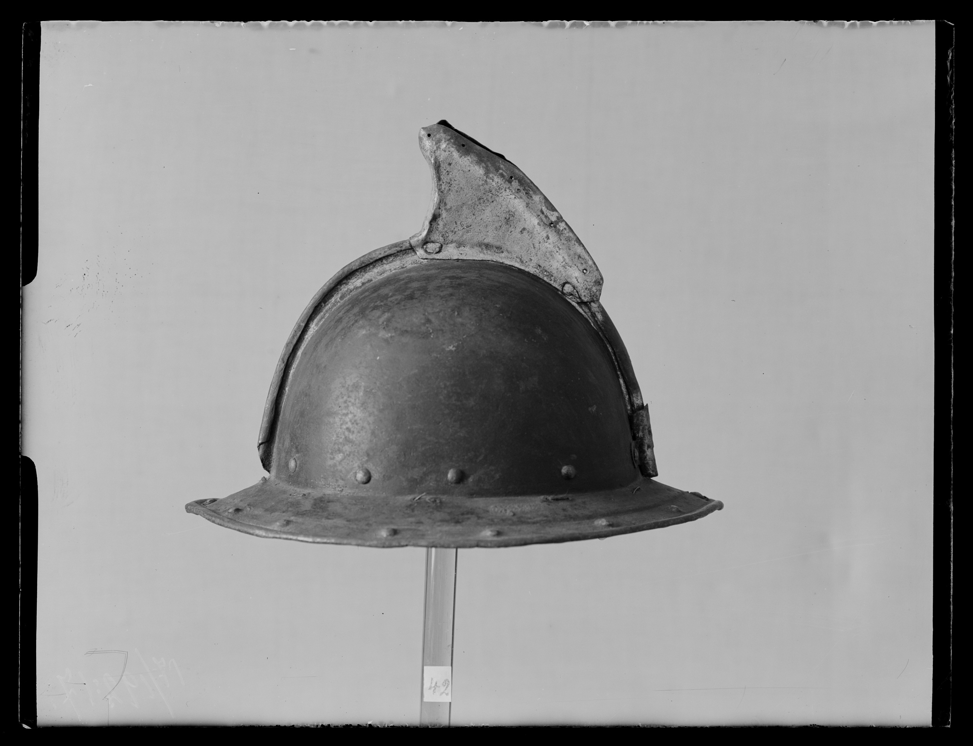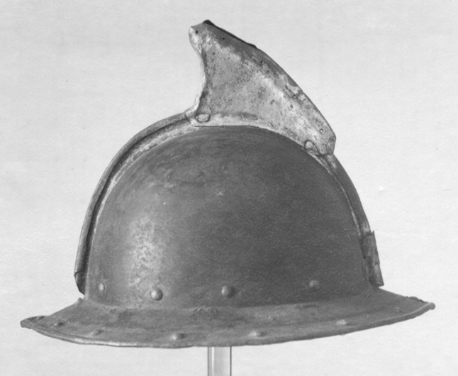 Hjälmen består av två sammanfogade "halvor". En låg kam löper över klockan. De två halvornas uppsmidda ytterkanter är lagda emot varandra och sedan är kanten vikt och rullad upptill, vilket skapar en stark söm i kammen. Baktill på hjälmen, fastnitad på var sida om kammen, sitter en plymhållare i plåtbleck med håll slagna i. I den låga sammanhållande kammen är en fenliknande hög kam fastsatt med två nitar, troligen fastsatt i samband med tornerspelen under det sena 1700-talet. Troligen vid samma tillfälle har hjälmen blivit svartmålad, med beige/guld-färg på brättets kant, kammen och "fenan". Nedtill har hjälmen ett nedåtsluttande brätte (ca 6 cm brett), vars nederkant är vikt inåt. Innanför kanten är en försänkning, i vilken löper en rad av "falska" punsade nitar. I klockans nederkant är en rad av järnnitar runtom. På insidan håller de med brickor fast en läderrem, vilken utgjort fäste till den gamla infästningen. I kanten där brättet möter klockan är en rad av små slagna hålpar hela vägen runtom. I toppen av klockan är ett liknande hålpar slaget. Dessa hål är troligen slagna i samband med att hjälmarnas renoverats för tornerspelen, dvs. inte från 1600-talet och brukningsperioden. Hjälmen har ett intakt foder, som är dåligt fastsatt, bestående av grov lärft, ihopsytt av två halvor. Under är en stoppning av linblånor. Fodret är fastsnört i de ovan nämnda hålparen med linnetråd. En smedstämpel framtill på brättet: C