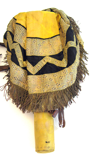 Hölster av svart läder, flaskformat med två iskurna hällor upptill. Genom hällorna är trätt ett svart läderband med ett rektangulärt spänne i ena änden samt med sex skärphål i motstående ände. Hölstret är nedtill klätt med gul sidendamast, kantat av en röd bård. Hölstret är i övre kanten på insidan fodrat med gult kläde. Över hölstret är trätt och fastspännt en rund hölsterkappa med en rund öppning upptill. Hölsterkappan är av gul sidendamast med svart sidedamast nedtill samt garnerad med galoner. Två breda galoner, b.55 mm, löper runtom i nederkanten. Mellan dessa är i ett viggmönster på det svarta sidentyget påsytt en smalare galon, b. 20 mm. Upptill kantas hölsterkappan av en omvikt galon, b. 10 mm. Samtliga galoner av silverlan och av förgyllda silverlan samt av gul silkestråd. En 58 mm lång frans kantar nedtill. Fransen är av tvinnad förgylld silvertråd samt av tvinnad rödaktig koppartråd och av buljoner av förgylld silvertråd. Under fransen sitter påsytt en kappa av förgyllda lan. Hölsterkappan är fodrad med beige säckväv. I nedre kanten sitter påsytt ett ljusbrunt läderband som spänts runtom hölstrets nedre del.