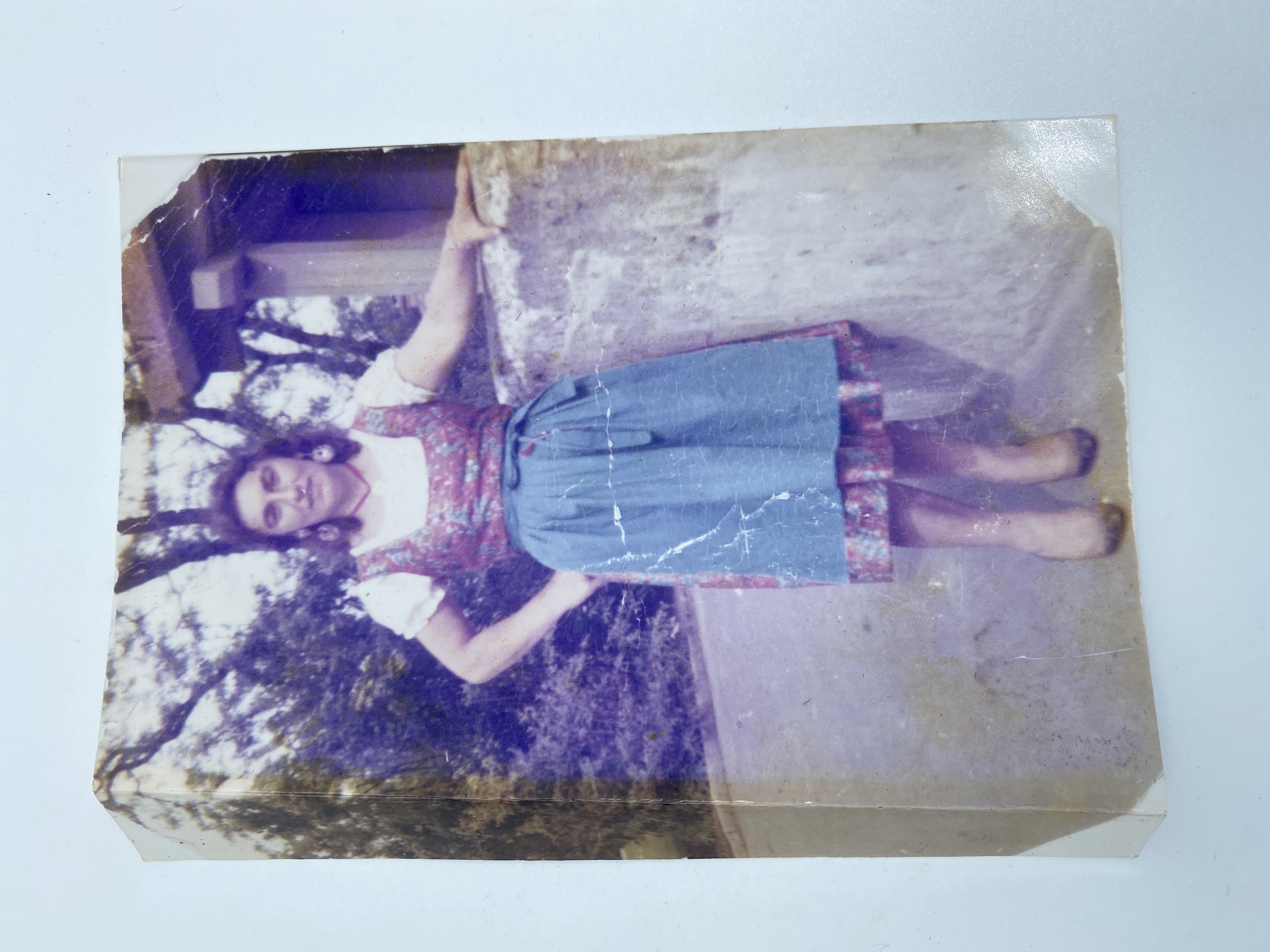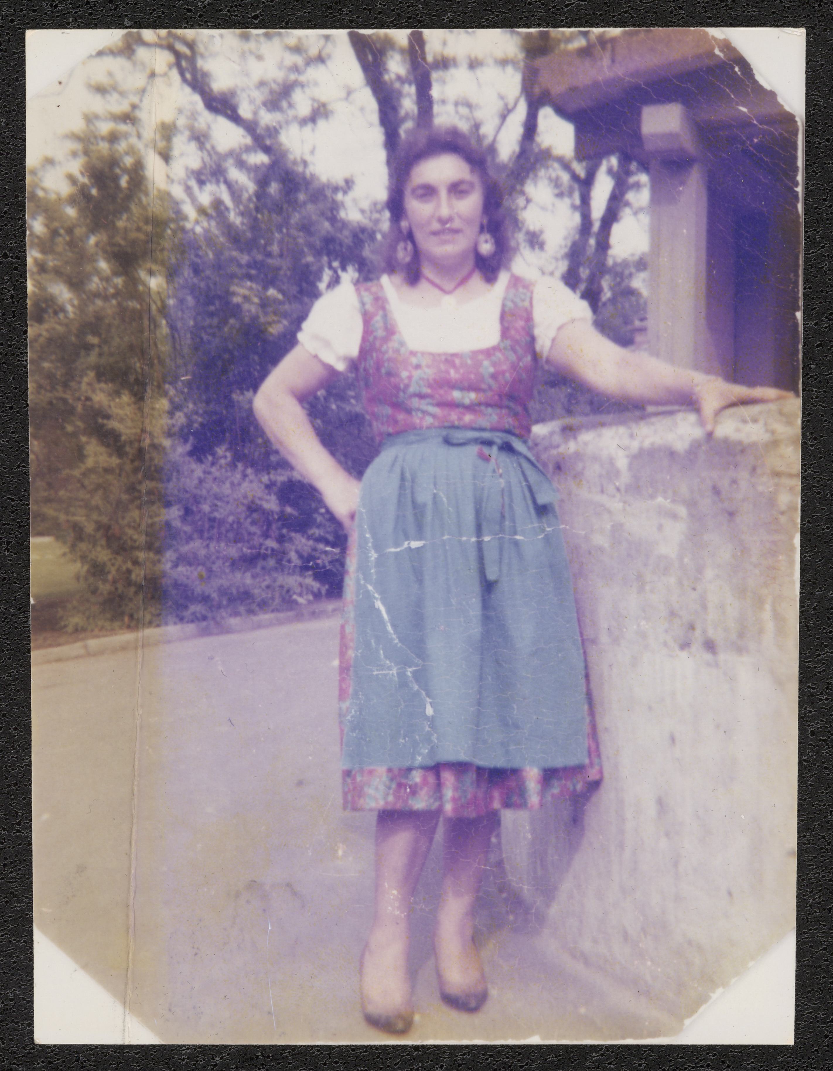 Anni Kaldaras (f. Laubinger) föddes som tysk Sinti, och överlevde folkmordet på romer under Förintelsen. Fotografiet är taget efter att Anni kom till Sverige i slutet av 1950-talet. På bilden står hon vid en betongmur med ena handen vilande mot murens ovansida. Fotografiet är vikt längs ena långsidan, och förefaller vara en kopia av en skadad originalbild. Sökningar i Arolsen Archives visar att Anni deporterades från den tyska orten Neumünster i provinsen Schleswig-Holstein den 16 maj 1940 till koncentrationslägret Belzec (Troligen Belzec I) i östra Polen den 16 maj 1940. Hon finns därefter registrerad i ”KZ Grichow” (troligen ett mindre koncentrationsläger) och därefter befriad i Lublin 22 maj 1944. Deportationen till Belzec överensstämmer med deportationen av 1140 Sinti till Belzec från nordtyskland under våren 1940. Befrielsen i Lublin överensstämmer med tiden för tömningen av dödslägret Majdanek som pågick under våren 1944, fram till befrielsen i juli. Varför Anni befriades istället för att flyttas till ett annat läger framgår inte av arkivkällorna.