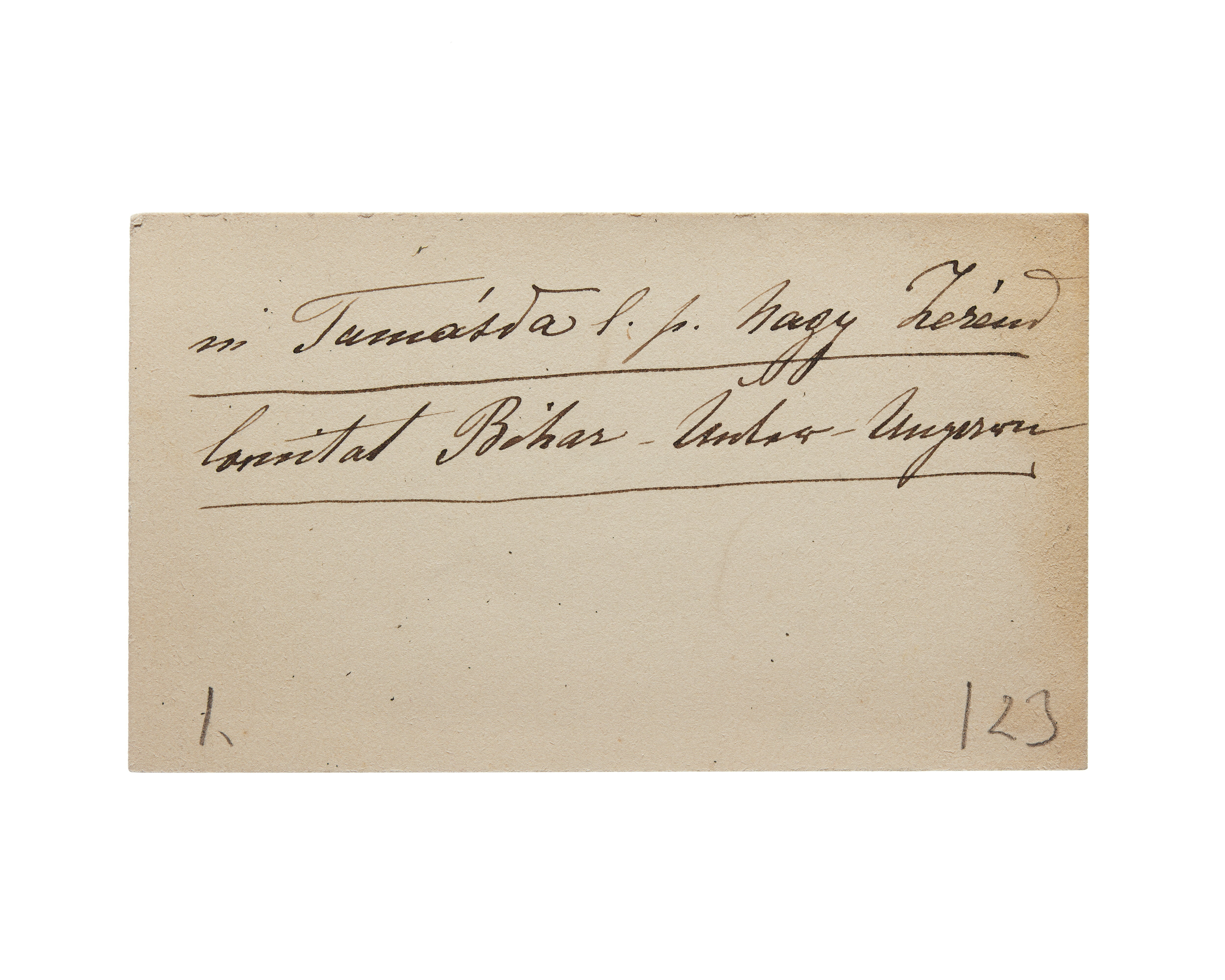 Ett visitkort från Baronne Bors, Nee Comtesse Lazar, Ungern. Handskrift (bakom kortet) ".....".