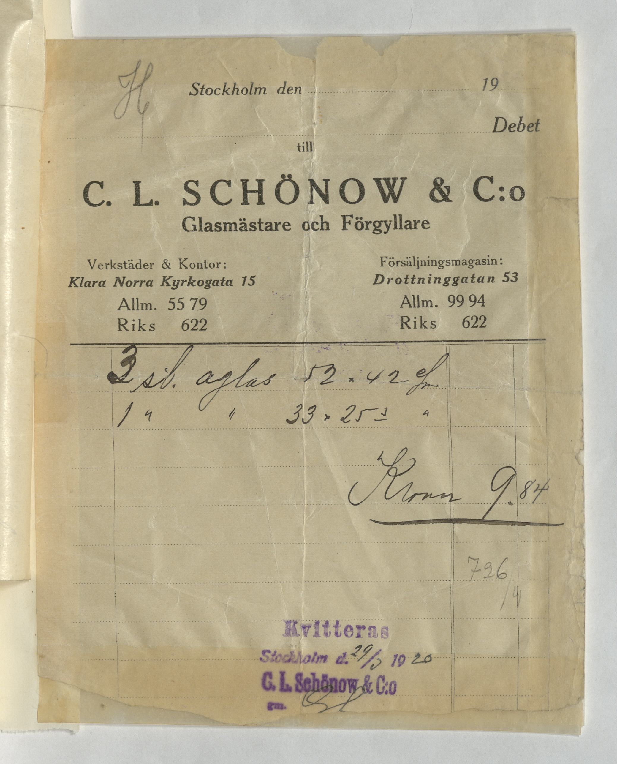 Kvitto från C. L. Schönow & Co. Glasmästare och Förgyllare. Stockholm, 1920.