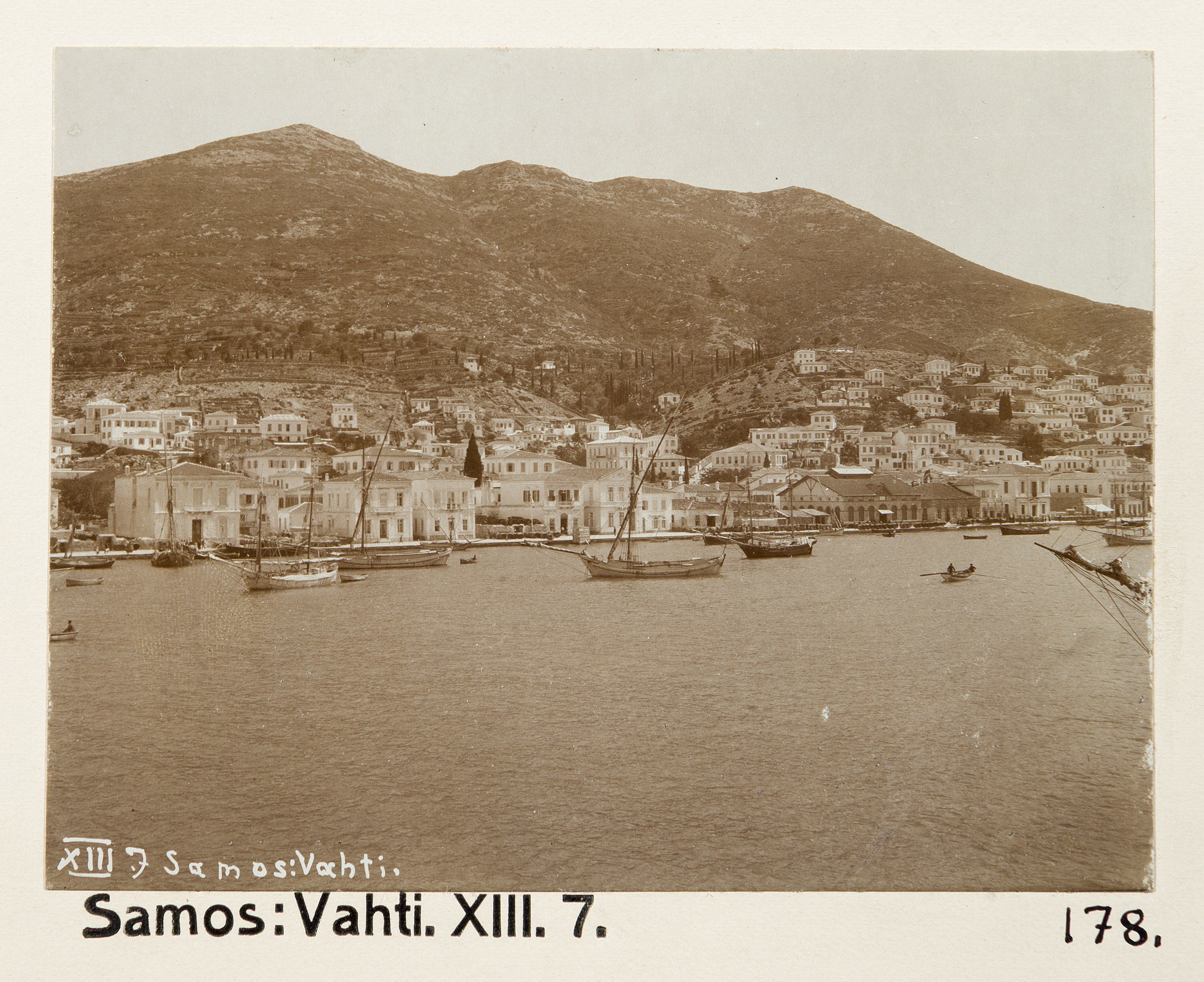 Vy över Vathy, Samos. Text på originalet: "XIII.7. Samos: Vahti." Fotografierna LXVI:N.01.-180. kommer från resan till Palestina och Syrien som Wilhelmina och Walther von Hallwyl gjorde den 30 mars-27 april 1901. De lämnade Sverige den 5 november 1900 för Egypten, där de stannade till den 28 mars 1901, då de fortsatte till Palestina. Med på resan var Wilhelminas sällskapsdam, fröken Ida Uhse. Den 27 april fortsatte de till Turkiet och Mindre Asien. De mindre fotografierna (utom de från Samos) LXVI:N.90.-100. är tagna av Wilhelmina själv, under en resa till häst från Jerusalem till Damaskus 8-20 april 1901. Övriga fotografier är inköpta av Wilhelmina i Jerusalem, Damaskus och Beirut. Alla uppgifter kommer från Ida Uhses reseanteckningar.