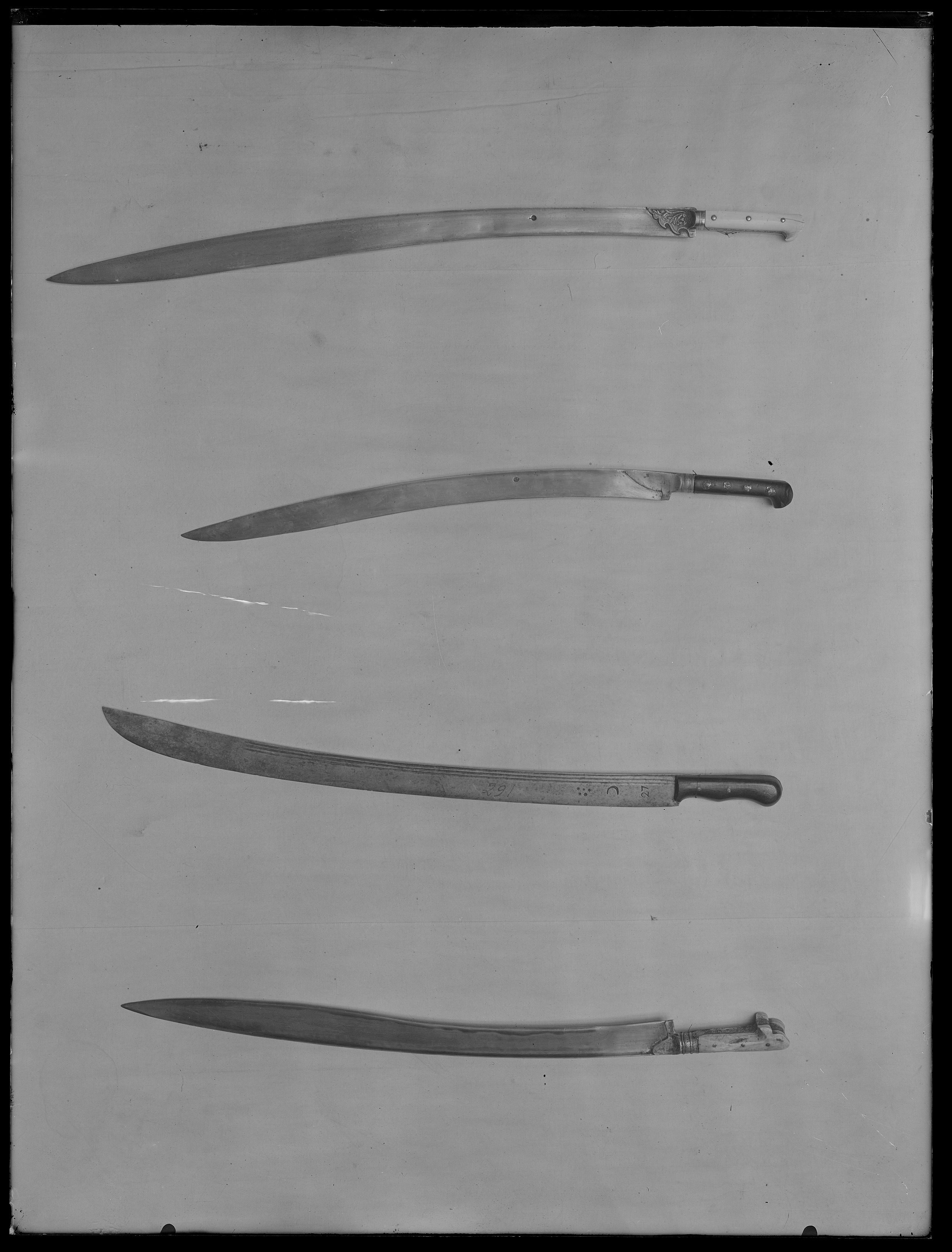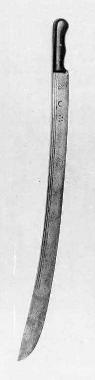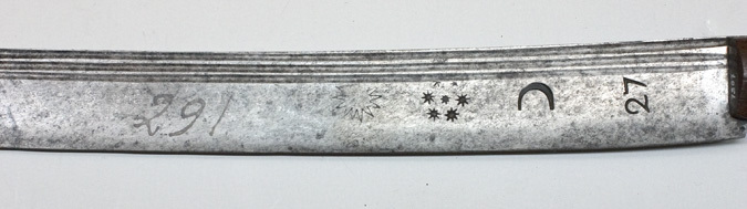 Fäste bestående av två halvor av ädelträ fästade genom tången med tre nitar. Framkanten något profilerad (för fingrarna). Klinga bred, något bredare mot spetsen, böjd med tre hålkälar på båda sidor, utmed ryggkanten. Hålkälarna ca 505 mm långa. På insidan vid basen inslaget: "27" halvmåne och en grupp med stjärnor samt sol(?) därefter med svart: 291.
