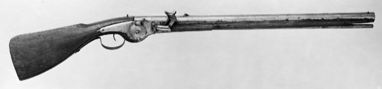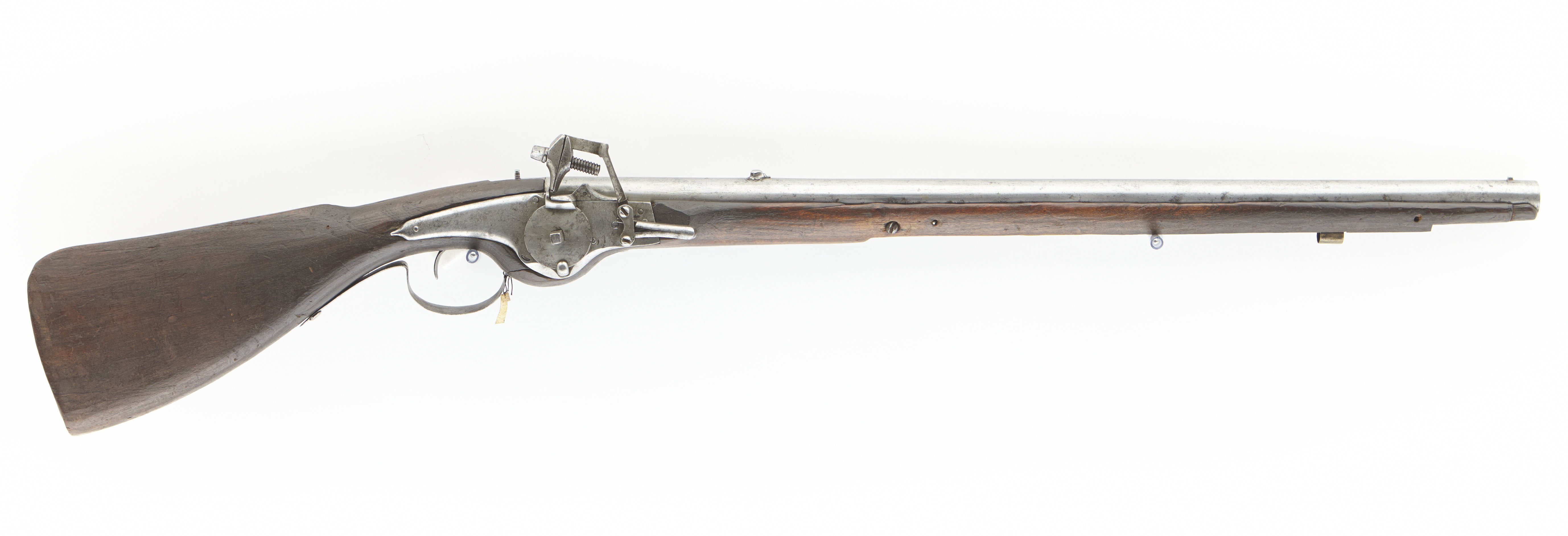 Rund, slätborrad pipa av stål. Kort, rakt, baktill tvärt avskuret svansskruvblad. Riktmedel: Hjärtformigt sikte, inlaxat stolpkorn av stål. Fästning: Två häften, pipan fäst med krysskruv underifrån samt ett (ursprungligen två) pipstift (spik). Hjullås med välvt låsbleck, baktill avslutad med liten spets. Utvändigt hjul fäst med studel kl. 6. Fängpanna med rundad undersida, låg, rak krutskärm, fängpannelock med rörlig arm. Hane böjd i vinkel, kropp med fasad kant, fyrsidig hals, närmast rektangulära käkar, underkäken lås, käkskruv med kubiskt huvud. Hanfjäder med rundade kanter på utsidan, B-formig studel. Fästning: Två, ursprungligen tre låsskruvar (den i mitten saknas). C-formig avtryckare. Helstock av brunbetsat trä (alm ?), kolv med rak, plan rygg som fortsätter ned som kolvände, svagt utbildad näsa, rundad, svängd buk. På anslagssidan inskuret ägar/användarnamnchiffer H N (N H ?, ligatur, N spegelvänt). Beslag av stål, karbinstång med ring, framtill fäst med skruv genom framstocken, baktill en fästplatta med rundade ändar, l: 105 mm, ursprungligen fäst med de två bakre låsskruvarna. En liten, bandformig rörka. Bandformig varbygel med något fasade kanter, framtill fäst med krysskruven, bakre armen fäst med spik med oregelbundet huvud.