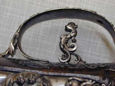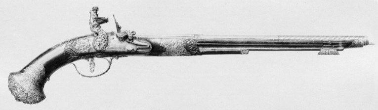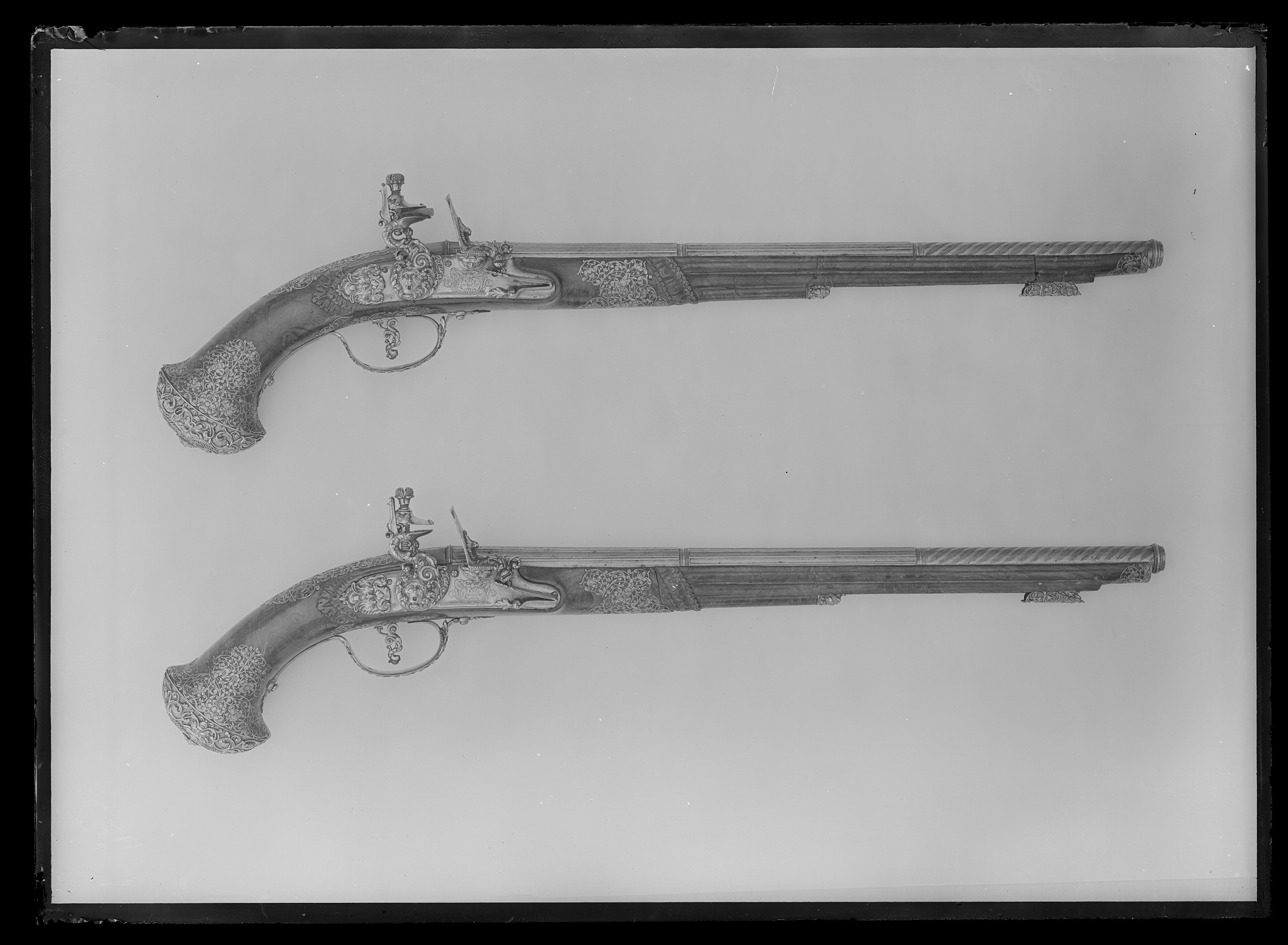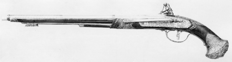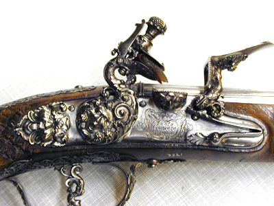 Slätborrad pipa av stål, kammaren åttsidig med profilerade åsar. Pipans främre del spiralvriden, mellanpartiet sextonsidigt. På kammaren signatur: "LAZARO LAZARINO COMINAZZO". Fästning: Tre häften. Pipan fäst med krysskruv samt tre pipstift av stål. Flintlås med välvt låsbleck med kraftigt ciselerad dekor i form av en maskaron på låsbleckets bakände liksom på hankroppen. Hane med lös överkäke, på hanhalsen en bevingad genie. Rundad fängpanna med dekor i form av en maskaron. Batteri med bevingad genie på eldstålsryggen. Batterifjäder med enkelt fjäderlöv. På låsblecket nedanför fängpannan en graverad kartusch med signatur: "Paolo // Francese // Brescia". Fästning: Två låsskruvar, den bakre även fäste för bältehaken.Genombruten avtryckare med ett profilerat ansikte. Helstock av valnöt med beslag av stål. Kolvkappa med ovalt tvärsnitt, reliefdekor i form av växtslingor och maskaroner. I låsurtaget stämplat A. Inläggningar, "trafori" i form av ett rankverk vid kolvkappa vid kolvkappan, som sidbleck, på framstockens bakre del samt som näsband. I sidblecksdekoren en jaktscen med en knäböjande jägare med lyft bössa, siktande på en hjort. Två ciselerade rörkor. Varbygel med växtdekor, kluven framstolpe. Bältehake med ciselerade ändar.