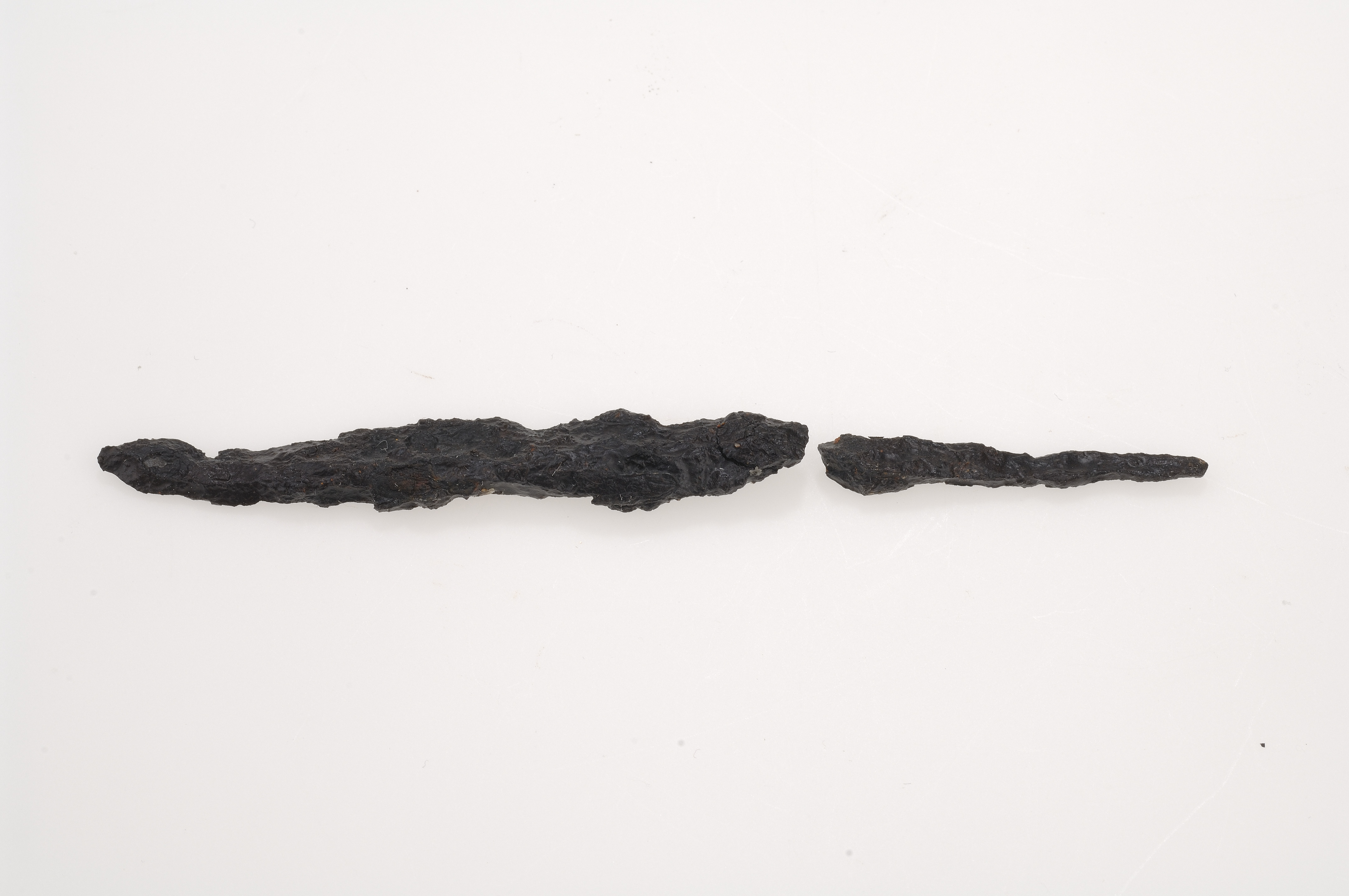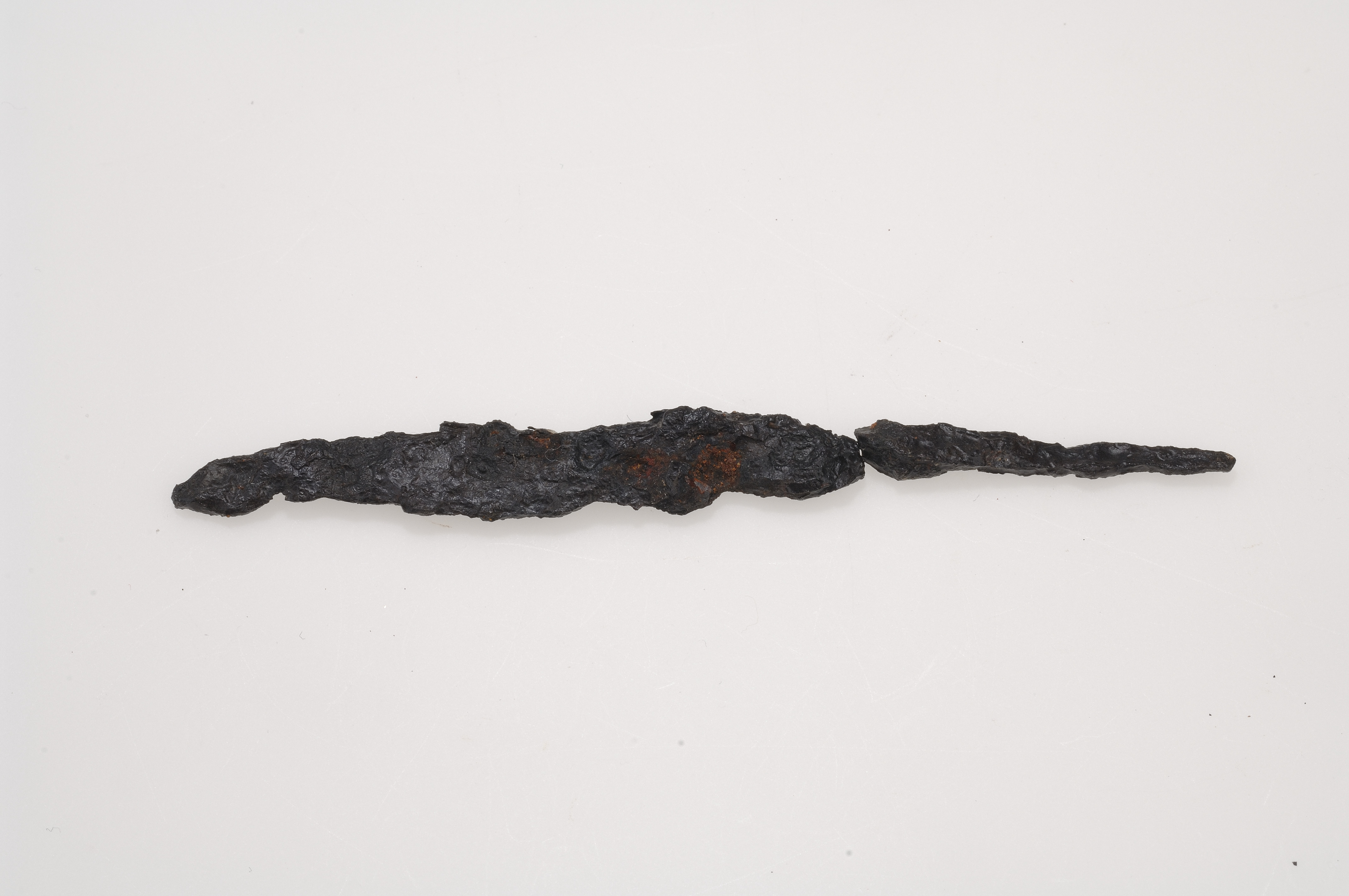 smal järnkniv med bevarad silketråd längs bladet, spetsig rygg och rak egg, bladet ca 65 mm l, liten platt fyrsidig tånge, 31 mm l och 2x4 mm i diam