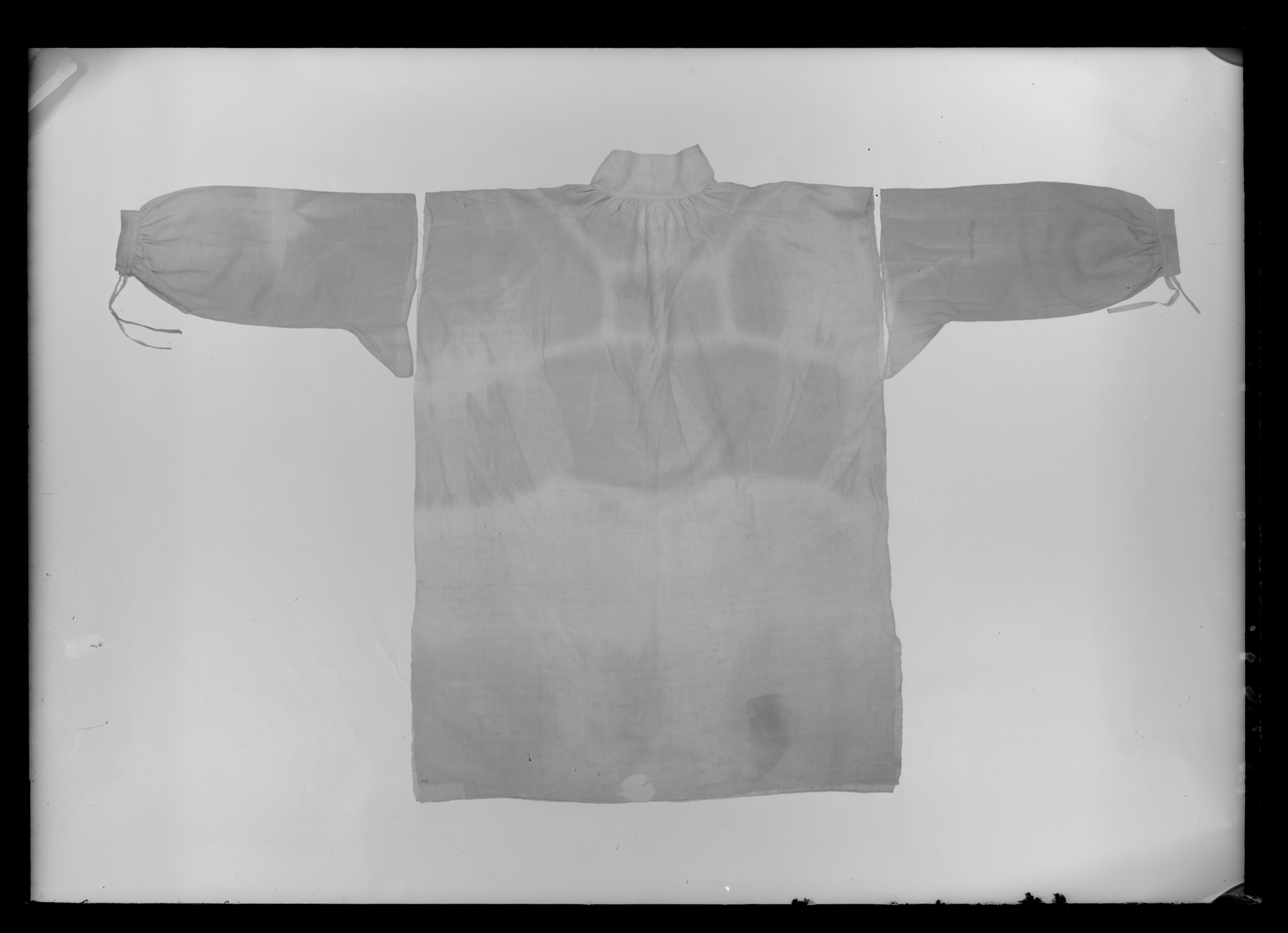 Rakt skuren skjorta av naturvit linnelärft, sydd av ett fram- och ett bakstycke med sömmar i sidorna. Det förekommer ett sprund i sidsömmarna i nederkanten, l. 280 mm. Skjortan har en ståndkrage, h. 72 mm, under vilken vidden något samlad så att det bildats små veck. Mitt fram förekommer ett sprund, l. 284 mm. Bak på vardera skuldra sitter en liten vit linnelapp. Skjortan syddes tillsammans med Morakarlens dräkt samt tre andra dräkter till det museum som inrättades på 1750-talet, i Ornässtugan där gustav Vasa övernattat. Dräkterna syddes av skräddare Erik Säterbeck. Dessa plagg fanns utställda i Ornässtugan fram till 1950-talet då de plockades ned för konservering i Livrustkammarens konserveringsateljé.