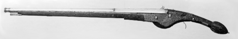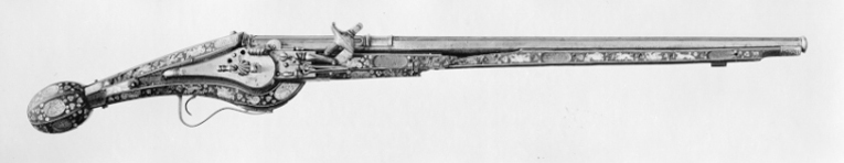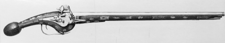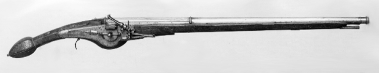 Rund, räfflad pipa av stål med svarvad trumf, åtta räfflor, högerräffling. Profilerad list på pipbasen, på kammarens ovansida fyra räfflade lister, framtill avslutade med ring, mellan listerna tre skålade räfflor, den mellersta kortast. Längs översidan på resten av pipan en räfflad list fram till en tunn ring, 20 mm från mynningen. Kort, rakt, baktill tvärt avskuret svansskruvblad. Stämplar: På kammarens ovansida en stämpel: R P L (P L ligatur, LRK vägl.1921:354). På pipans undersidaen otydlig stämpel liknande en krönt nyckel(?). Fästning: Två häften, pipan fäst med krysskruv samt två ej ursprungliga pipstift av trä. Hjullås av fransk typ med slagfjäder fäst på låsblecket. Plant låsbleck med fasade kanter, nedsvängt vid hjulet, bakänden rundad med yttäckande dekor av skålade romber. Resten av låsblecket täckt av gles graverad rankdekor. Utvändigt hjul fäst med åsad brygga, skruvar kl. 3 och 9, stort, urneformigt löv, avslutat med smal, balusterformig spets, l: 45 mm. Fängpanna med rundad nederkant, rak krutskärm med svängd framsida. Fängpannelock med rörlig arm, grepp med hög, rak framände, svarvad spets, tryckknapp med välvt skruvhuvud. Hane med åsad kropp, nertill två kulor, avbruten vid hanhalsen, hals och huvud saknas. Hanfjäder med delvis fasade kanter, bladdekor, skålning i vinkeln. Balusterformig studel, löv som det förra men något mindre. Fästning: Tre låsskruvar. Avtryckare: C-formig avtryckare. Helstock av trä, något nedsvängd kolv med sexsidig, plommonformig kolvkula med liten ändknapp av stål. Dekor av längsgående lister av ben samt smala rankor och blad. Mellan låsskruvarna en benplatta i form av ryttare i halvrustning, sedd något bakifrån, i h. hand lång pistol som just avslossats, fladdrande fältbindel. Beslag: En rörka av stål med fyra dubbla snedlinjer.